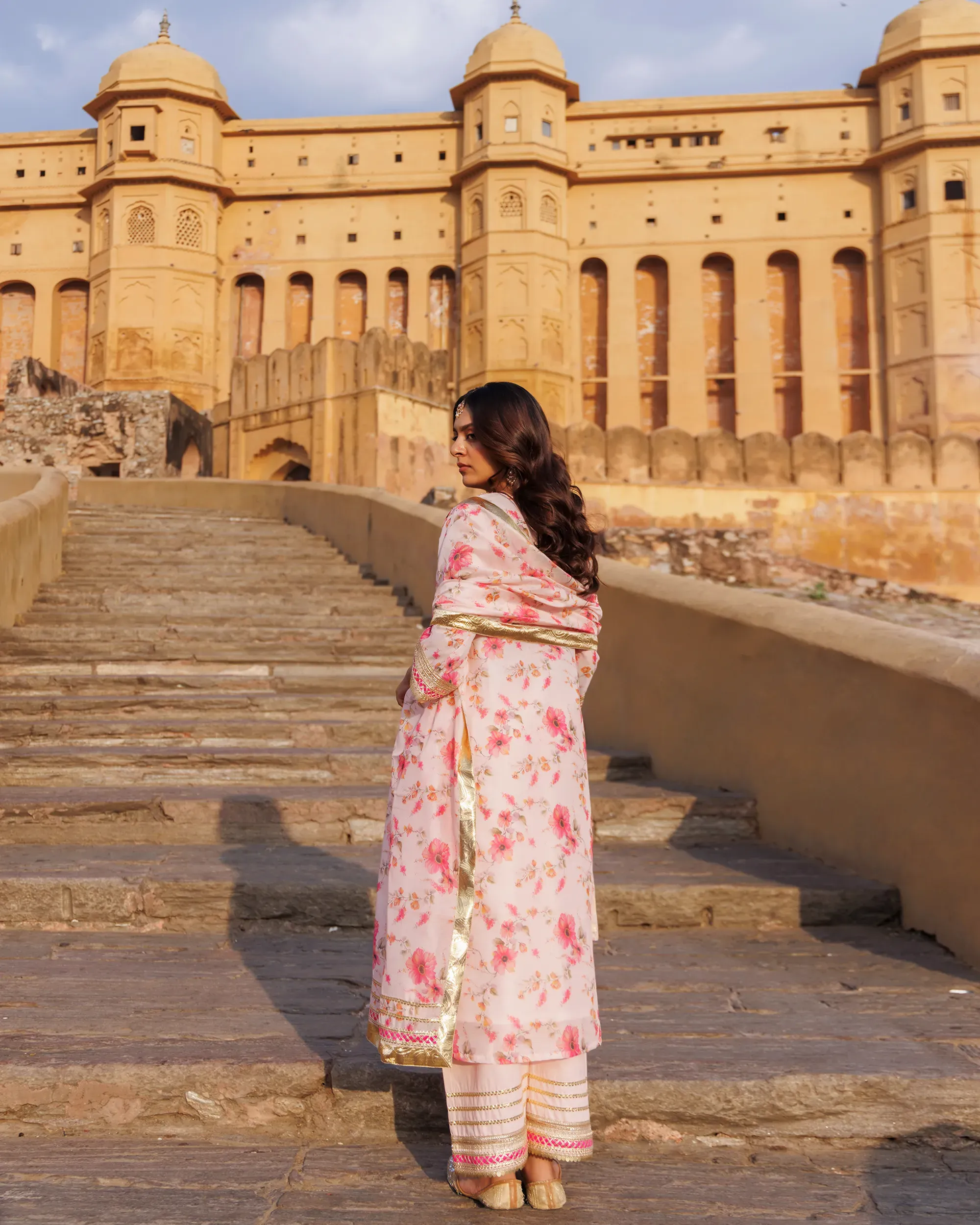 Pink Floral Printed Chanderi Kurta Set with Gota & Sequin Work