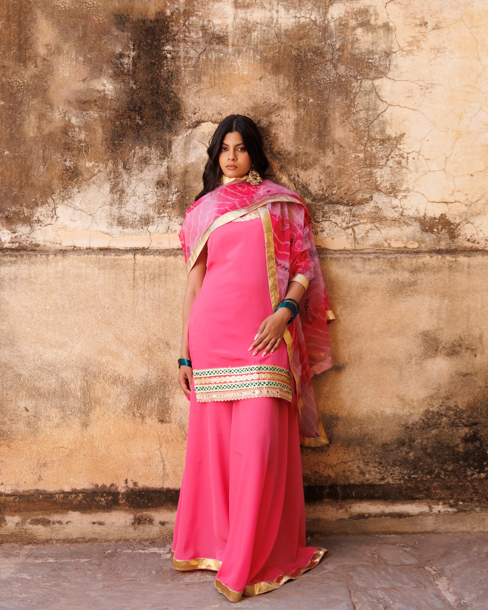 Pink Crepe Strappy Kurta Sharara Set with Bandhani Organza Dupatta