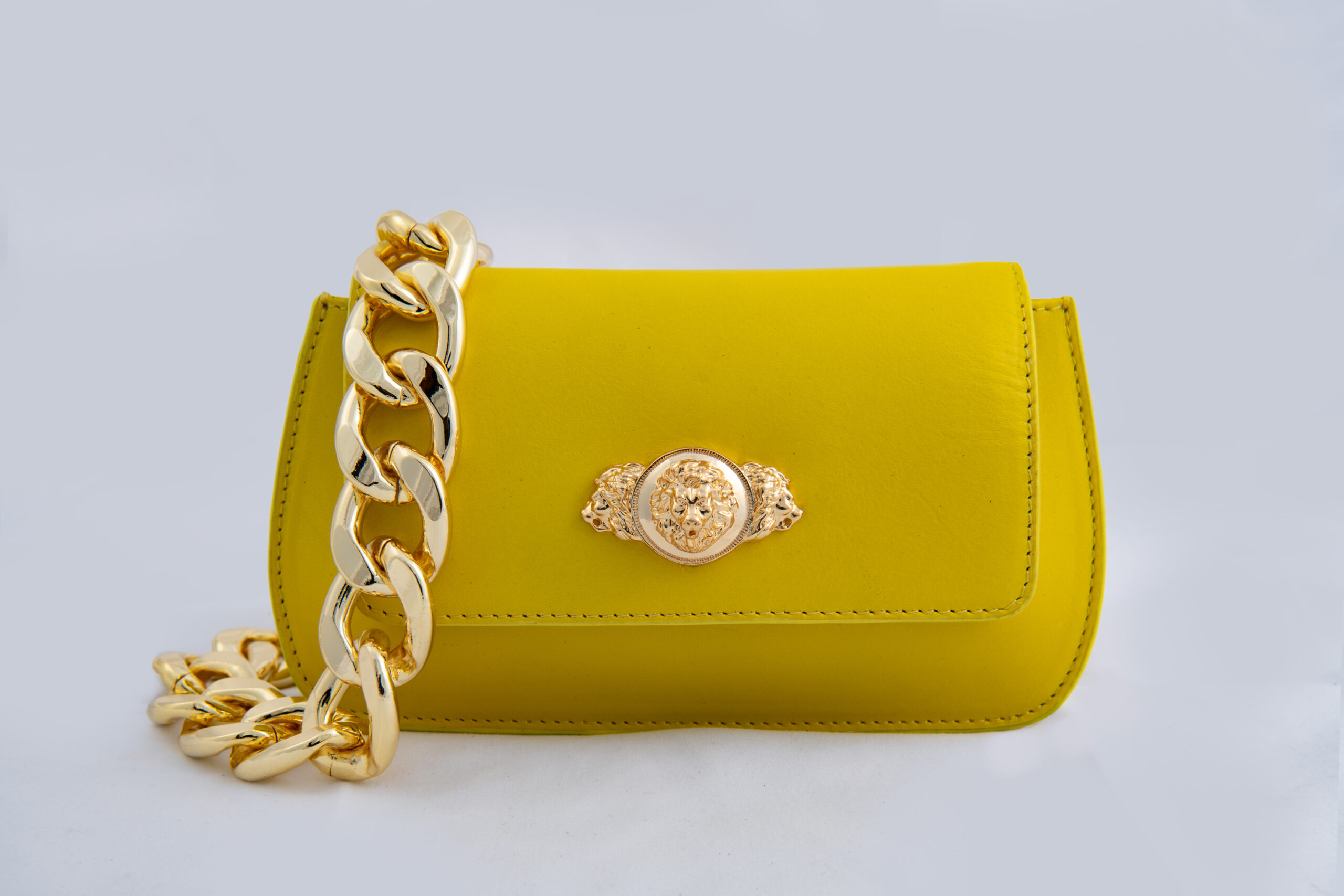 This luxurious bag redefines style. Crafted for the modern professional, this bag seamlessly blends functionality with timeless style. Experience radiant elegance with this Pop yellow genuine leather clutch with a curved structured shape, envelope flap & placement lion motif carved detailing. Comes with a detachable sling chain. A masterpiece of modern design, this accessory is sure to turn heads. It features metal embellishment, complemented by a metallic sling chain, and 24k gold plated fittings. The bag is secured with a magnet button.