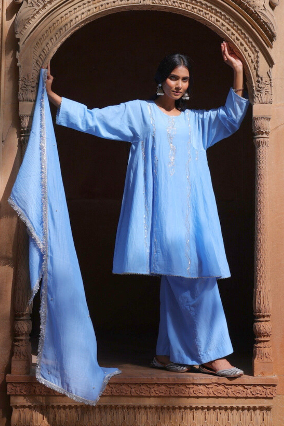 Introducing the powder blue mul chanderi three-piece palazzo kurta set – an elegant A-line Pakistani kalidar kurta crafted in breathable mul chanderi. The kurta features full sleeves and delicate tonal embroidery along the neckline and hem, paired with palazzo pants for a modern, relaxed silhouette. A matching dupatta with embroidered edges completes the ensemble, adding a subtle touch of sophistication. Perfectly blending traditional craftsmanship with contemporary ease, this set is ideal for festive daywear, semi-formal occasions, or intimate gatherings.
