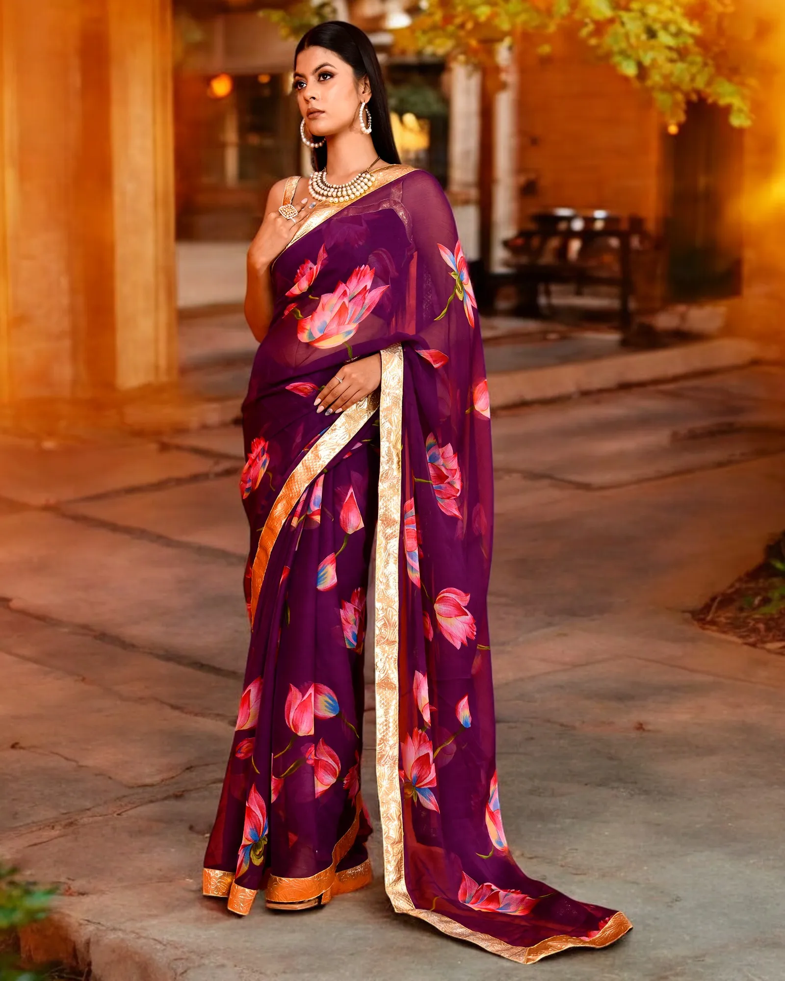 Purple Lotus Printed Chiffon Saree with Gota Detail Blouse