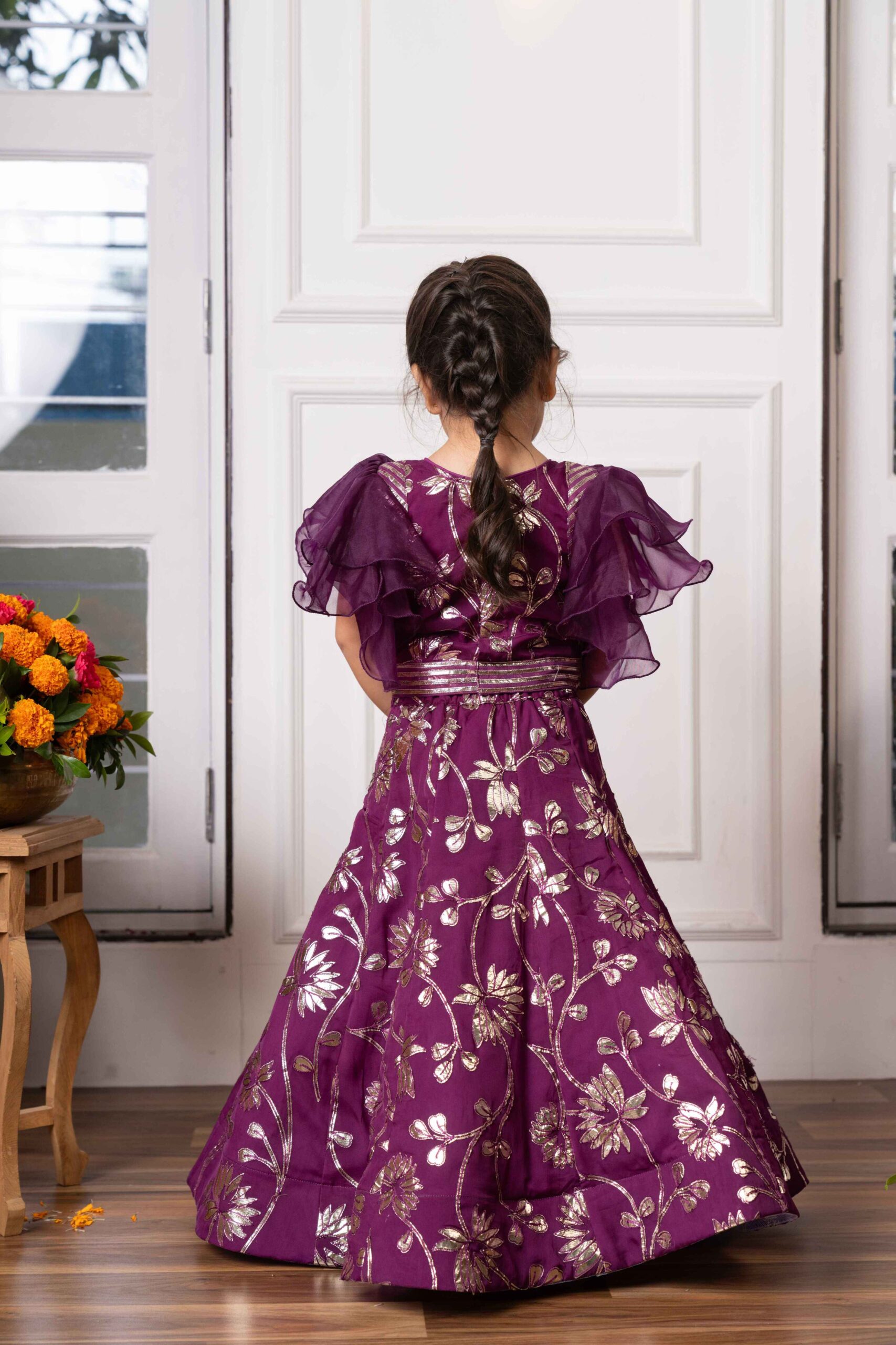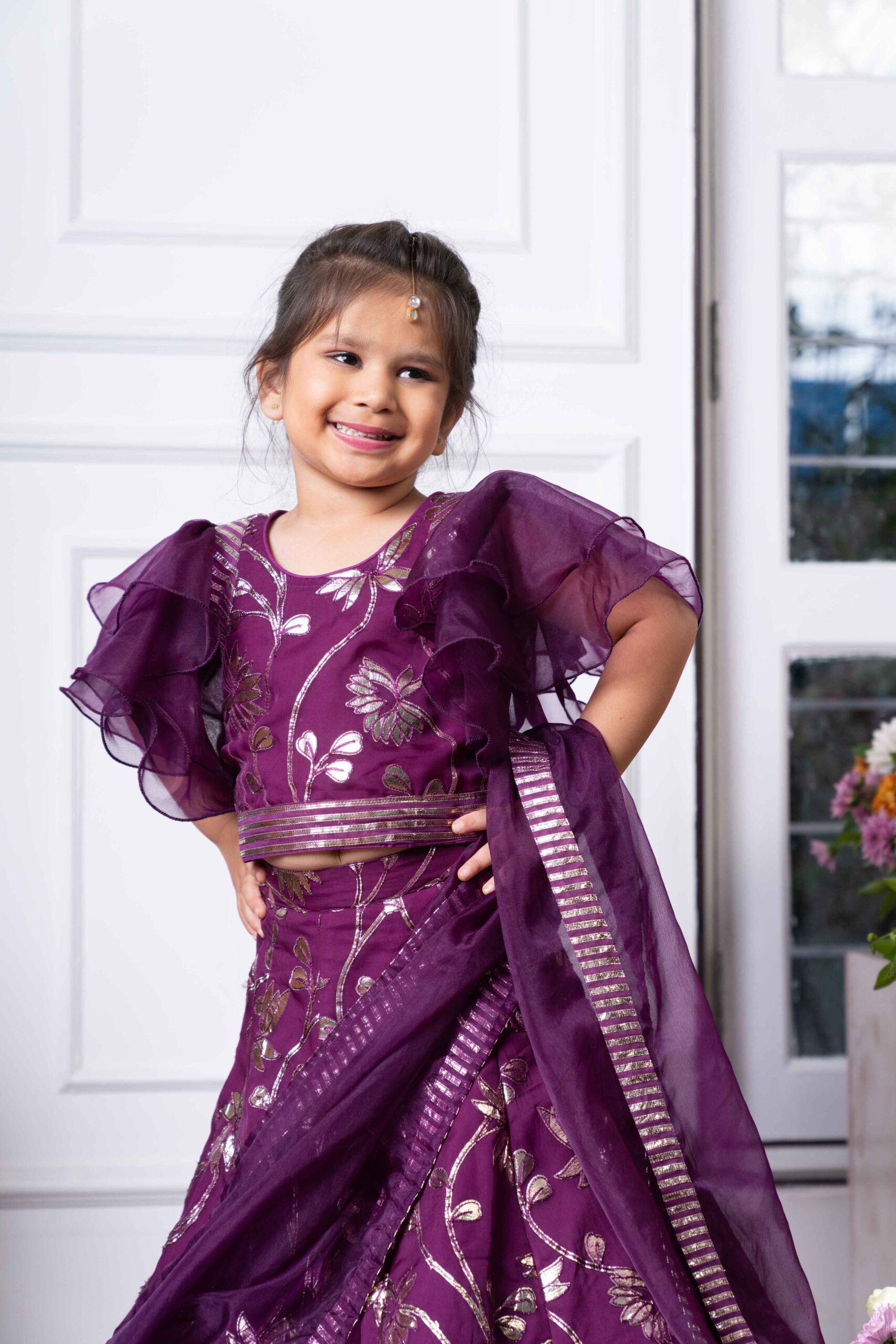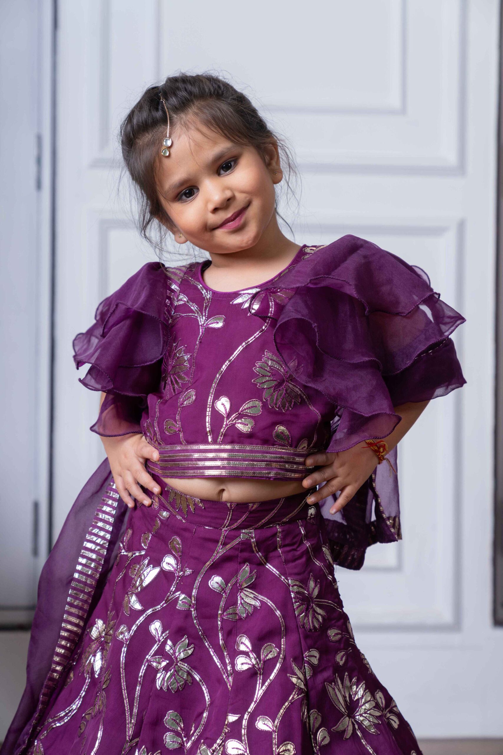 Presenting a purple organza lehenga set for girls, featuring a purple crop blouse with intricate gold floral gota embroidery, creating a regal and festive look. The dramatic layered ruffle sleeves add volume and elegance to the design, making it a standout piece for any special occasion. Paired with a matching purple lehenga and dupatta, adorned with the same gold floral gota embroidery, this set ensures a coordinated and sophisticated appearance. The lehenga features a voluminous silhouette with can-can lining for added structure and flow, creating a princess-like effect. The comfort-fit waistband ensures ease of movement, making it ideal for weddings, engagement parties, festive celebrations, and other special occasions.