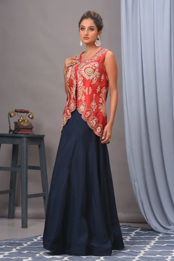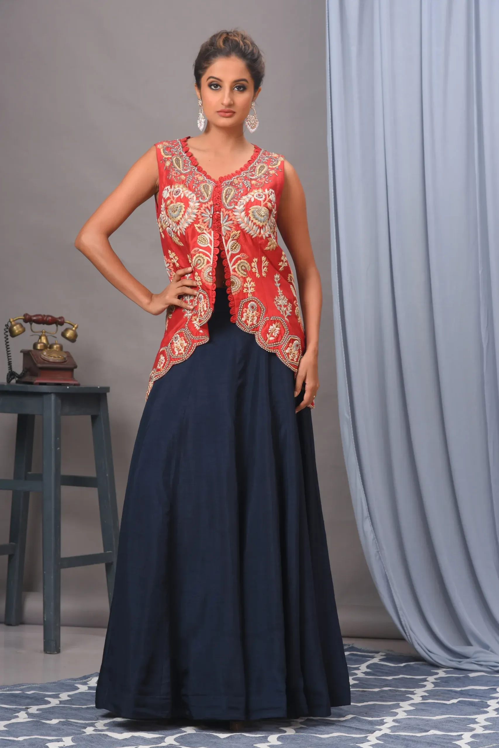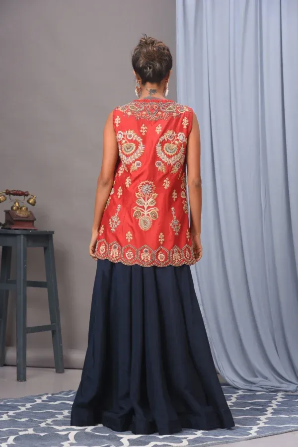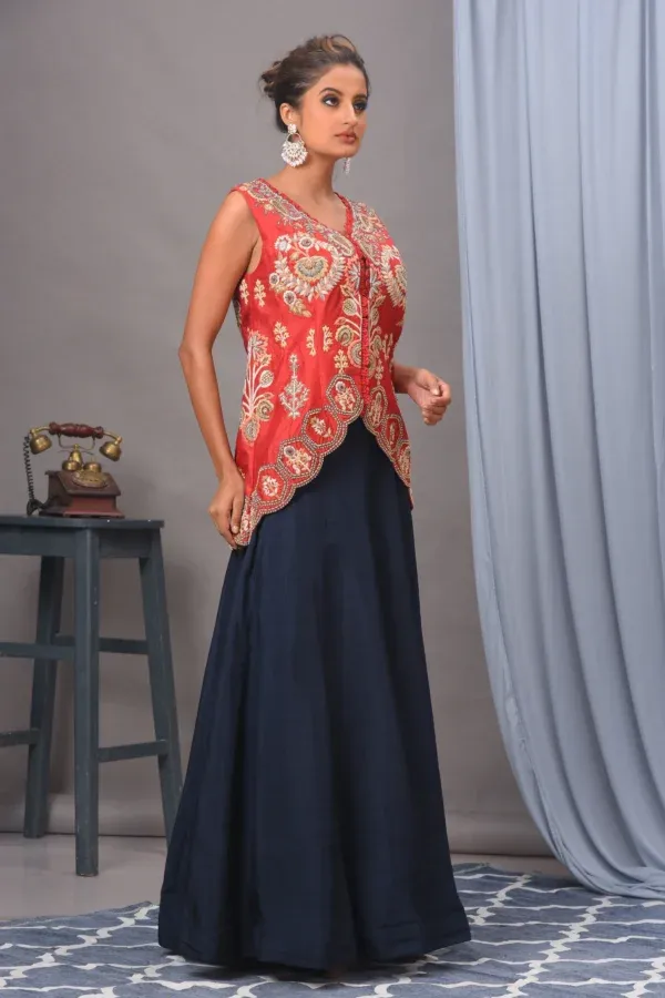 Presenting this stunning heavy intricate all over embroidered jacket in red Bamberg silk paired with navy Bamberg silk skirt creating a visually appealing design.