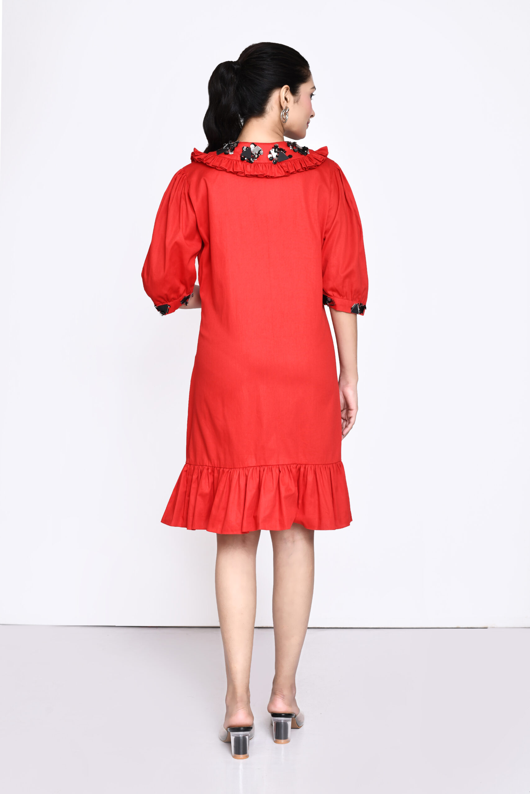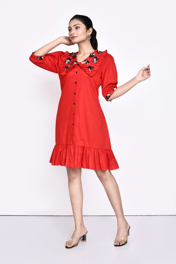 Jaanvi Mohta presents an eye-catching red cotton dress, featuring a contemporary twist with stylish embellishments on the oversized collar and sleeve hems. Crafted from soft, breathable cotton, this dress combines comfort and flair for any occasion. Perfect for making a statement.