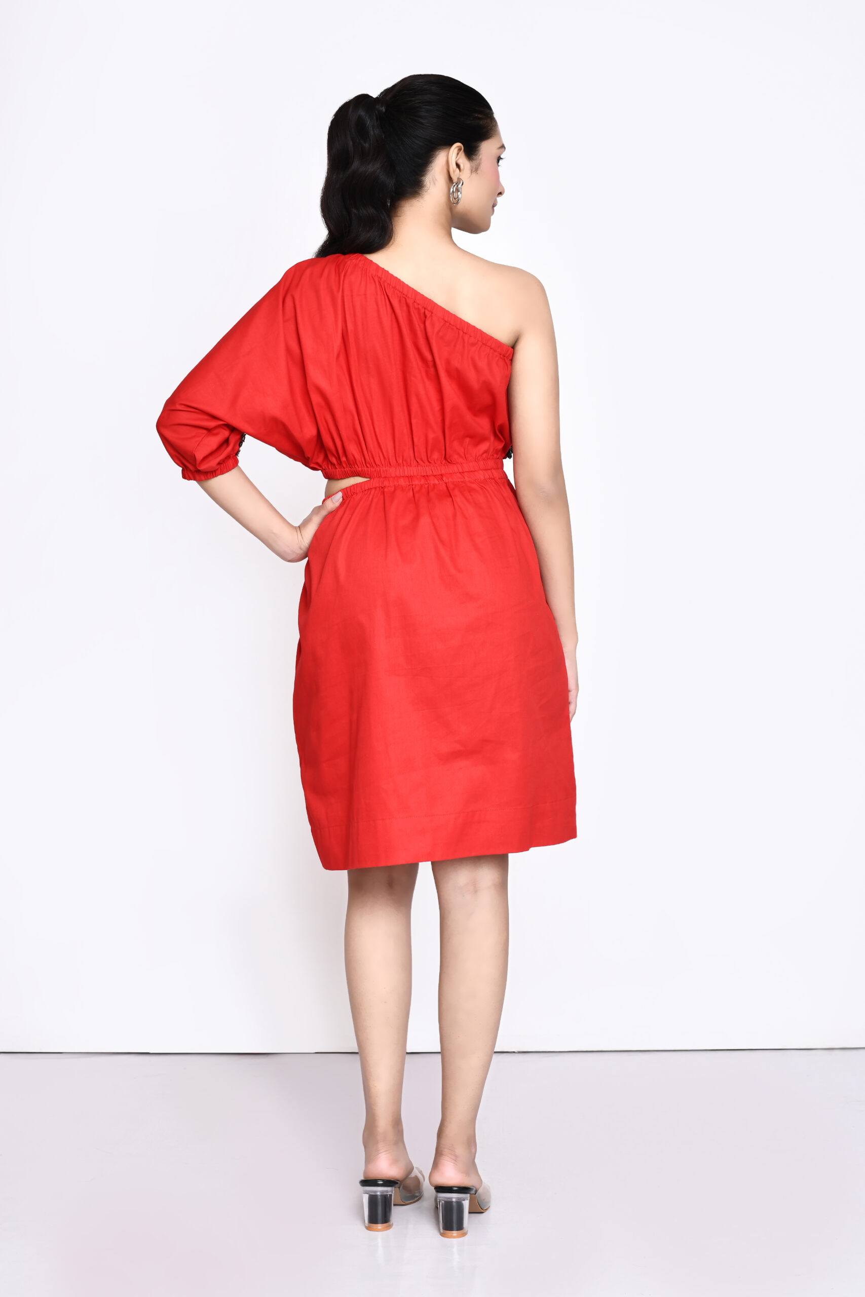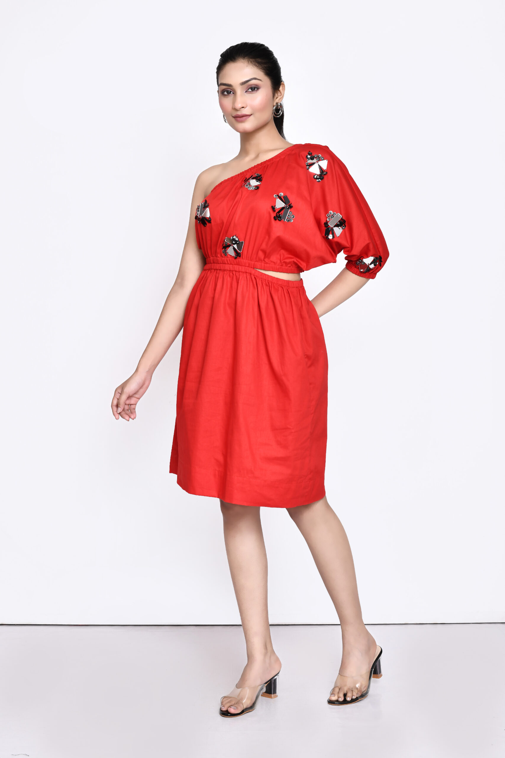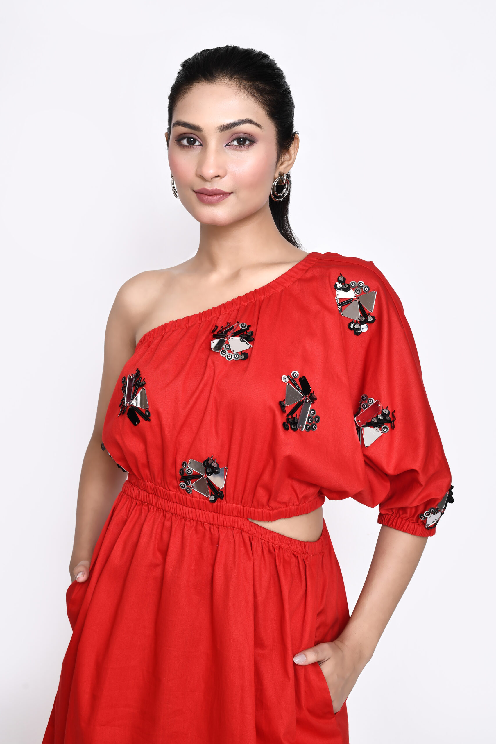 Jaanvi Mohta introduces a stunning red cotton satin one-shoulder dress, featuring bold chunky embellishments that add a touch of glamour. The stylish cut-out elasticated waist not only enhances your silhouette but also ensures a comfortable fit. This dress is perfect for making a statement at any event, combining sophistication with a modern edge.