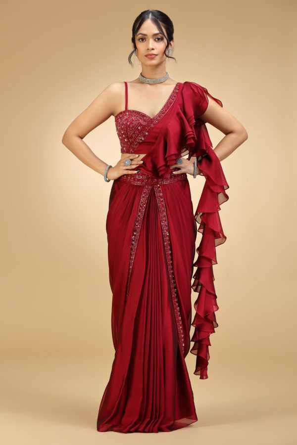 Introducing our red poly silk embroidered pre-draped saree, designed to deliver effortless elegance with a modern festive touch. The ensemble features a red poly silk blouse embellished with intricate embroidery and a stylish neckline that adds refined charm. It is paired with a coordinated red poly silk pre-draped saree, highlighted with subtle embroidered detailing that enhances its graceful silhouette. Perfect for weddings, receptions, cocktail nights, and festive celebrations where contemporary style meets traditional glamour.