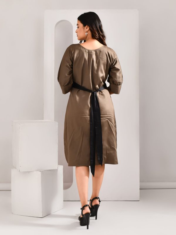 Introducing our relaxed-fit khaki brown dress, crafted in comfortable blended cotton that combines ease with everyday elegance. Designed with a sleek belted corset-style patchwork detail, it beautifully accentuates the waist while adding a modern edge. The softly gathered sleeves lend volume and fluidity, while the rich contrast on the yoke adds a refined finishing touch.