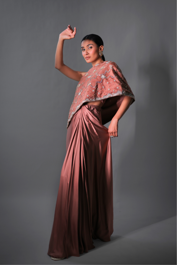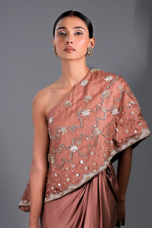 Introducing rosy brown three-piece cape set in luxurious modal silk. The set features a one-shoulder embroidered cape paired with a beautifully structured bustier, both embellished with intricate floral motifs and delicate sequin beading for a subtle shimmer. Completing the look, a gracefully draped skirt flows effortlessly, creating a refined and fluid silhouette. Ideal for festive occasions and evening gatherings, this ensemble embodies contemporary elegance with an artisanal touch.