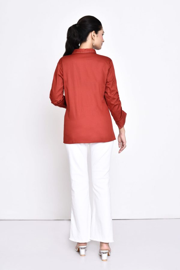 Introducing rust cotton embellished shirt, a perfect blend of style and sophistication. This shirt features a flap pocket and ruched three-quarter sleeves that lend a touch of elegance to the overall design.