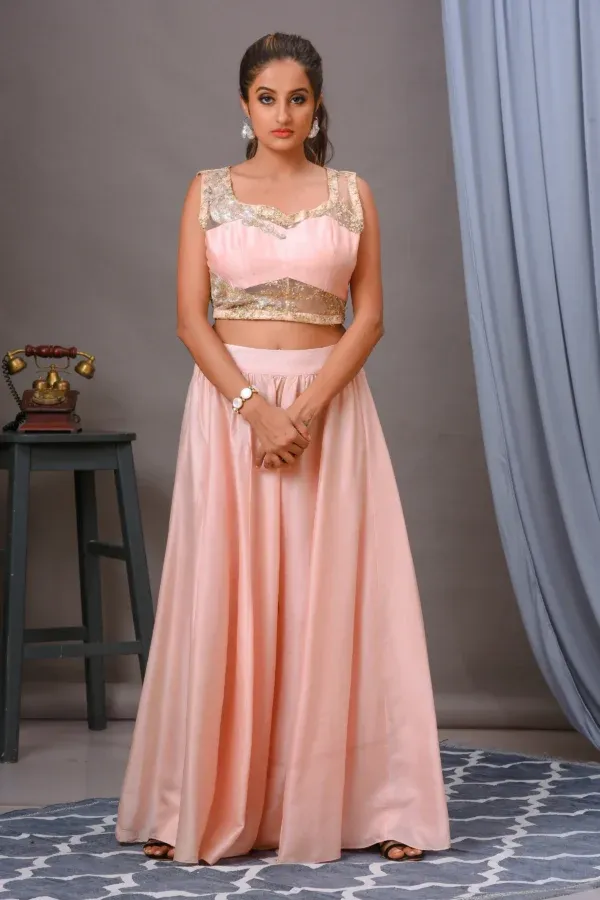 Elevate your ethnic style with this gorgeous salmon pink lehenga set. Featuring an organza lehenga, an embroidered Bamberg silk blouse, and an intricately embroidered salmon pink organza dupatta with scalloped edges.