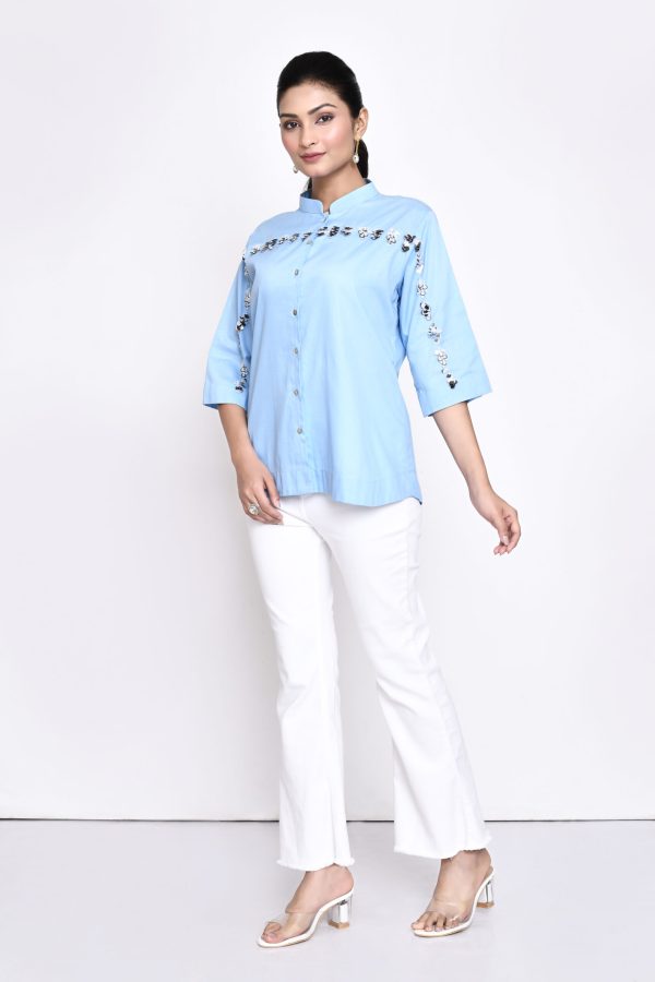 Jaanvi Mohta presents sky blue cotton embellished shirt, designed to infuse a light and vibrant vibe into your outfits. Featuring sophisticated three-quarter sleeves, adds a touch of elegance. Made from soft, breathable cotton, this shirt promises comfort for any occasion.