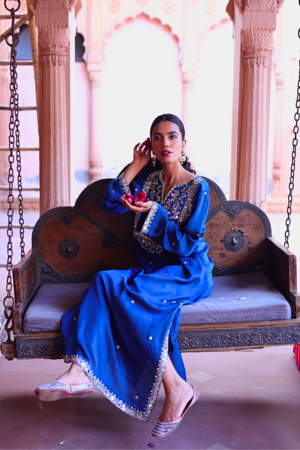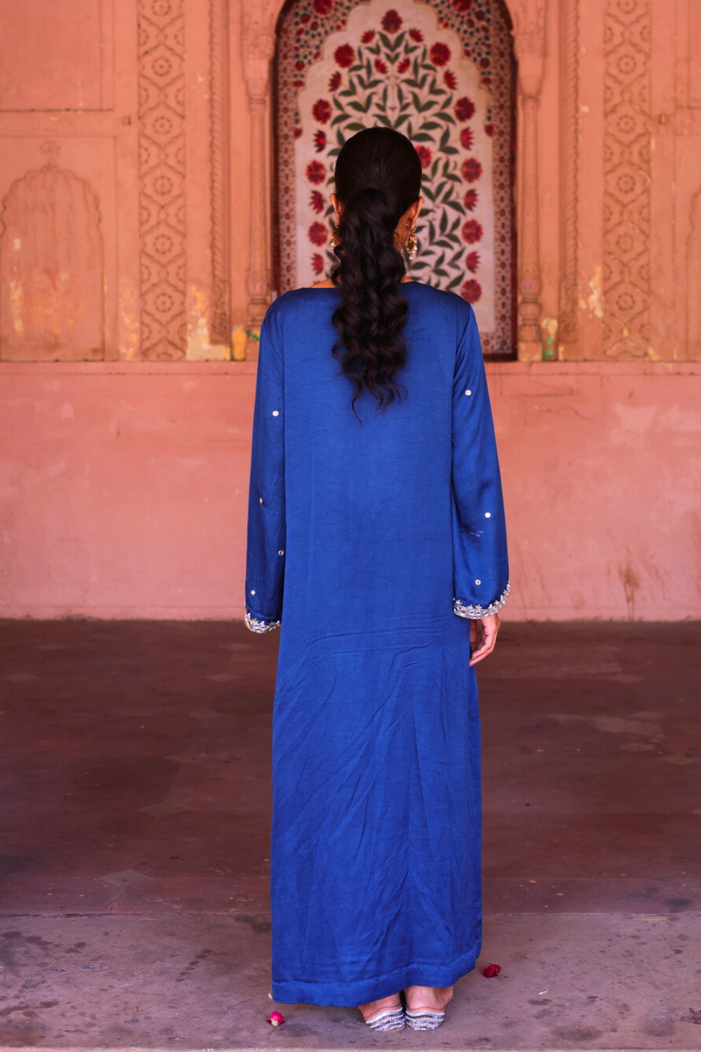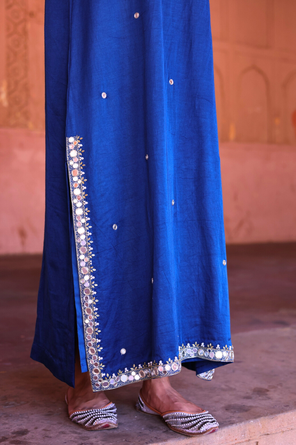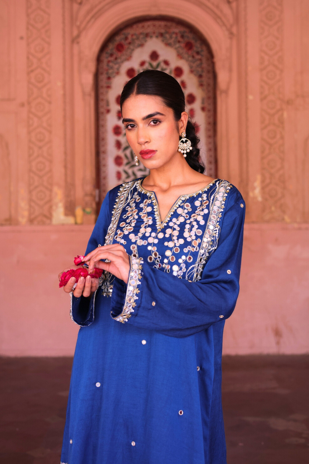 Introducing teal blue long kurta, designed with a split V-neckline and an intricately embellished yoke featuring delicate mirror work and fine embroidery. Subtle detailing flows gracefully down the length and sleeve cuffs, while matching straight-cut pants complete the look with refined simplicity. This ensemble exudes effortless sophistication and timeless allure.