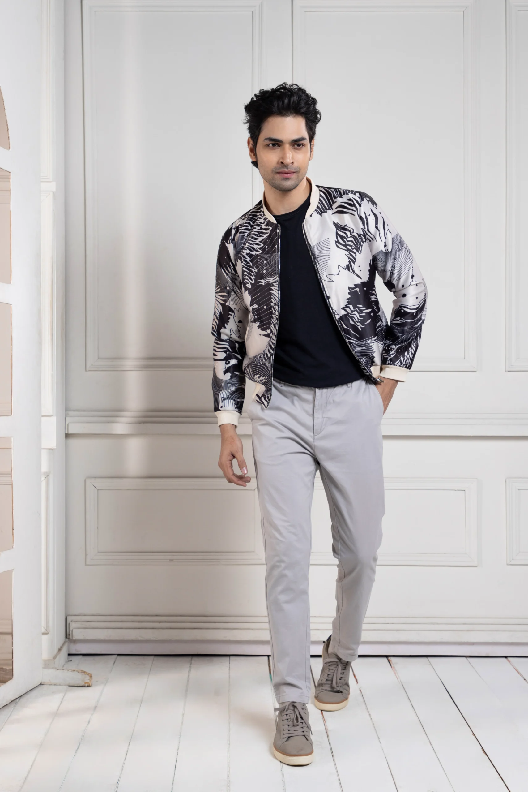 Introducing the Urban Monochromatic Bomber Jacket, a bold fusion of contemporary art and classic streetwear. Showcasing a striking grayscale floral and abstract print, it features a tailored silhouette, clean zip-front closure, and premium ribbed cuffs and collar. Crafted from lightweight fabric, this versatile jacket offers refined style for both casual and elevated occasions.