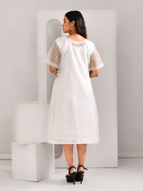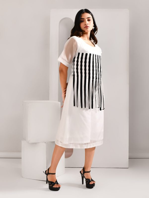 Introducing our white blended cotton and organza dress, crafted in soft, lightweight fabric that combines comfort with sophistication. Inspired by a modern checker pattern, this striking outfit features meticulously layered black striped fabric that creates depth and dimension. The sheer organza overlay adds an elegant, contemporary touch — making this dress a perfect blend of structure, grace, and statement-making style.