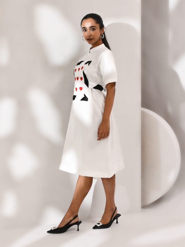 Introducing our white cotton organza dress, a dreamy blend of innocence and edge. This layered creation features sheer white organza over a soft cotton base, offering the perfect balance of comfort and couture. Delicate heart embroidery adds a touch of whimsy, while bold black-and-white stripes introduce a striking contrast that defines its modern charm. Perfect for daytime affairs, creative showcases, or moments that call for quiet charm with a twist.