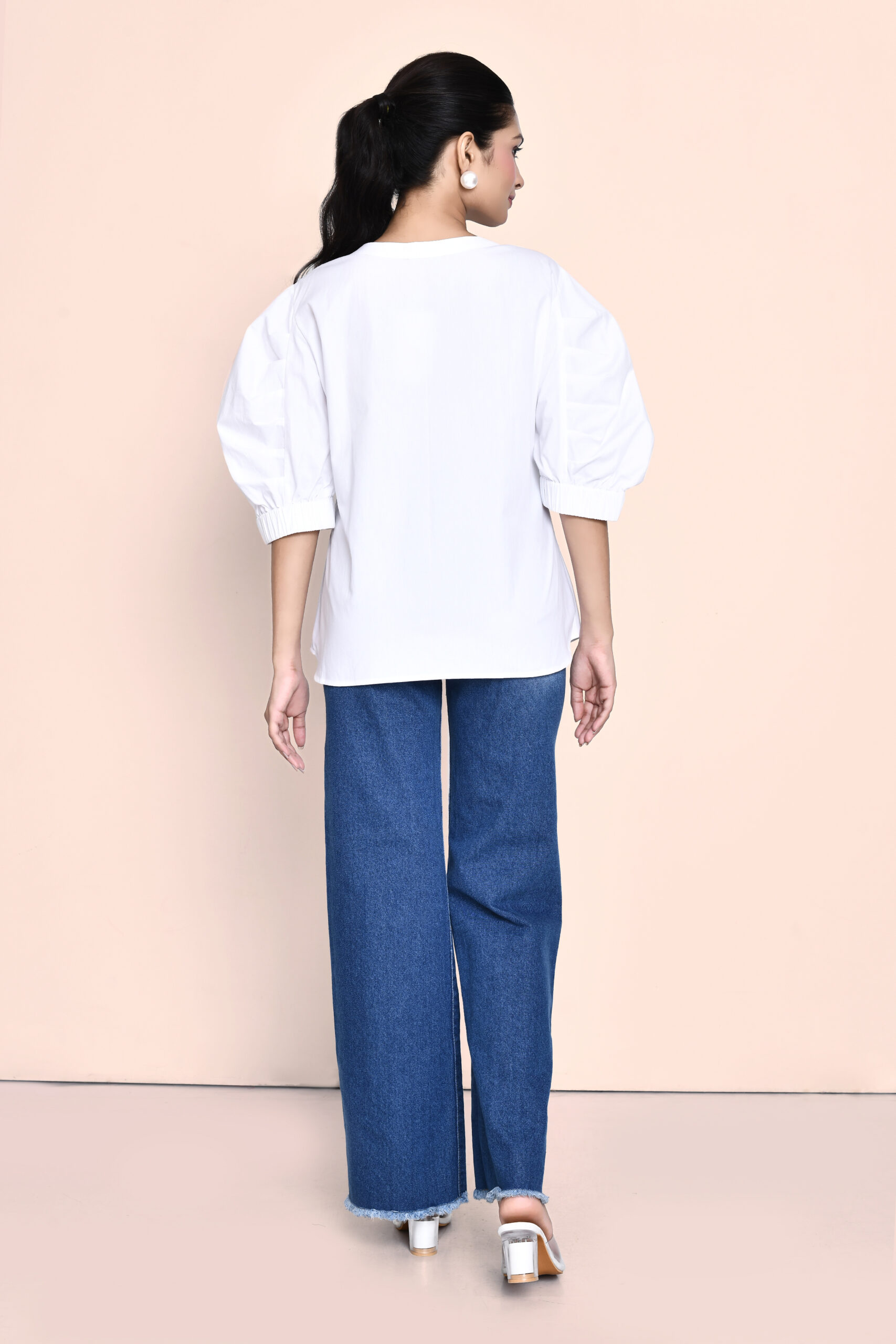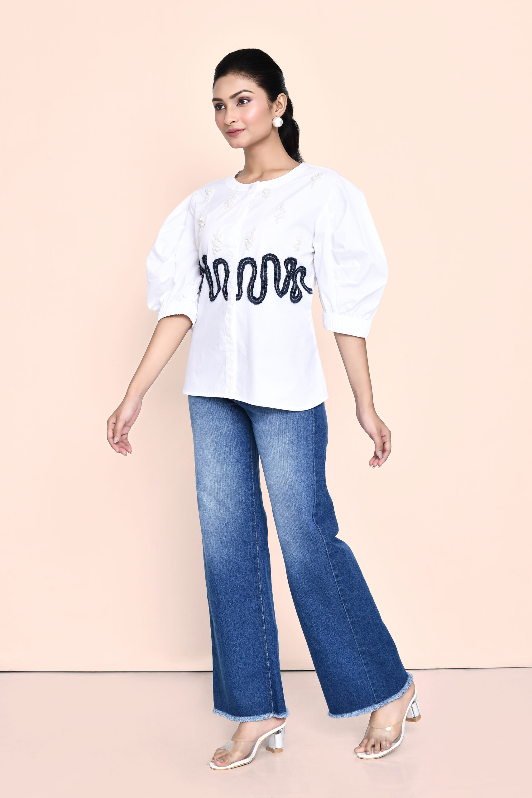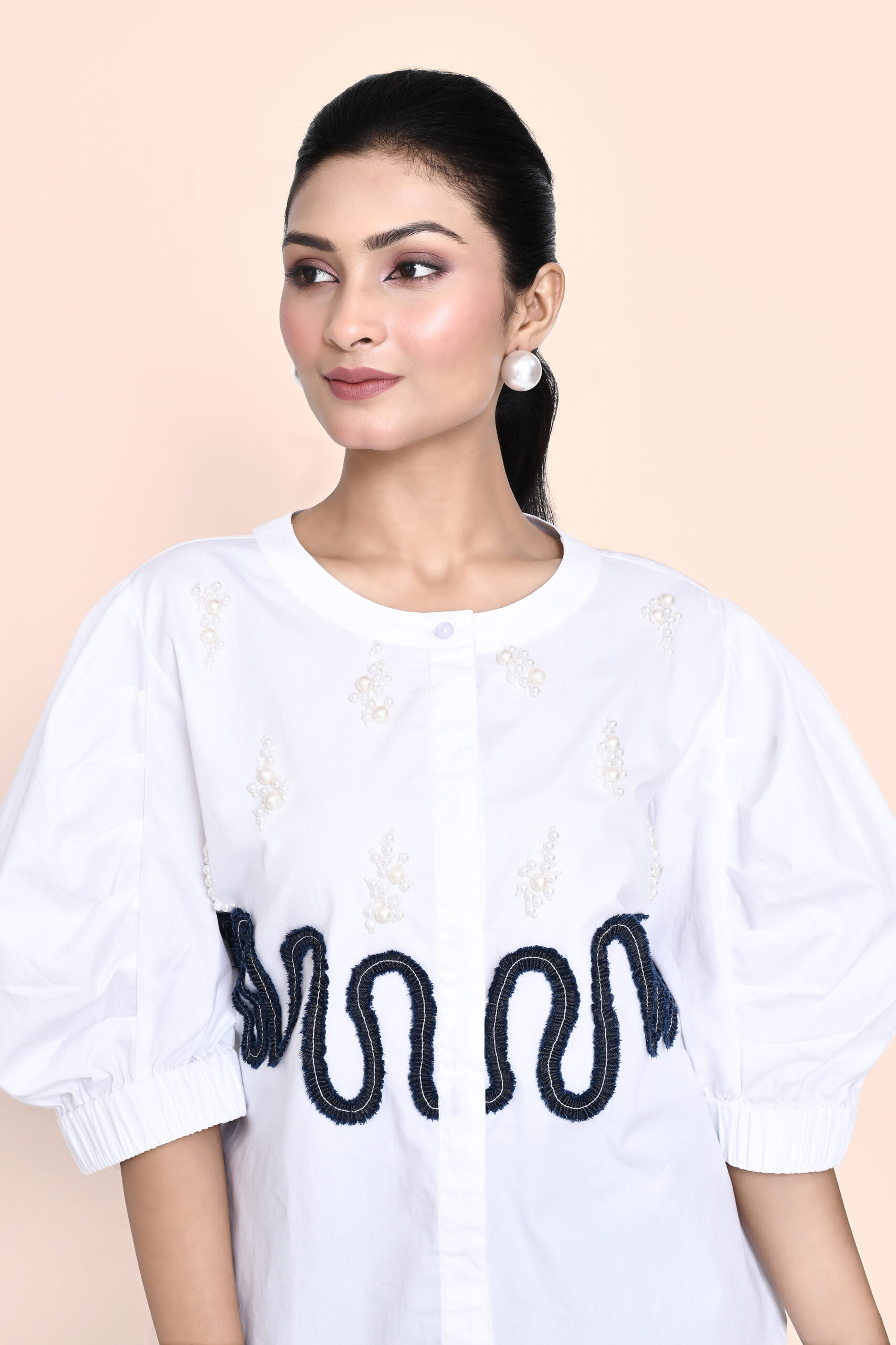 Presenting an elegant white poplin shirt, beautifully adorned with denim and pearl embellishments that add a touch of sophistication. Featuring stylishly designed sleeves, this shirt effortlessly combines classic charm with modern flair, making it a versatile addition to your wardrobe.