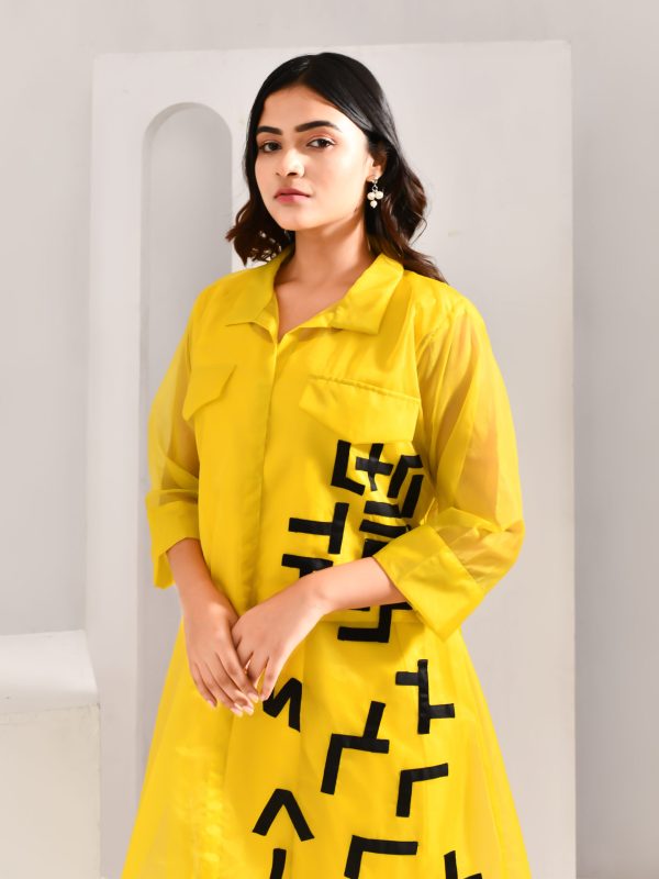 This elevated yellow and black blended cotton co-ord set a trend with the sheer organza outer, with patchwork detailing, pocket style yoke and asymmetric hemline, perfectly complimenting colour blocked pants and a breathable inner for that added layered glam. This set in its radiating and refreshing lime colour is perfect for casual outing with friends or workwear with a fashionable twist.