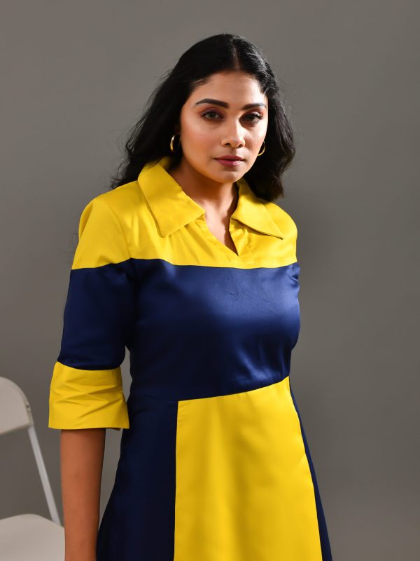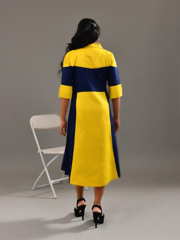 A vibrant day to night look , made in the most comfortable breathable fabric for your perfect summer escape. Accentuated with our statement yellow and dark blue colored blended cotton dress blocking , to create illusions that enriches the silhouette of the body.
