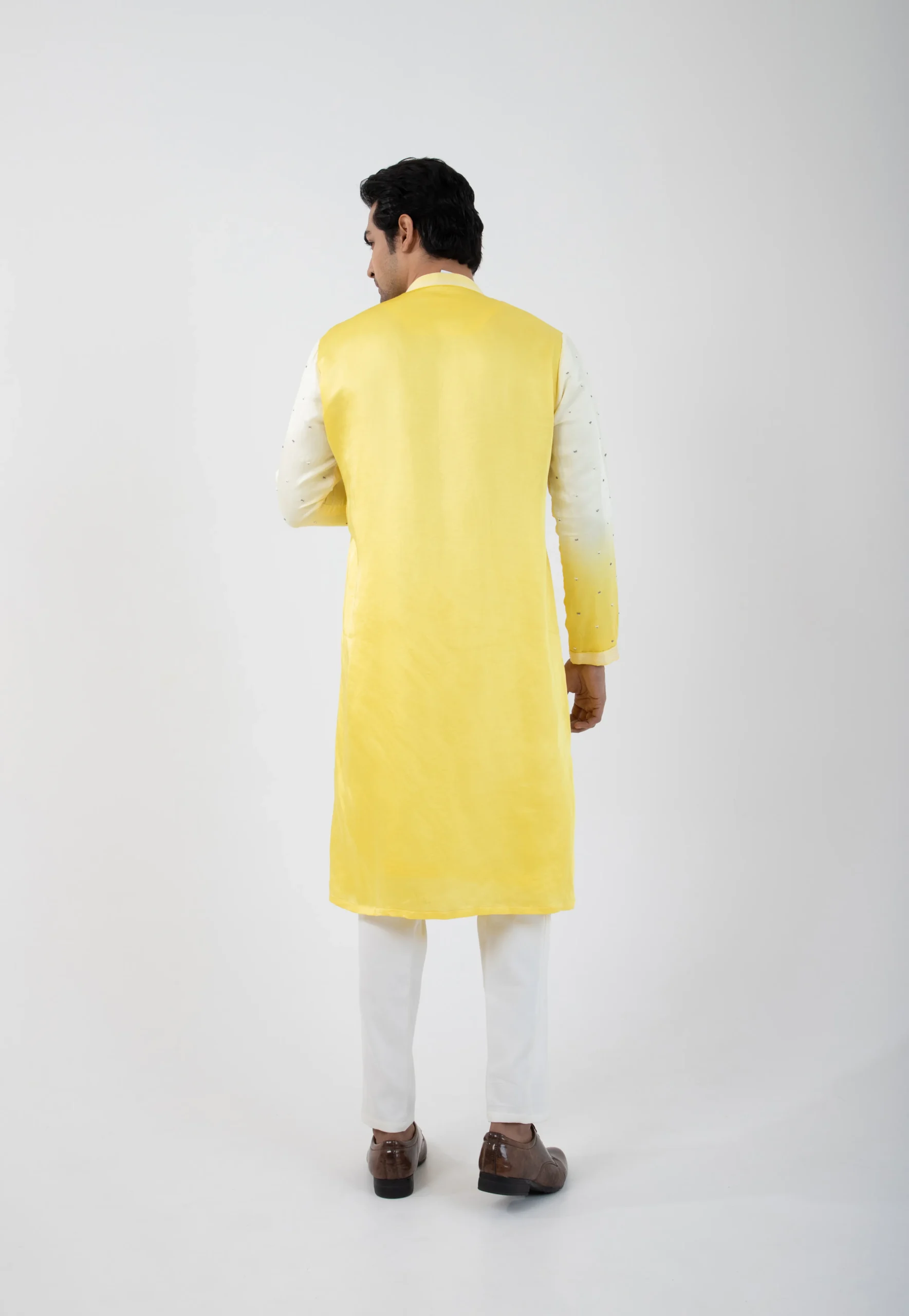 Introducing yellow and white embroidered nehru jacket with kurta set. The nehru jacket is based in linen satin that features a seamless ivory-to-yellow gradient, enriched with intricate threadwork and delicate sequin detailing. Crafted with a sleek mandarin collar and a structured fit. The set includes a sleek kurta in silk mulmul with embroidery details and ombre effect paired with crisp white cotton trousers. Perfect for haldi ceremonies or festive celebrations where you want to radiate elegance and style.