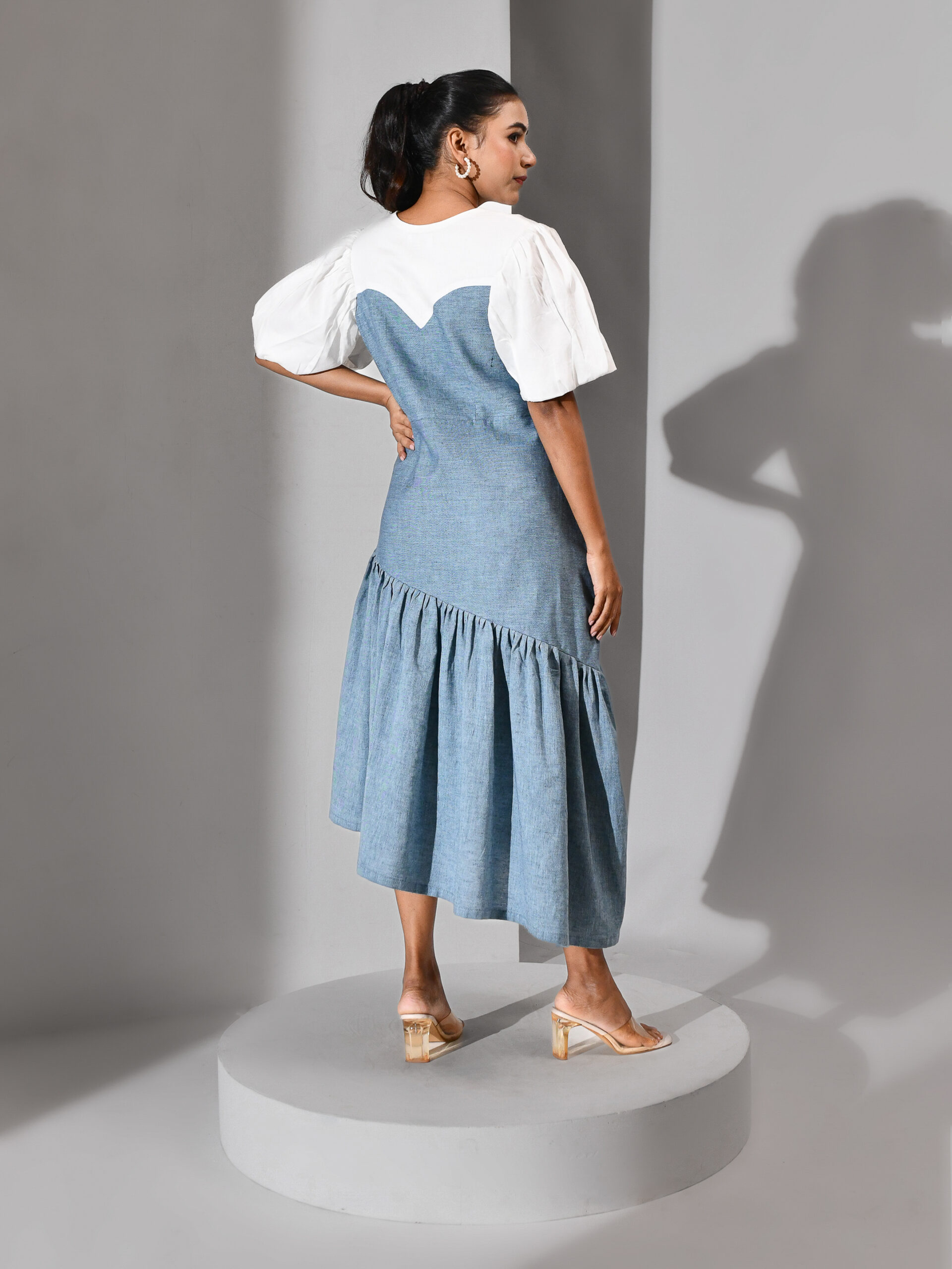 Denim Blue & White Cotton Dress With Balloon Sleeves