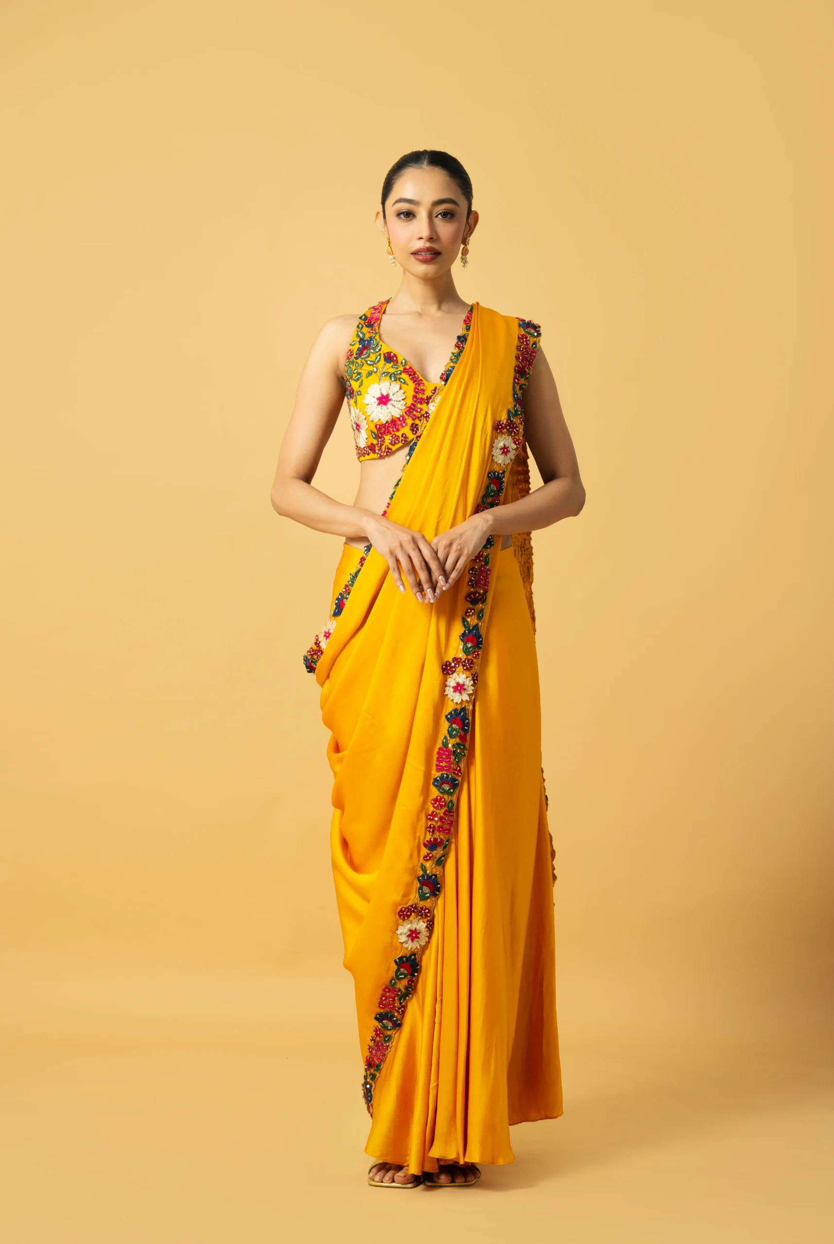 Introducing our radiant Golden Yellow Modal Satin Saree, designed to make a vibrant and contemporary statement. Crafted in smooth modal satin, this saree drapes beautifully, enhancing its elegant silhouette. The blouse and saree edge are adorned with striking multi-coloured 3D hand embroidery, adding depth, texture, and artistic flair. Perfect for festive occasions, weddings, and special celebrations, this ensemble blends bold detailing with refined sophistication for a standout look.