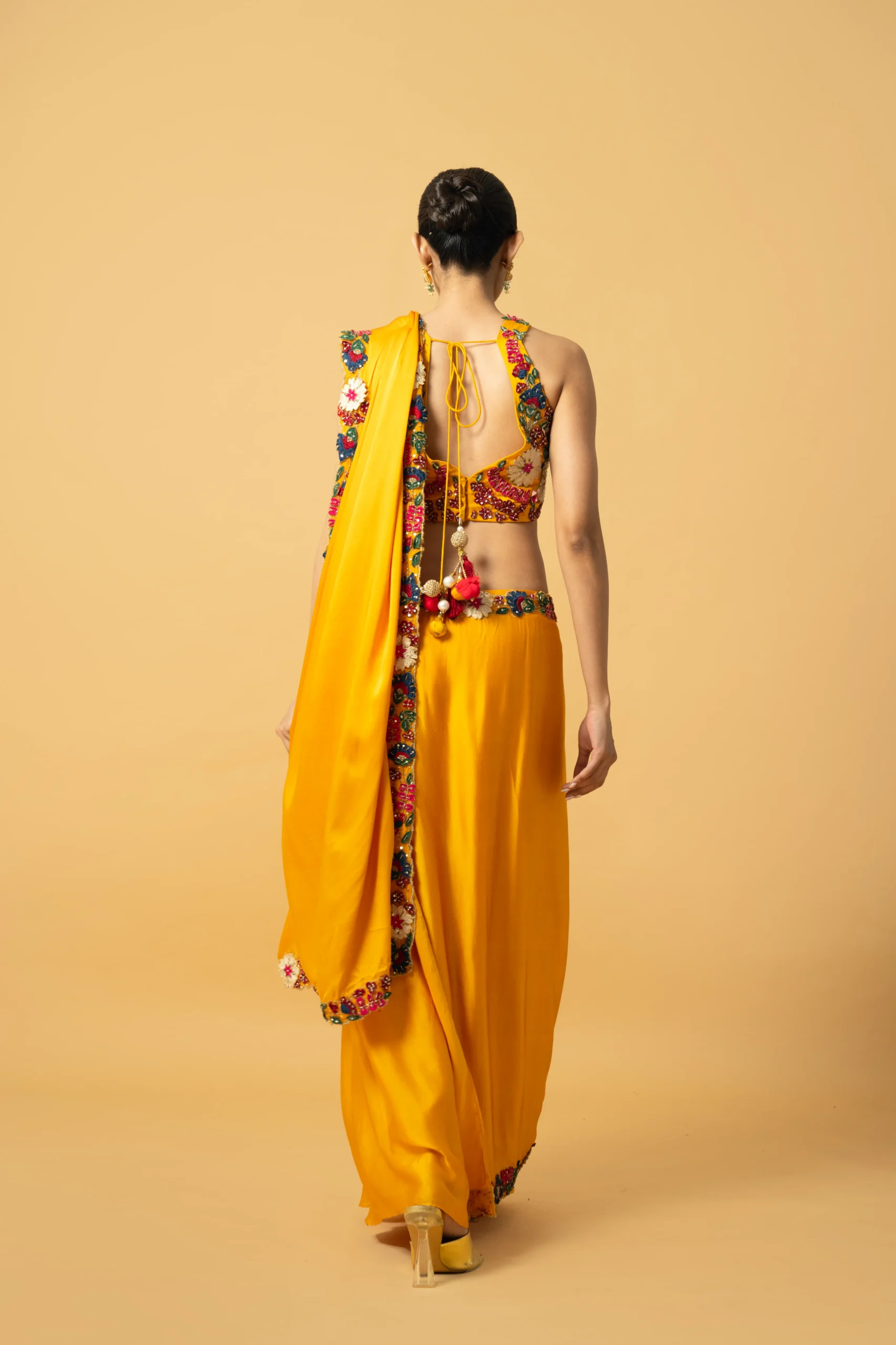 Enhance this vibrant saree with statement multi-stone or kundan earrings to complement the 3D embroidery. Pair it with metallic gold or nude heels for an elegant finish. Complete the look with a chic clutch for festive celebrations and wedding events.