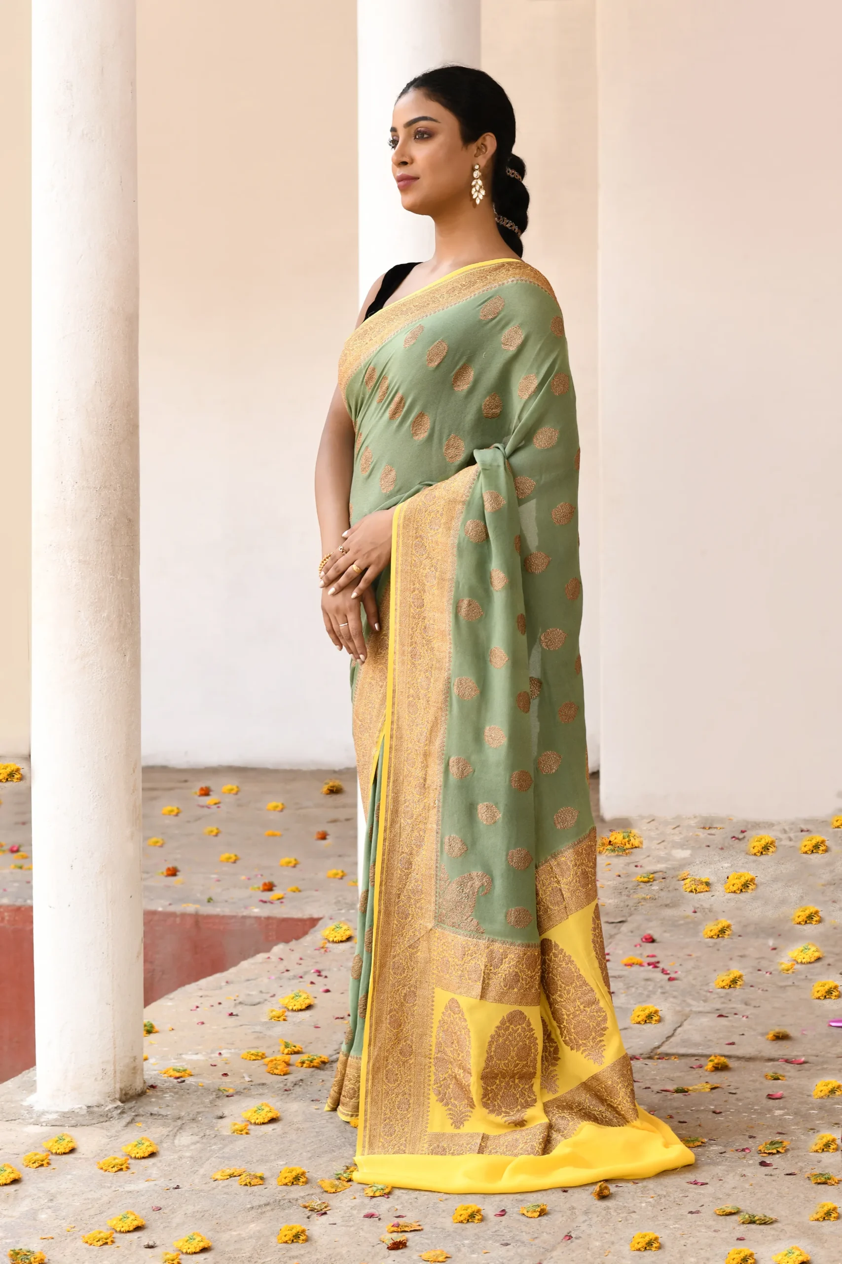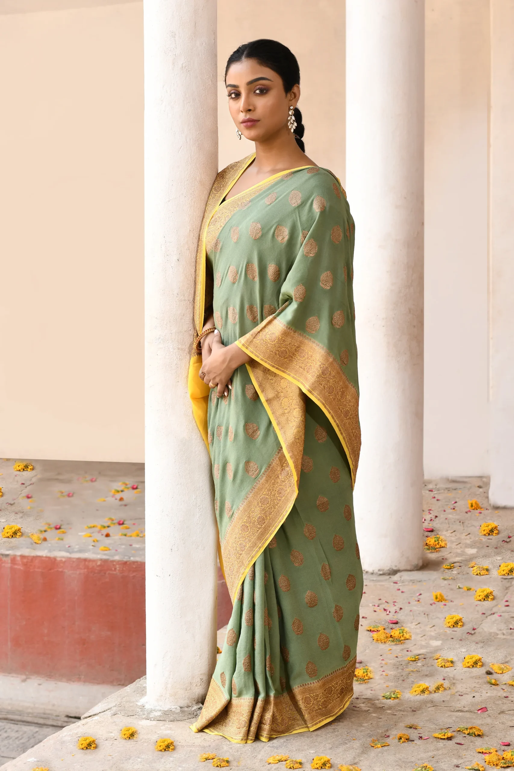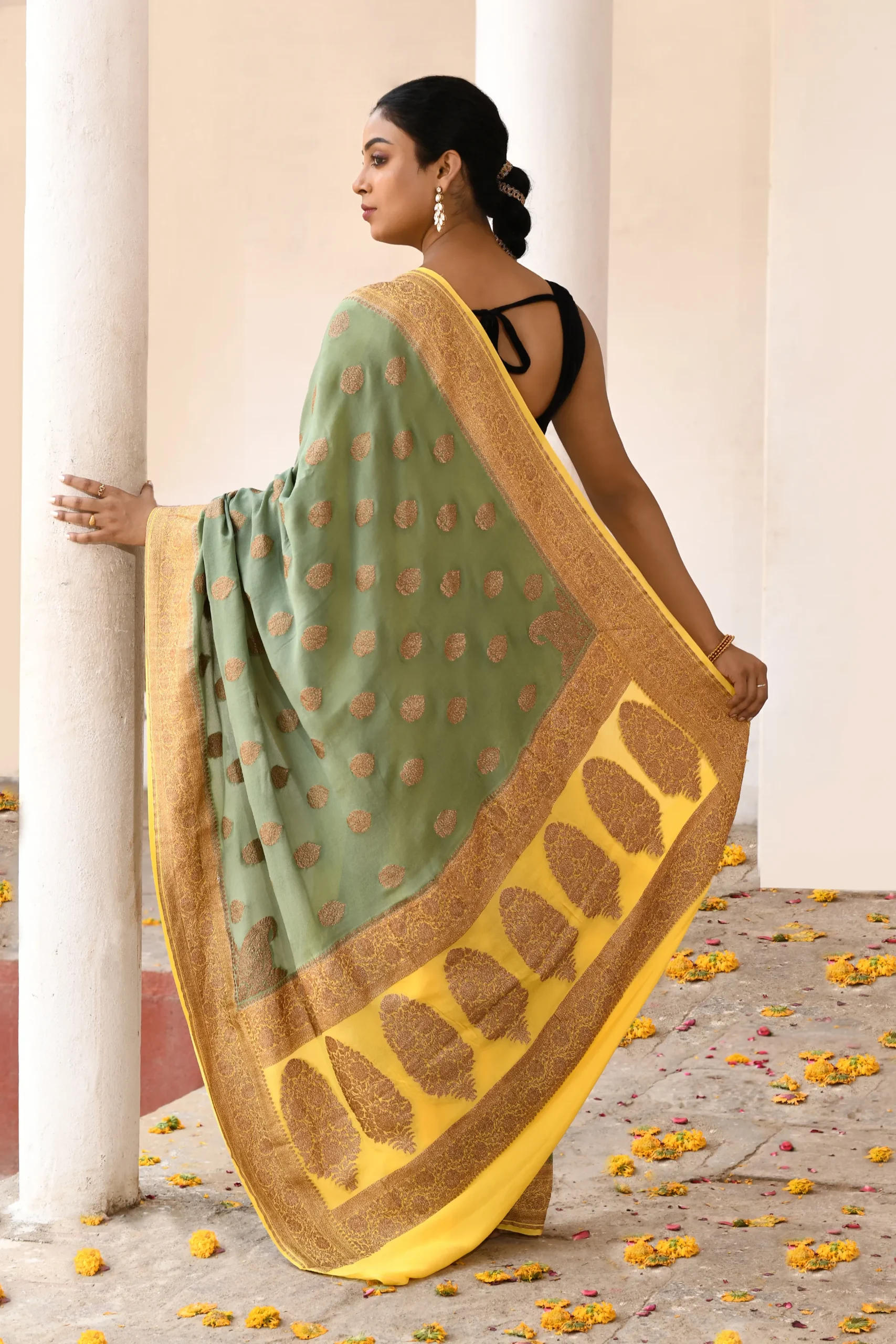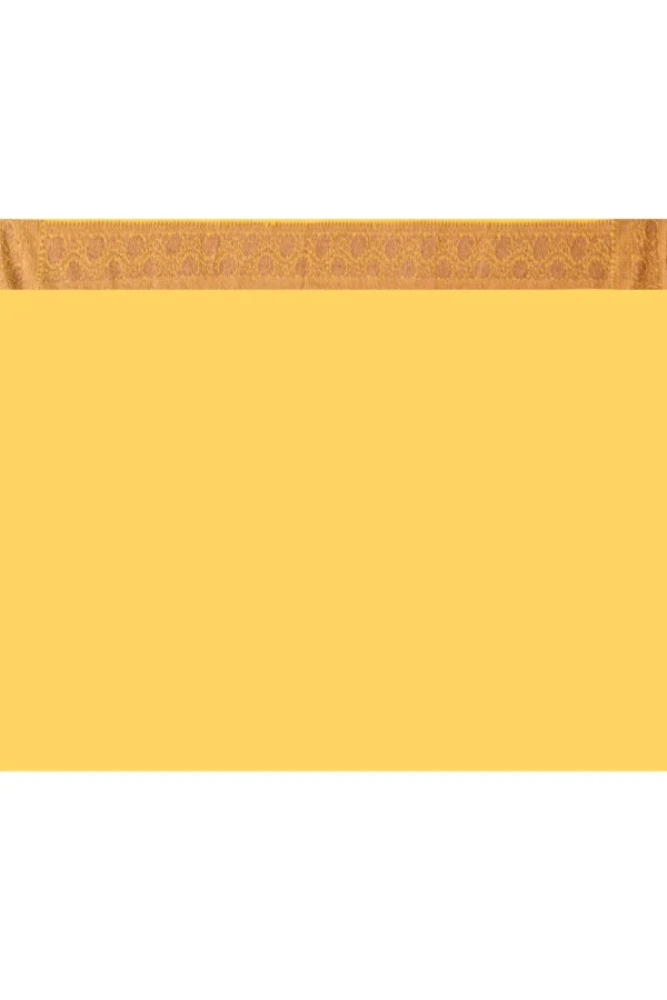 Introducing our handwoven Pure Banarasi Crape Chiffon silk saree, originally crafted in Kashi. This Grass Green masterpiece features beautifully woven gold zari motif butas across the body. Complemented by a traditional contrast Yellow border and palla, it blends heritage artistry with a regal, professional finish.