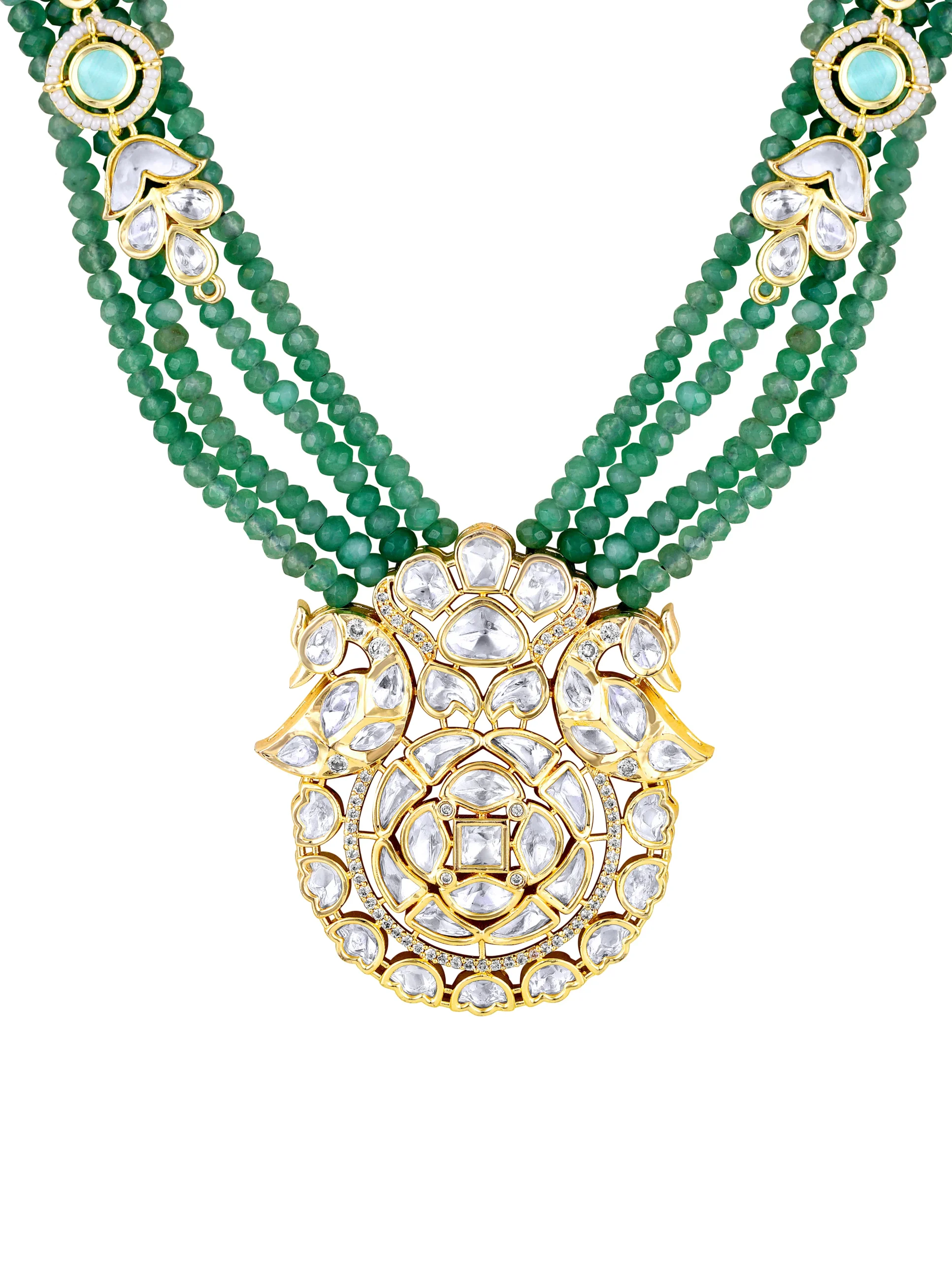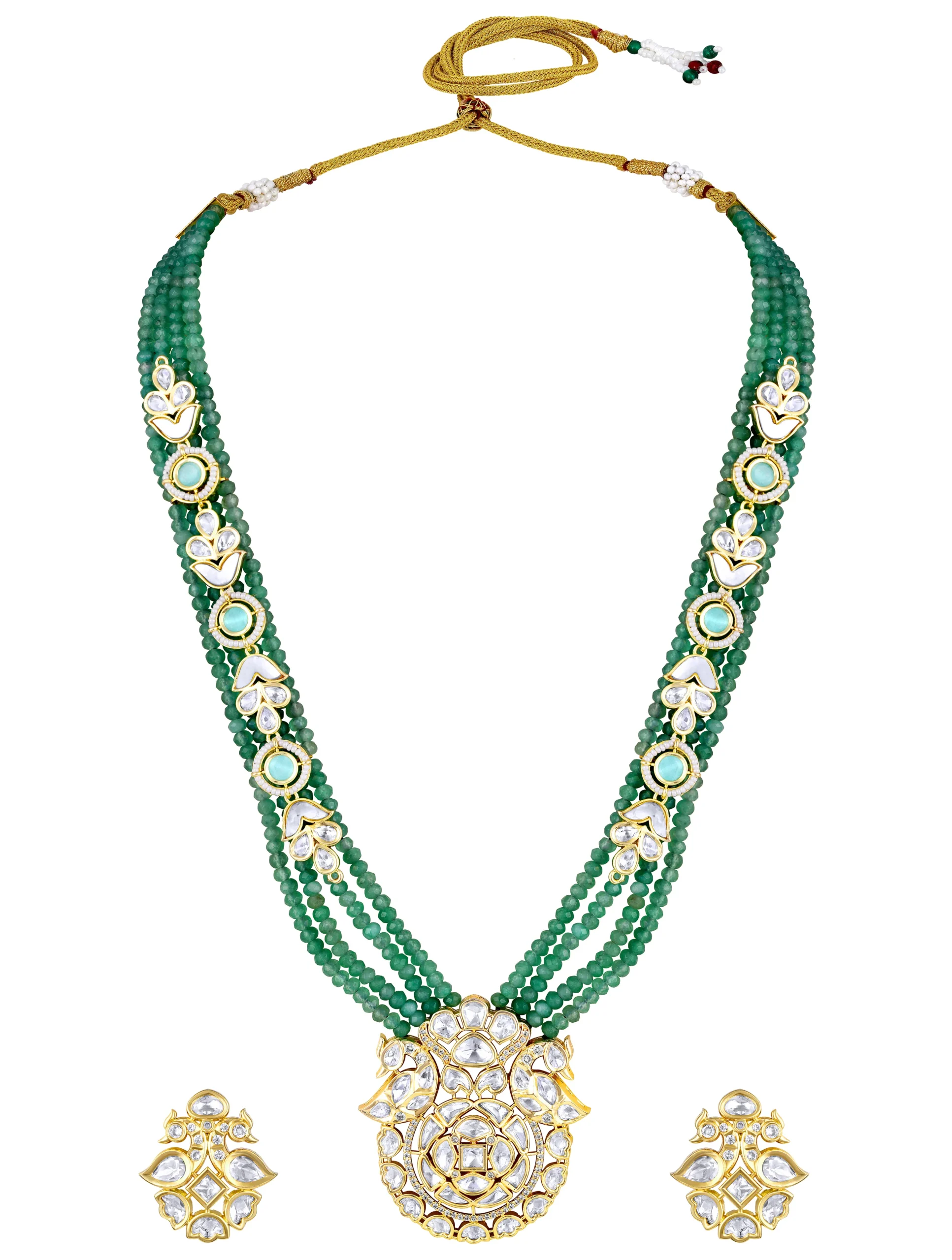 Style this elegant necklace set with silk sarees, embroidered lehengas, or festive Anarkali outfits for weddings and celebrations. The rich green agate strands beautifully complement ivory, gold, emerald, and pastel outfits, while the kundan polki detailing adds a timeless royal touch to both traditional and fusion looks.