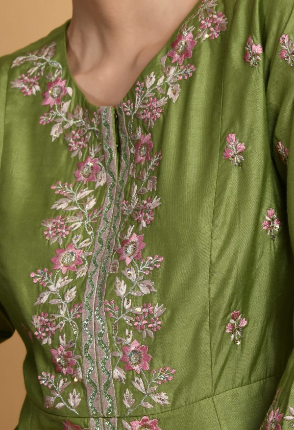 Introducing a green chanderi embroidered open kurta sharara set, featuring a beautifully crafted open-front chanderi short kurta with three-quarter sleeves. The kurta is adorned with intricate embroidery across the front and sleeves, adding richness and elegance to the silhouette. It is paired with a matching green chanderi sharara, creating a graceful and festive ensemble perfect for celebrations and special occasions.