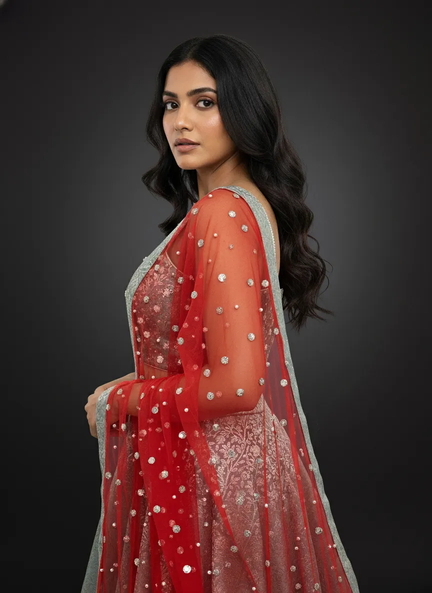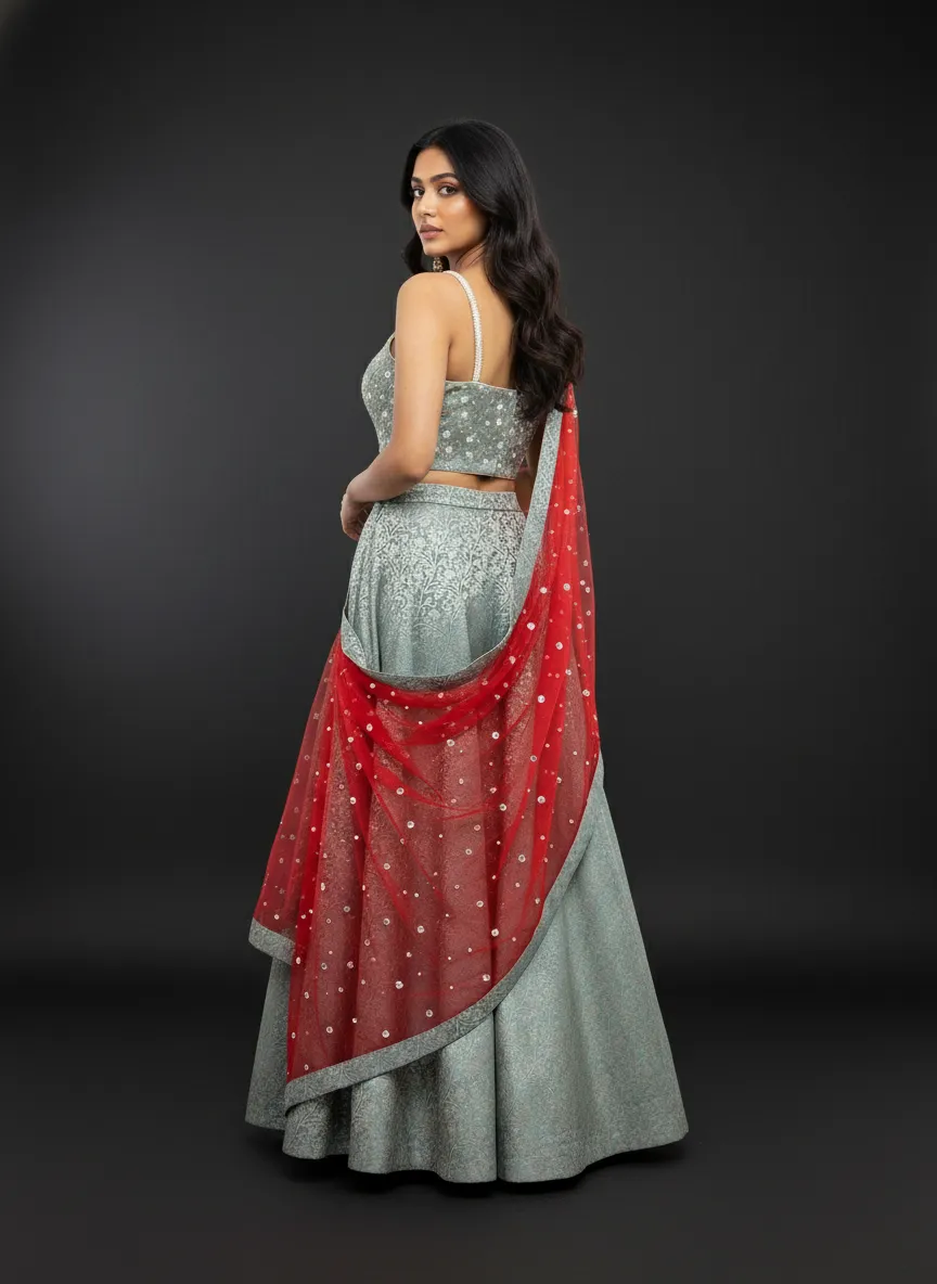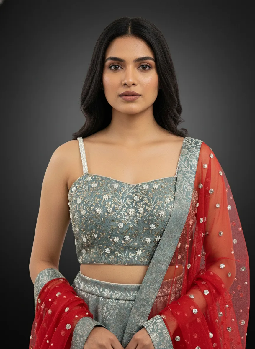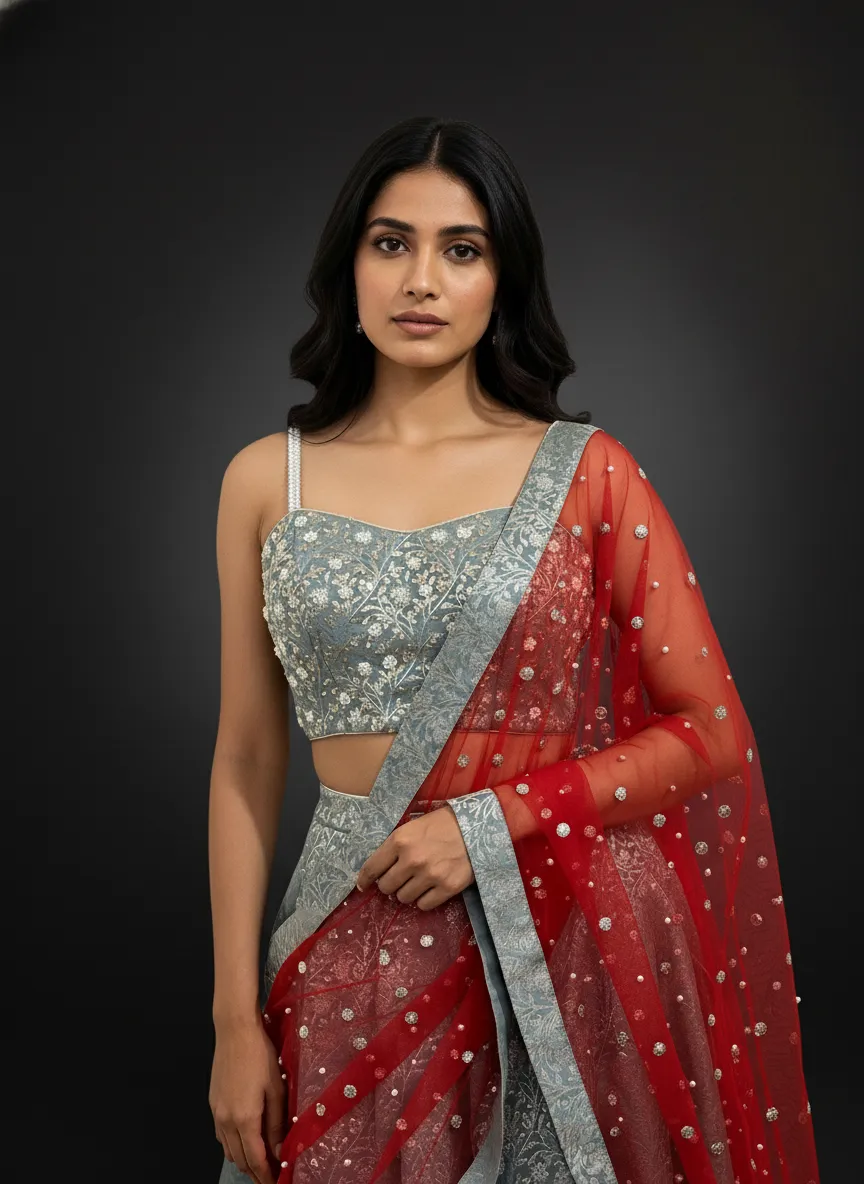 Grey Banarasi Lehenga with Pearl Brocade Blouse and Red Net Dupatta