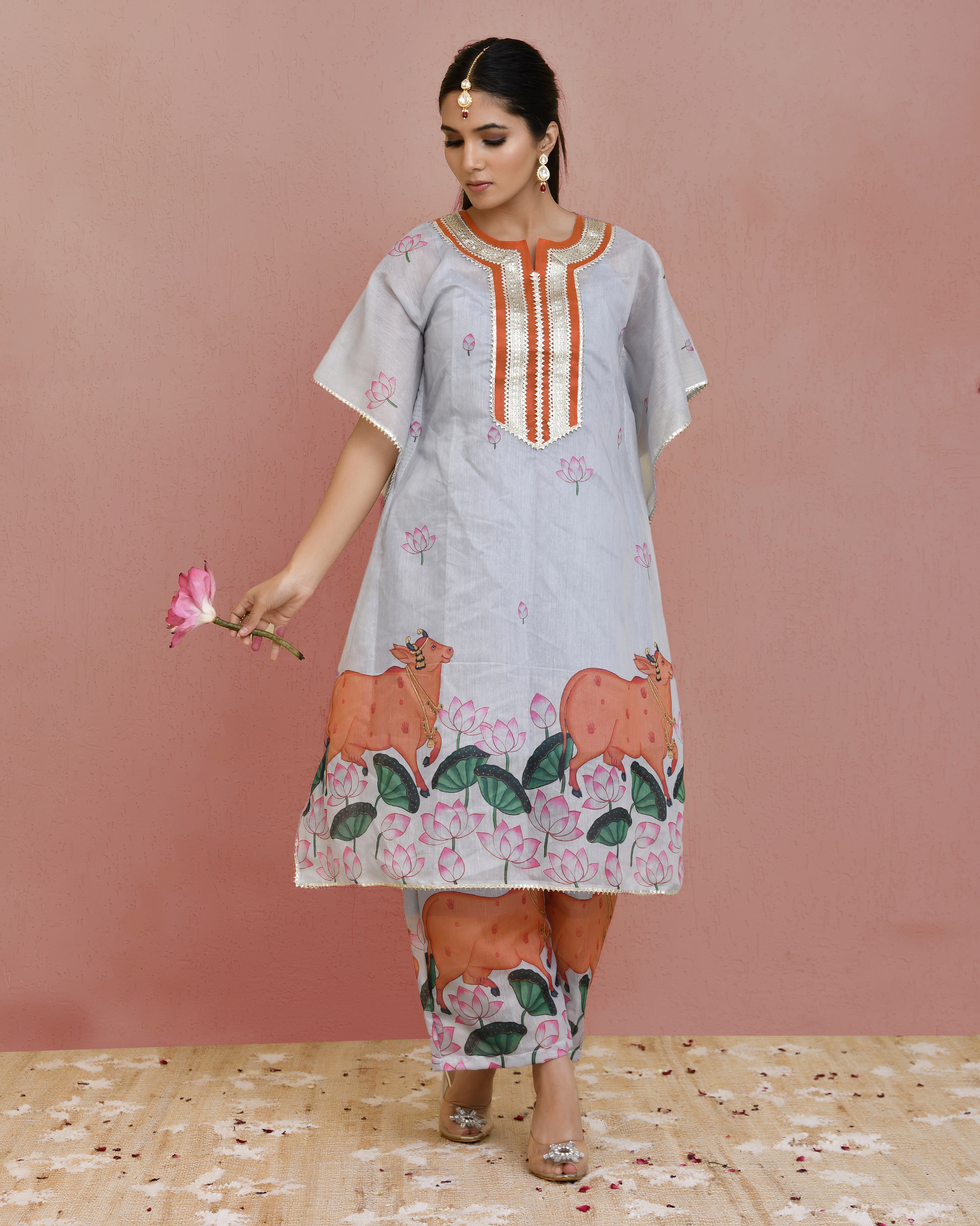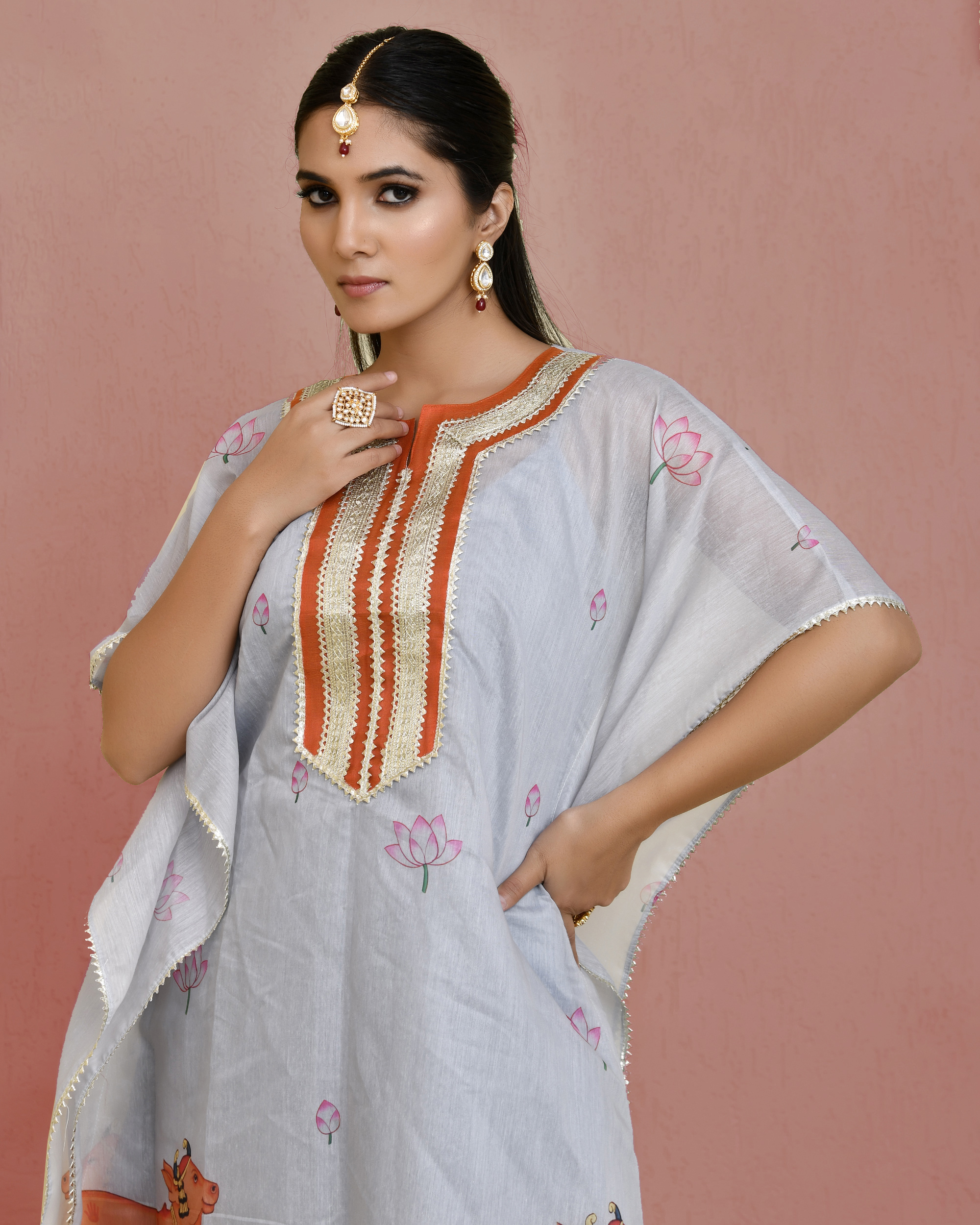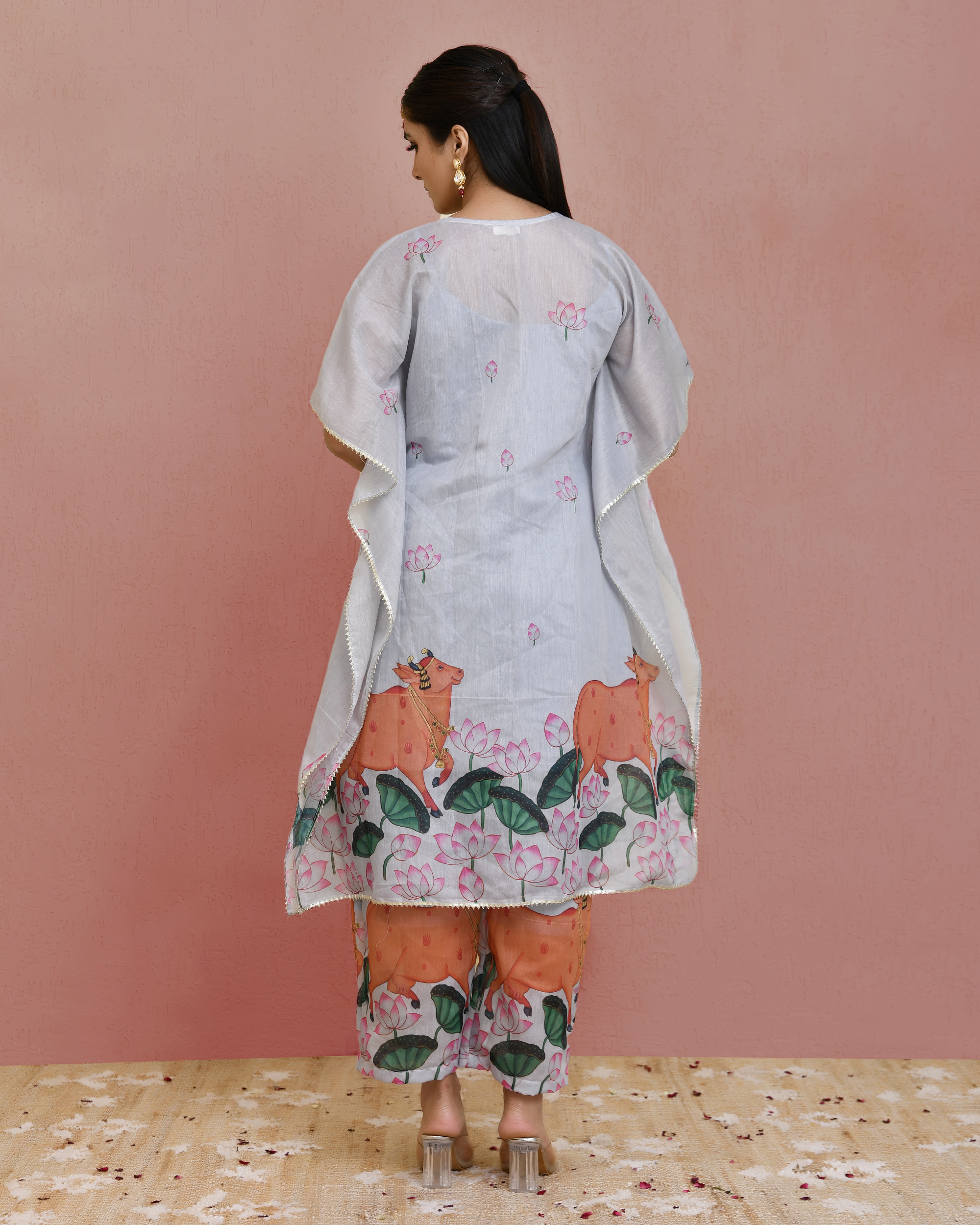 Grey Chanderi Pichwai Print Embellished Kaftan Set