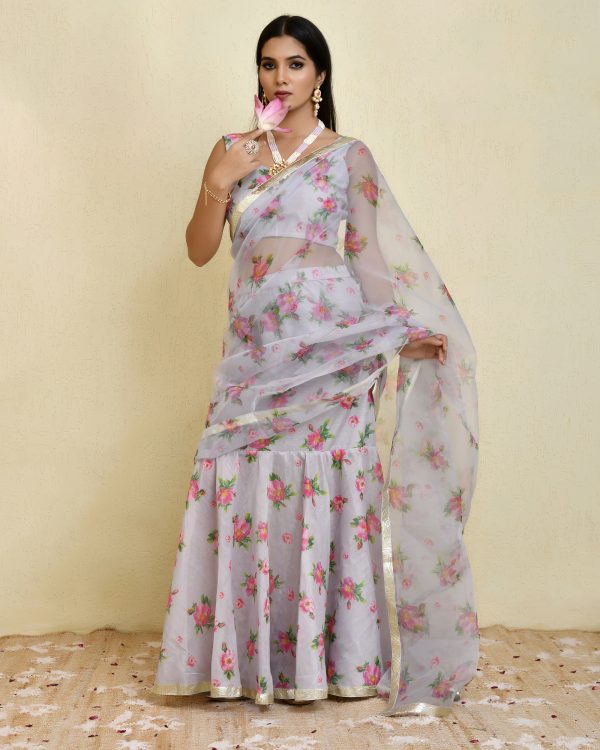 Introducing a grey pre-draped printed chanderi and organza saree, crafted for refined elegance with effortless wearability. Designed in grey floral-printed chanderi and organza, the pre-draped saree is enhanced with delicate lace border detailing for a graceful finish. Paired with a matching round-neck padded blouse, this ensemble blends traditional charm with contemporary easeperfect for festive occasions, celebrations, and elegant day-to-evening events.