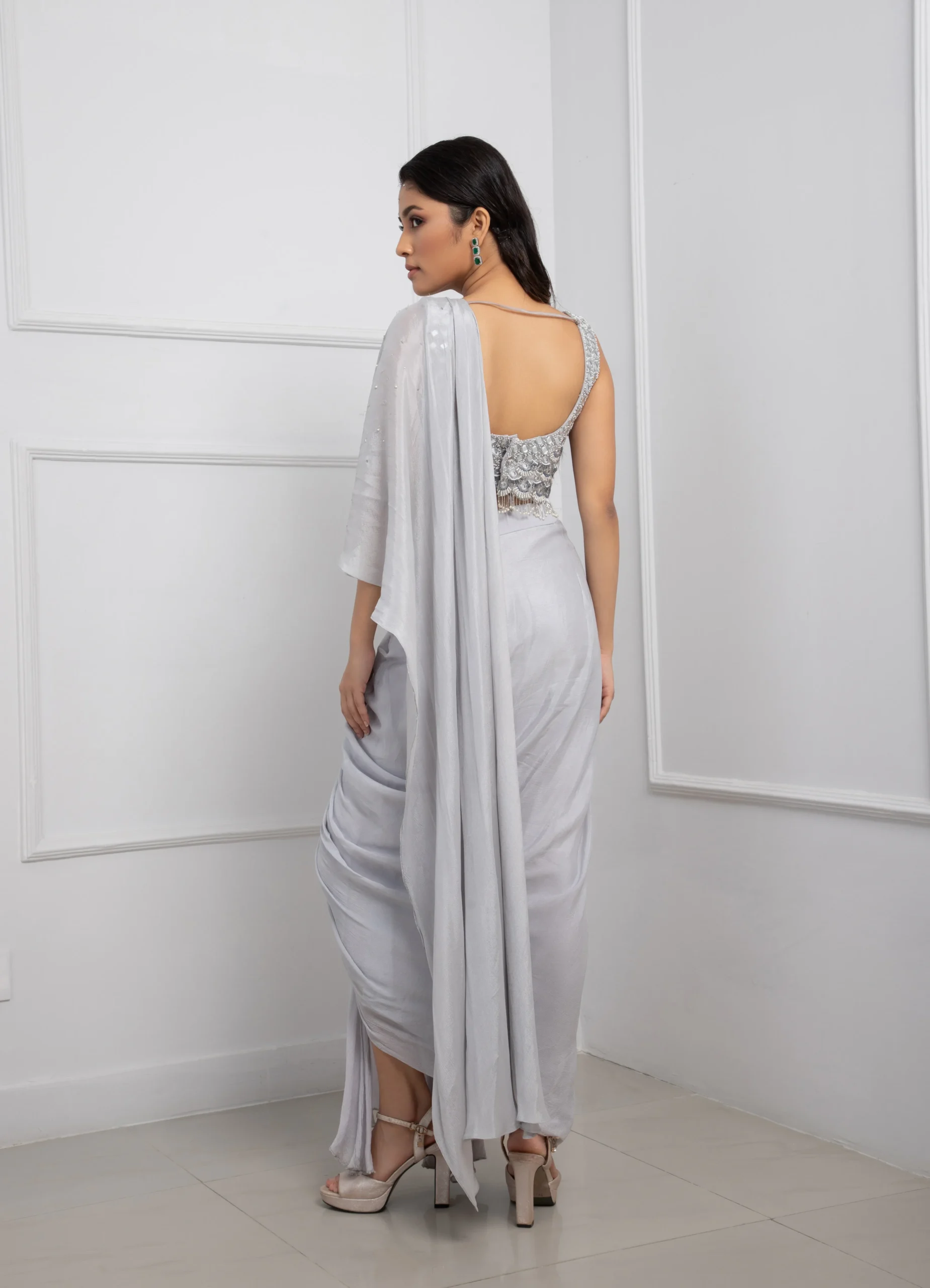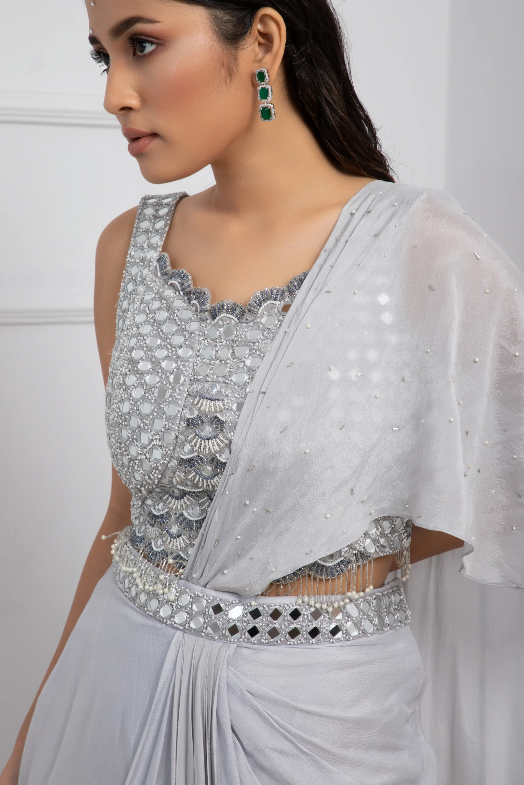 Style this Grey pre-draped saree set with silver or crystal statement earrings to echo the sequin detailing. Pair with metallic heels or sleek stilettos for a refined silhouette.