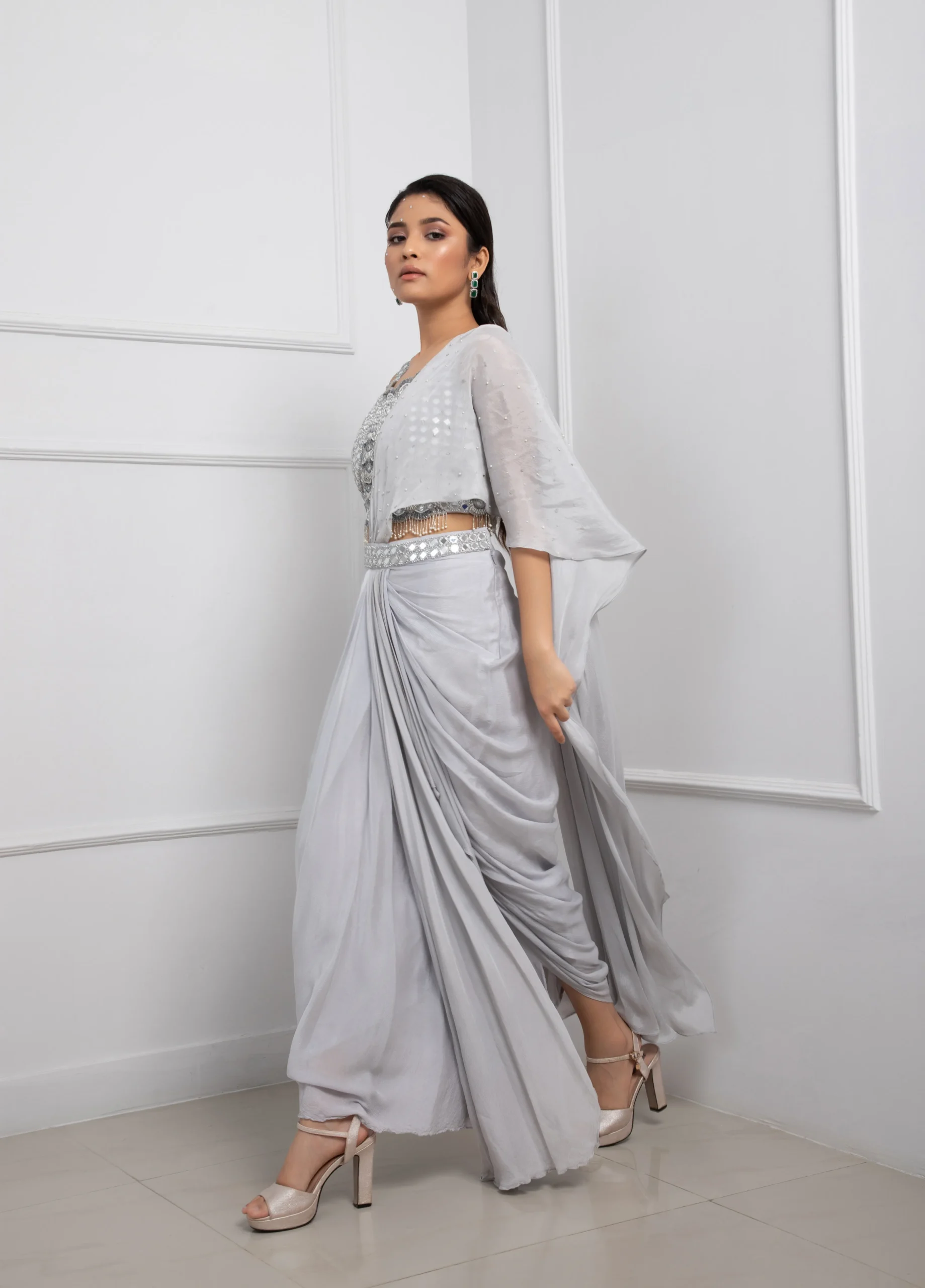 Introducing a sophisticated grey pre-draped saree set crafted for modern elegance with timeless appeal. This ensemble features a sleeveless crop top intricately embellished with shimmering silver sequins and tonal embroidery, creating a striking focal point. The pre-draped skirt showcases fluid, cascading pleats that offer ease of wear while preserving the classic saree silhouette. Finished with a coordinated embellished belt that cinches the waist for a structured, flattering fit, this set is perfect for cocktail parties, receptions, and elevated evening occasions.