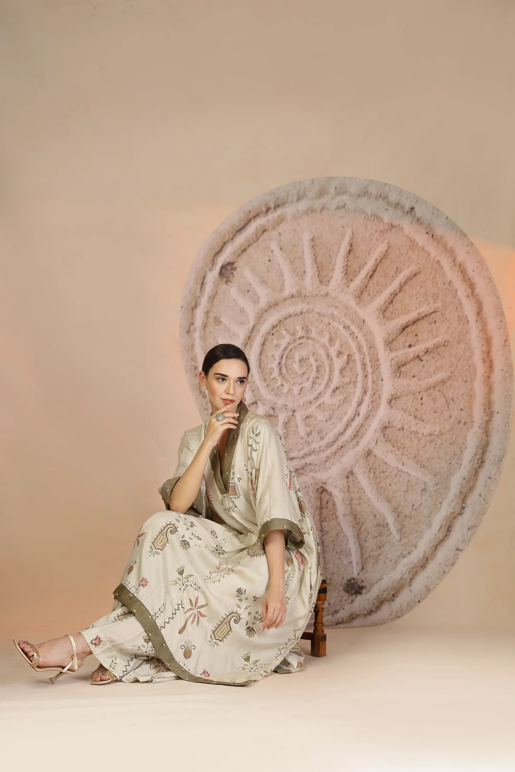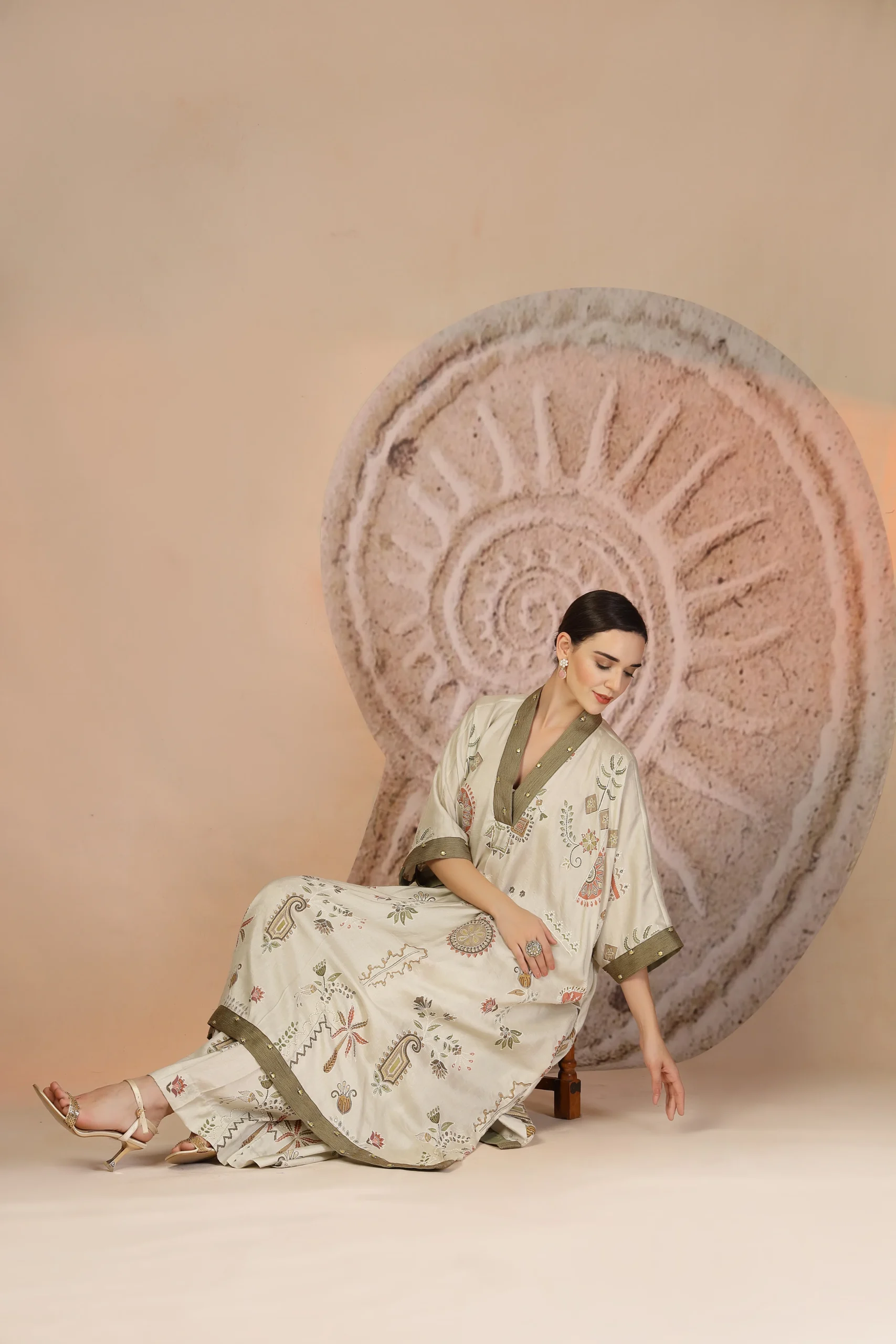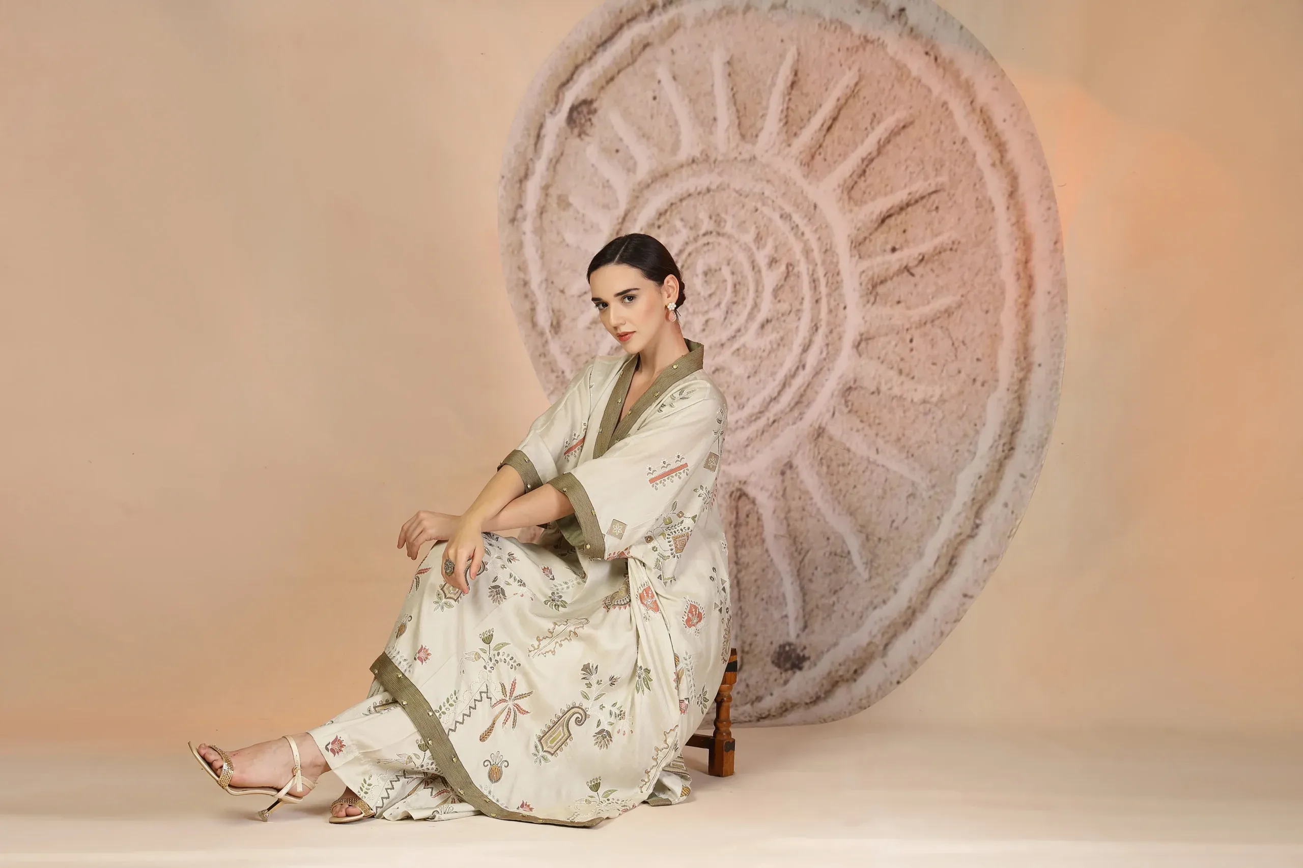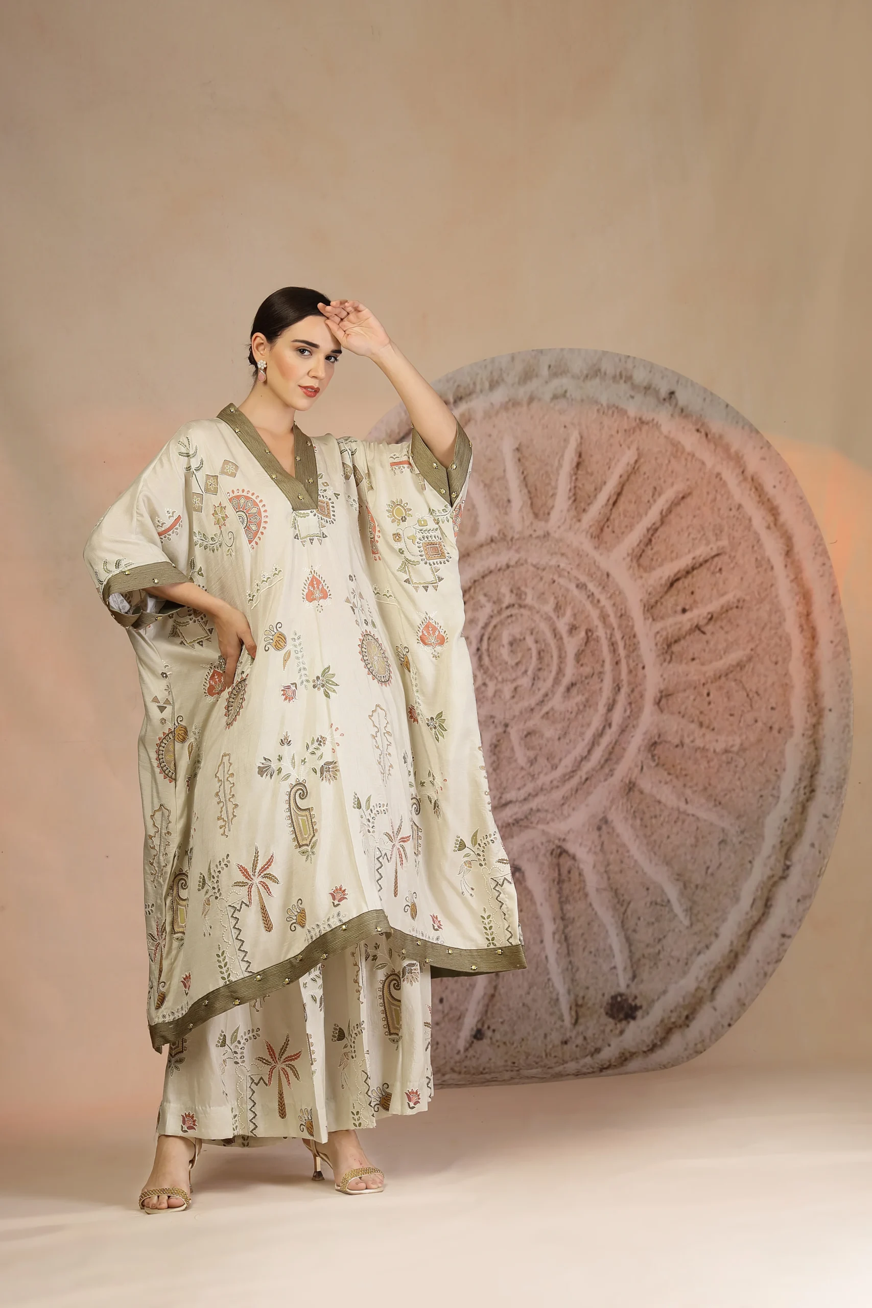 Style this kaftan kurta set with minimal gold-toned jewelry or statement earrings to highlight the metallic accents. Opt for natural makeup with soft definition and a nude or earthy lip. Complete the look with kolhapuri sandals or block heels and a sleek bun or open hair—ideal for festive daywear and elegant casual celebrations.
