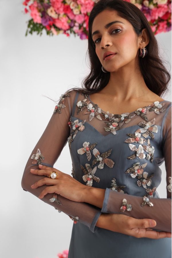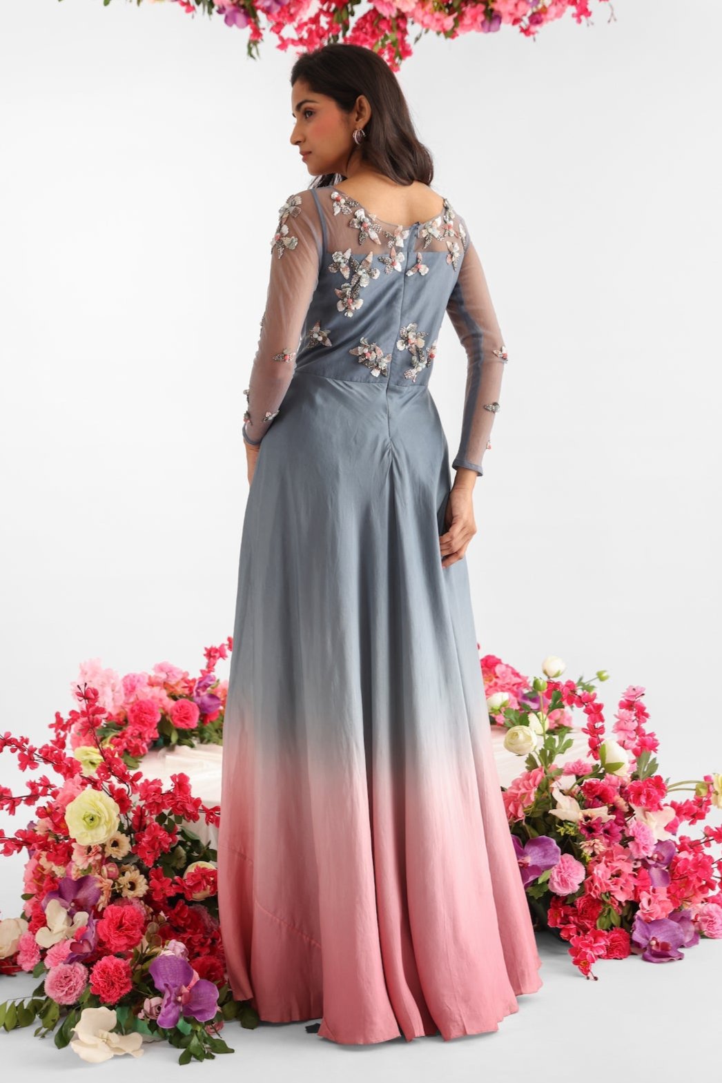 Introducing the Greyish Blue Habutai Silk Embroidered Gown, a breathtaking creation in pure habotai silk that captures the serene beauty of the evening sky. In soft greyish blue and delicate pink hues, this gown features exquisite floral embroidery and intricate stonework on the bodice, adding a subtle yet captivating sparkle. The gentle gradient of colors, along with delicate detailing, combine to create an ethereal, enchanting look, making it the perfect choice for any special occasion.