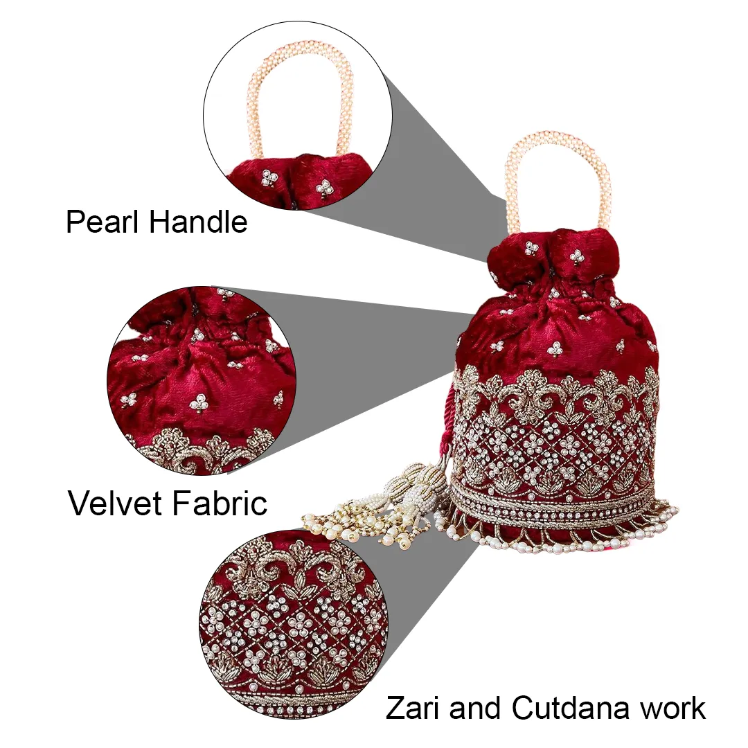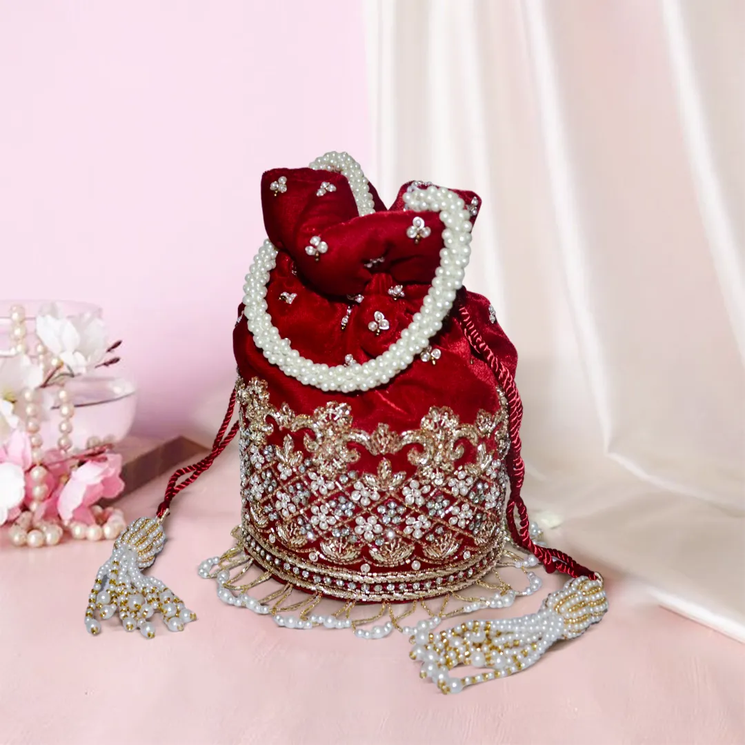 Gulab Hand-Embroidered Velvet Potli Bag with Pearl Detailing – Red