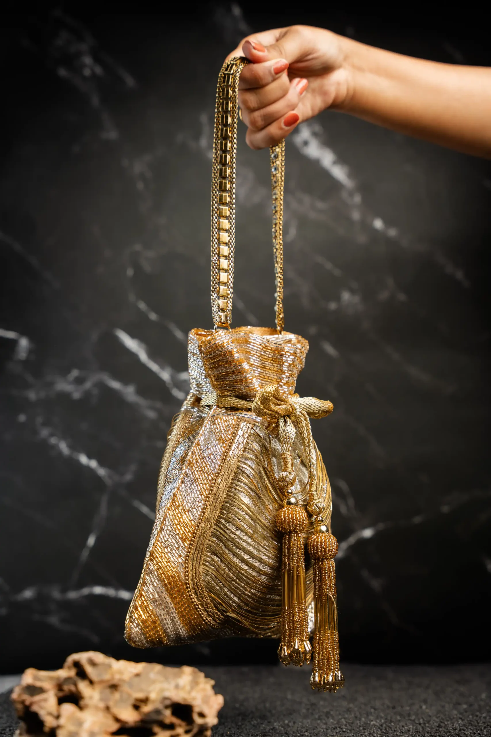 Style the Hinted Gold Potli Bag with lehengas, sarees, anarkalis, or festive kurta sets for weddings and celebrations. The radiant gold tone pairs beautifully with classic shades like red, maroon, emerald, ivory, and champagne. Match it with traditional gold jewelry or pearl accessories to enhance the regal appeal, or pair it with modern festive outfits for a contemporary look. Perfect for wedding functions, receptions, festive gatherings, and evening occasions where a refined accessory completes the ensemble.