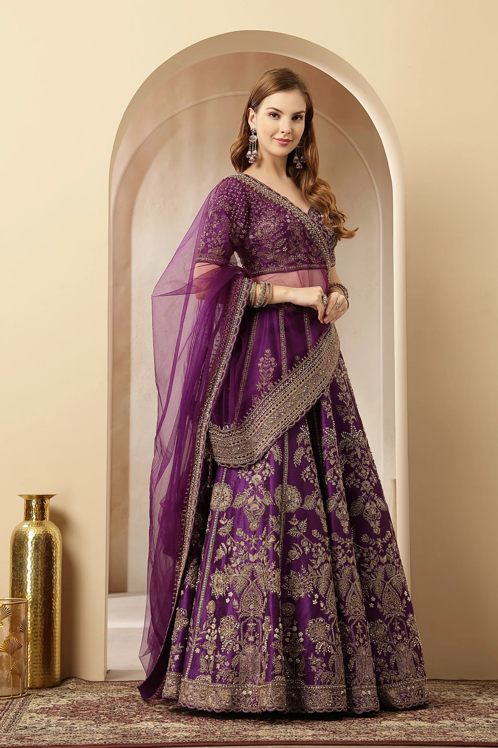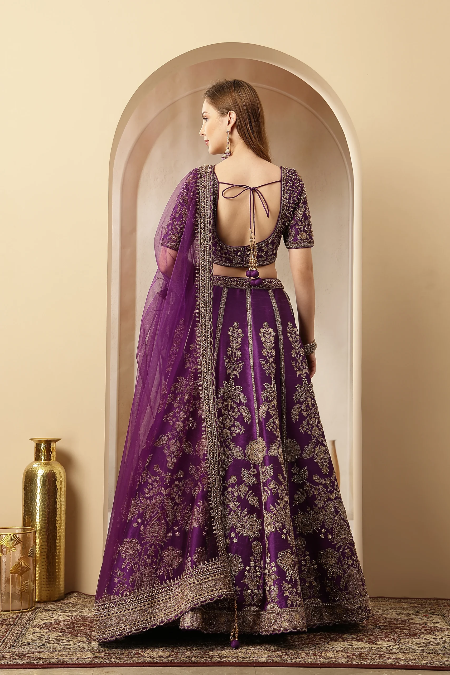 Introducing Purple, a regal lehenga ensemble that celebrates timeless heritage with modern elegance. Rendered in a majestic imperial purple, it features intricate zari, resham, and sequin embroidery inspired by Banarasi artistry. The richly crafted lehenga and blouse are balanced with a contemporary neckline and structured silhouette, making it perfect for grand festive and wedding celebrations.