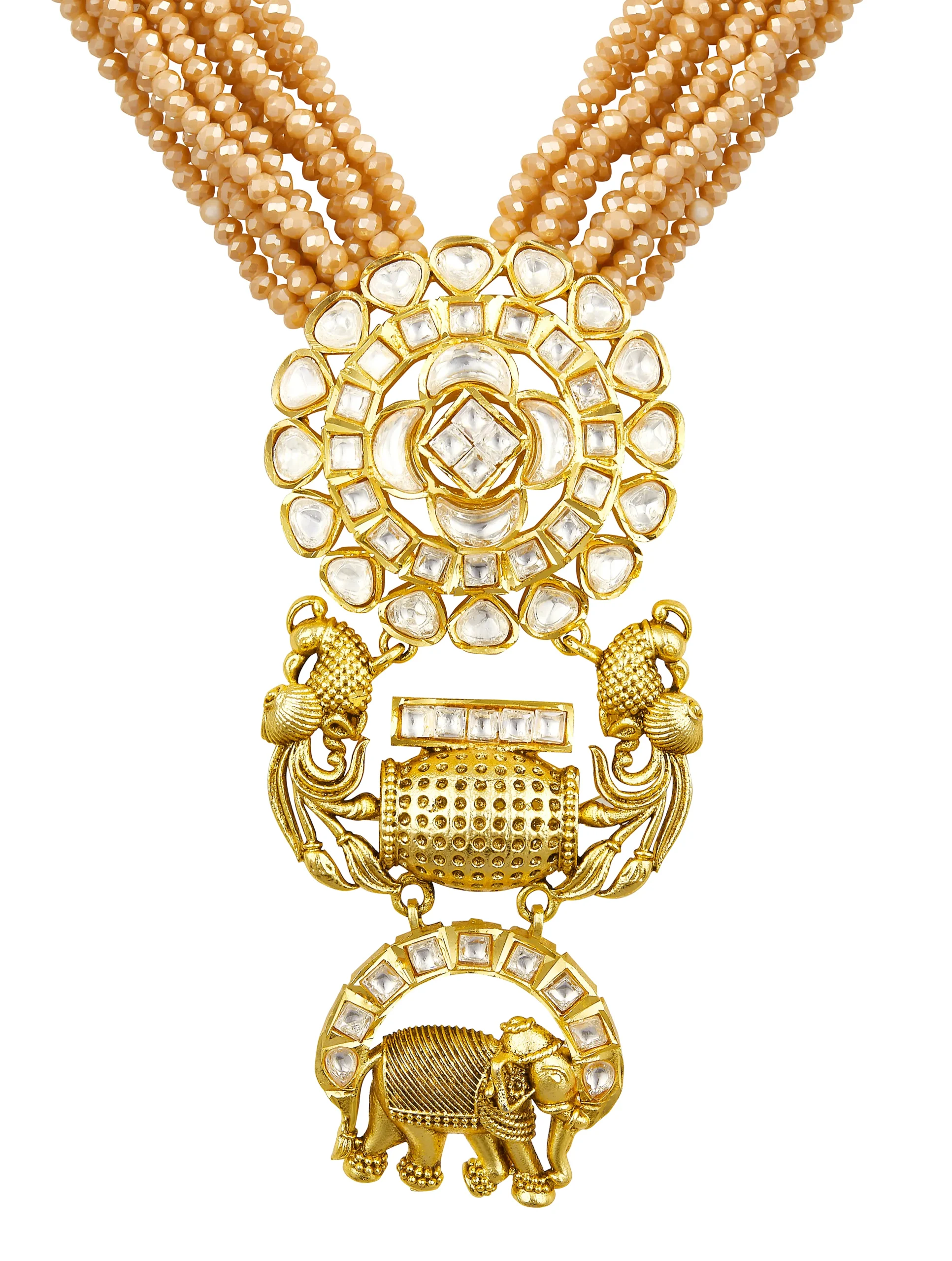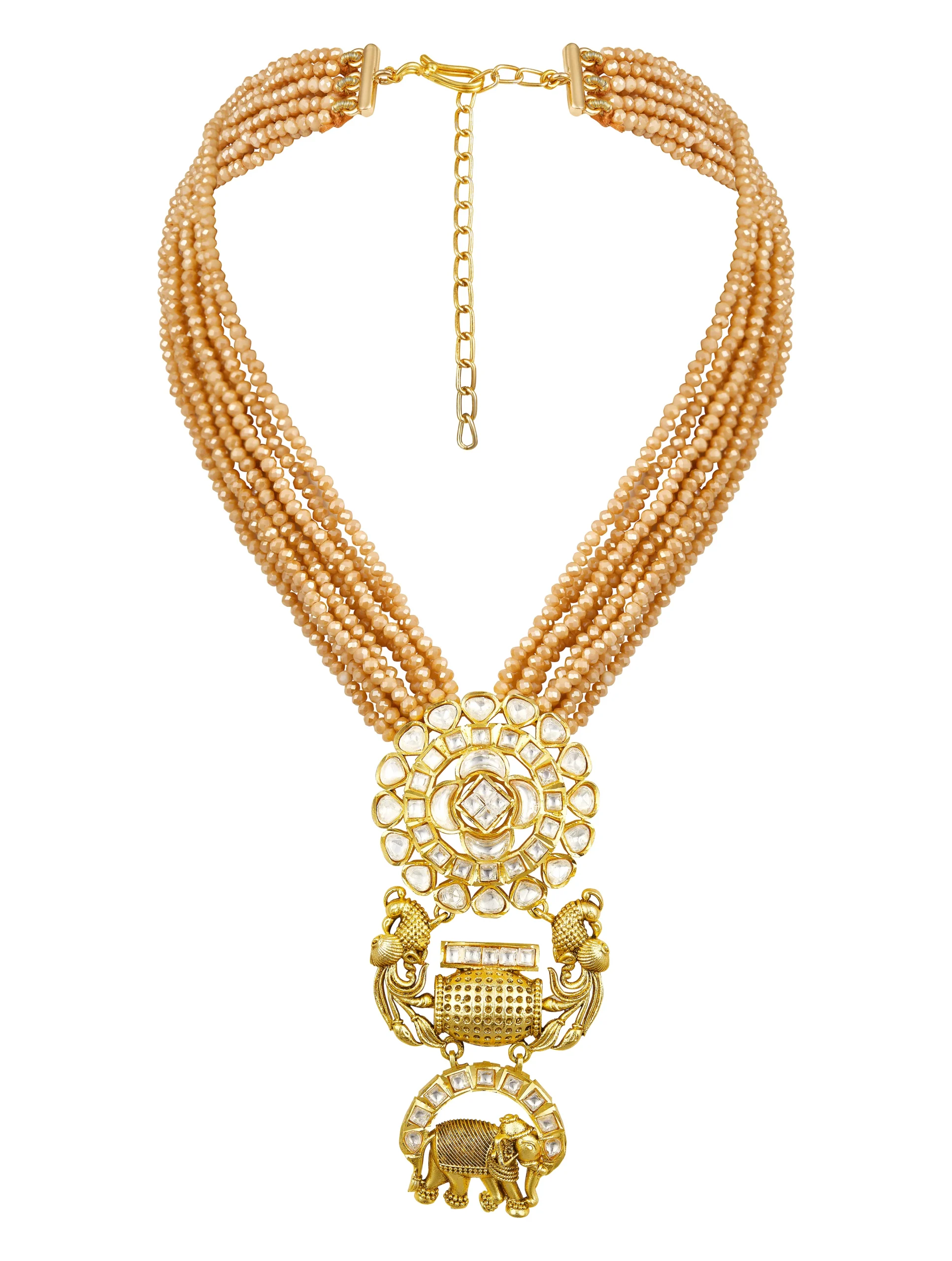 Style this majestic multi-strand necklace set with silk sarees, bridal lehengas, or heavily embroidered Anarkali outfits for weddings and grand celebrations. The classic gold tones and crystal detailing beautifully complement red, maroon, ivory, and gold ensembles, creating a rich traditional statement with royal elegance.