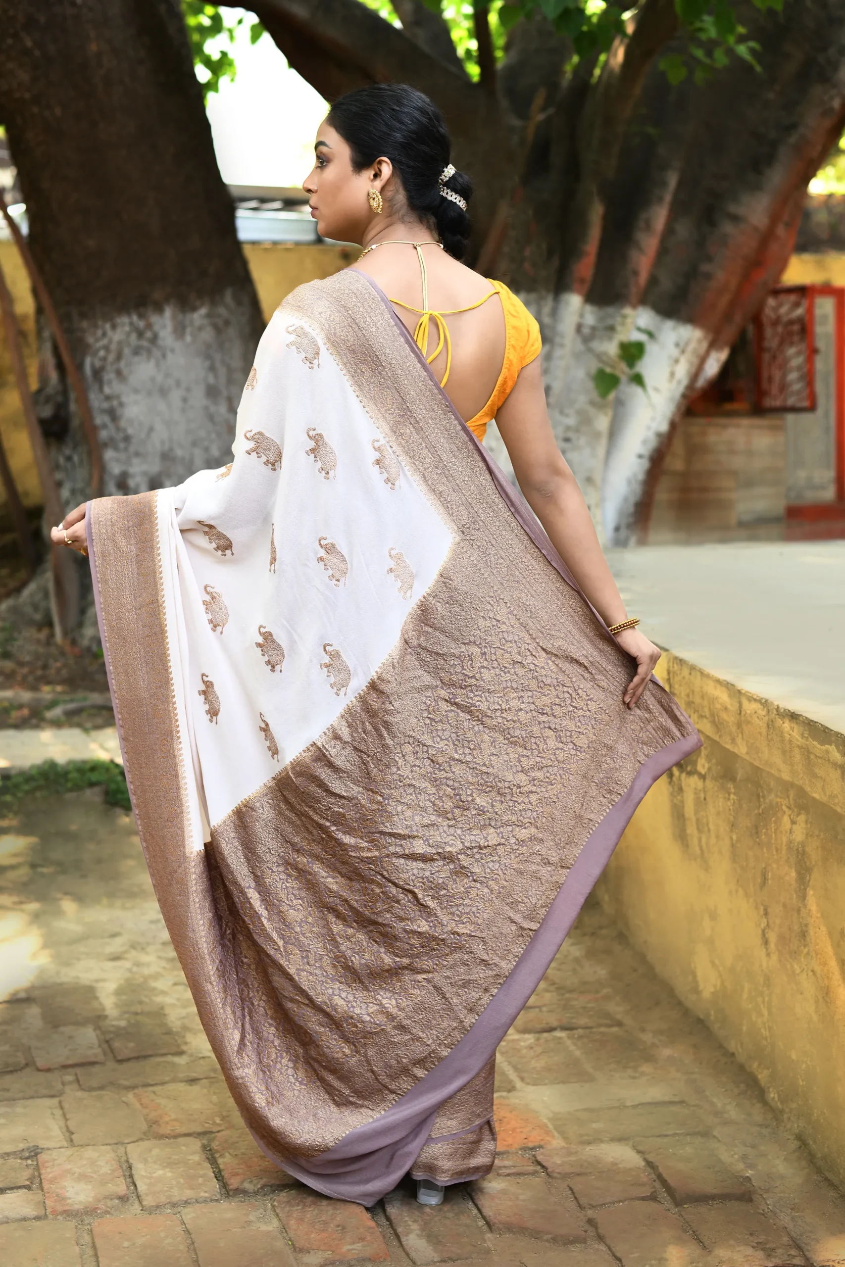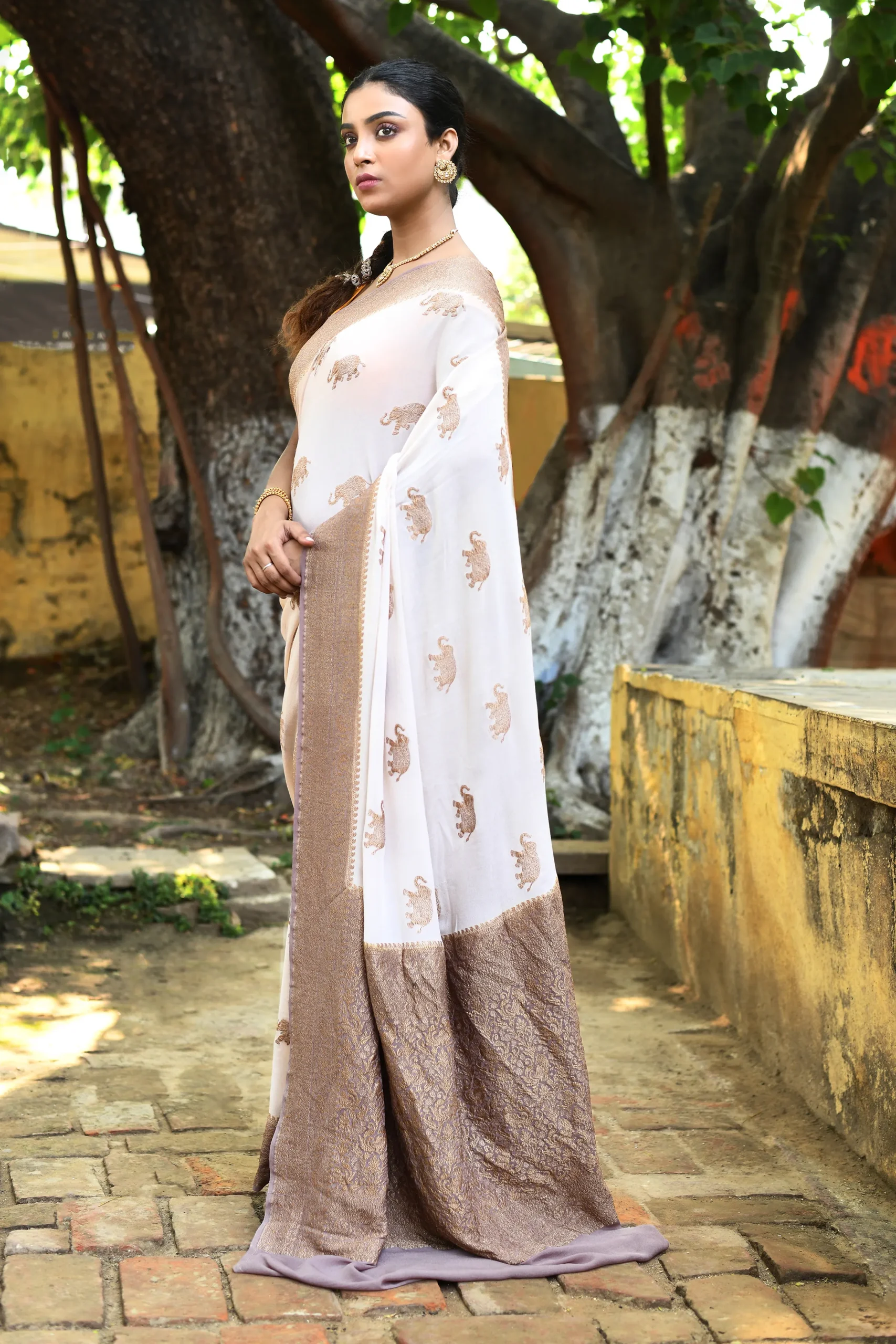 Ivory Banarasi Silk Saree with Antique Gold Butti & Traditional Grey Border