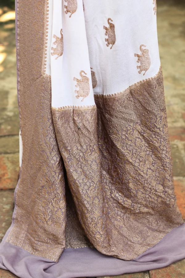 Style this elegant ivory Banarasi silk saree with antique gold, pearl, or minimal polki jewelry to enhance its subtle butti motifs and refined grey border. Pair with muted gold, silver, or grey-toned heels or classic juttis, and complete the look with a neutral or metallic clutchperfect for weddings, festive gatherings, and refined traditional occasions.