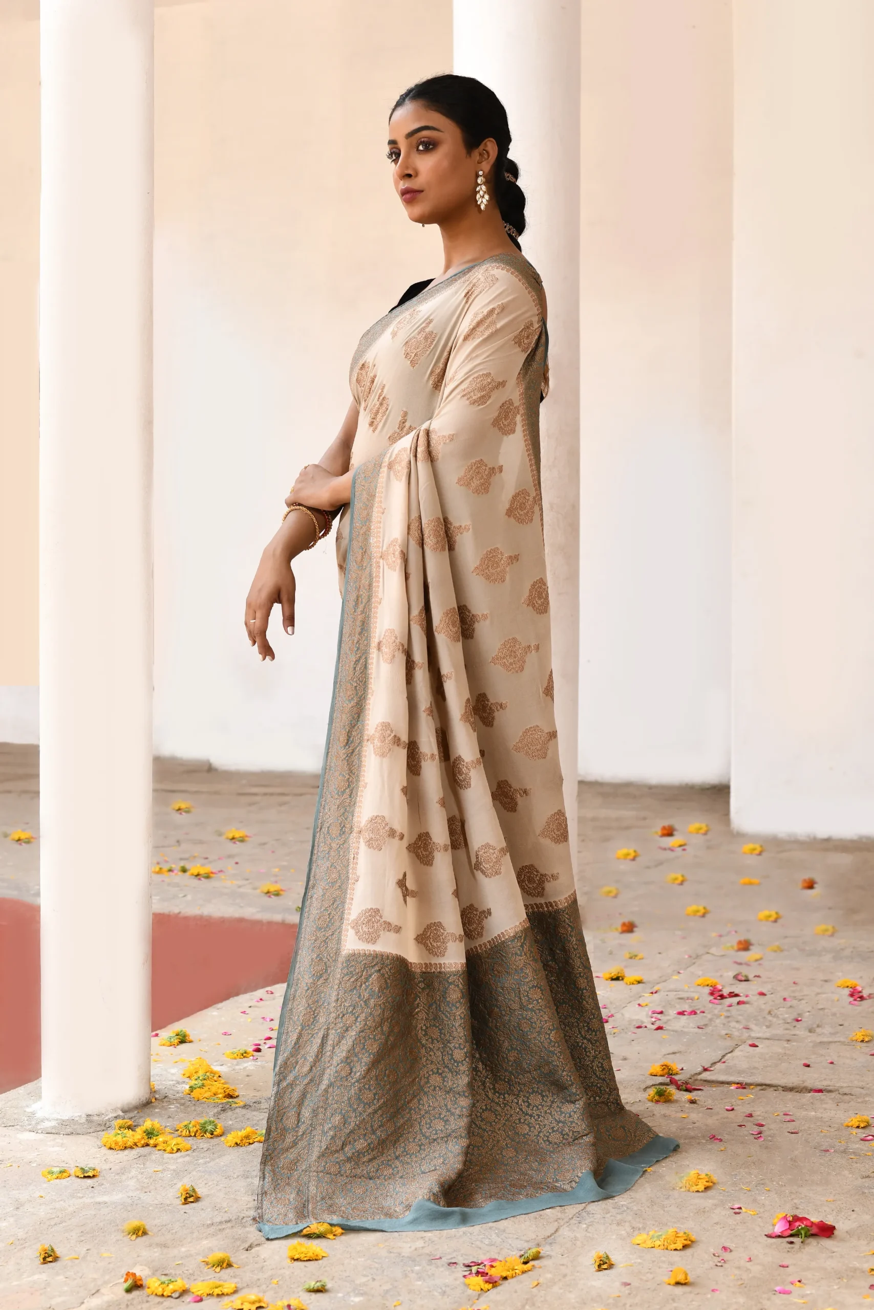 Style with pearl or antique gold jewellery and complete the look with an aqua blue or gold potli bag for refined elegance.
