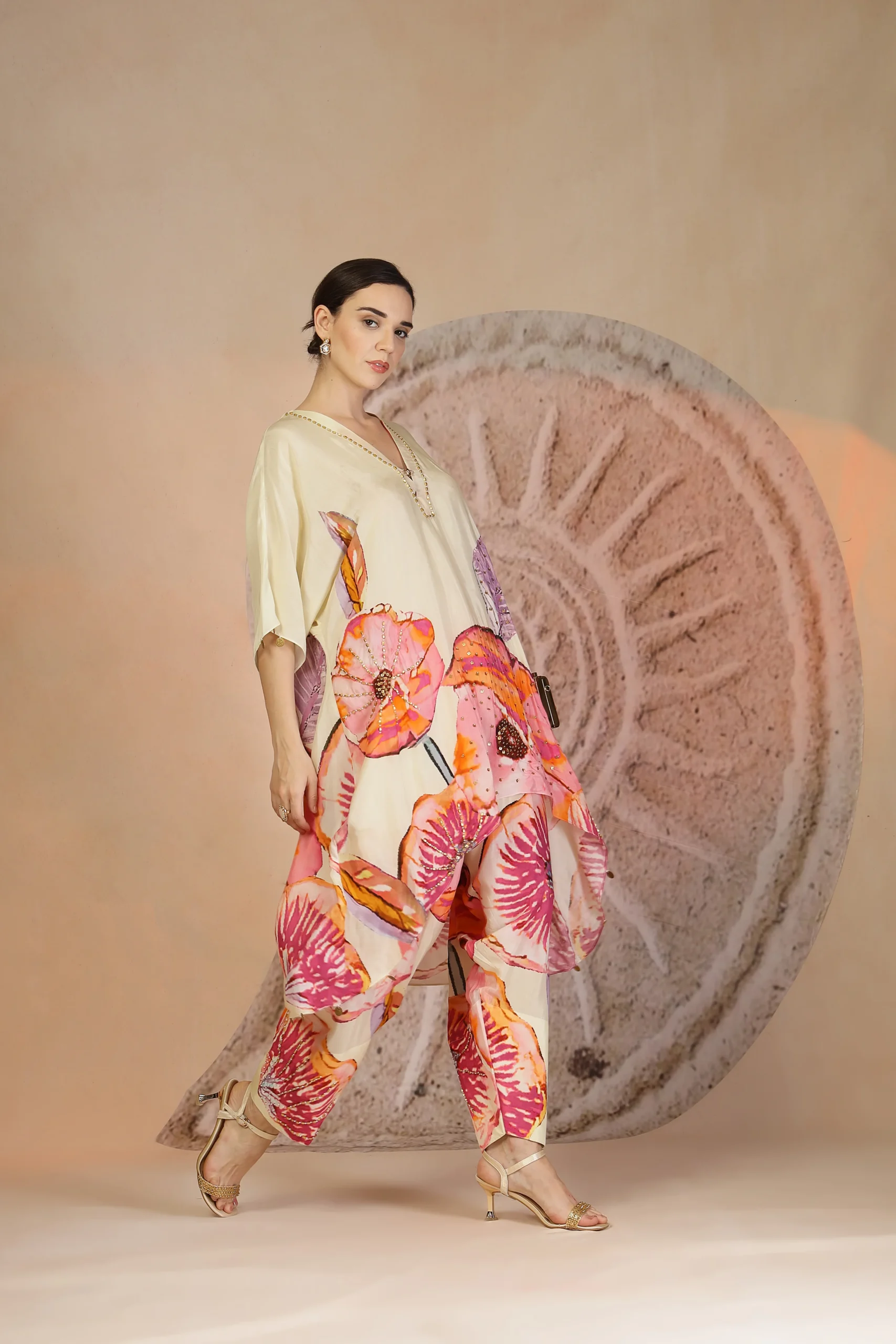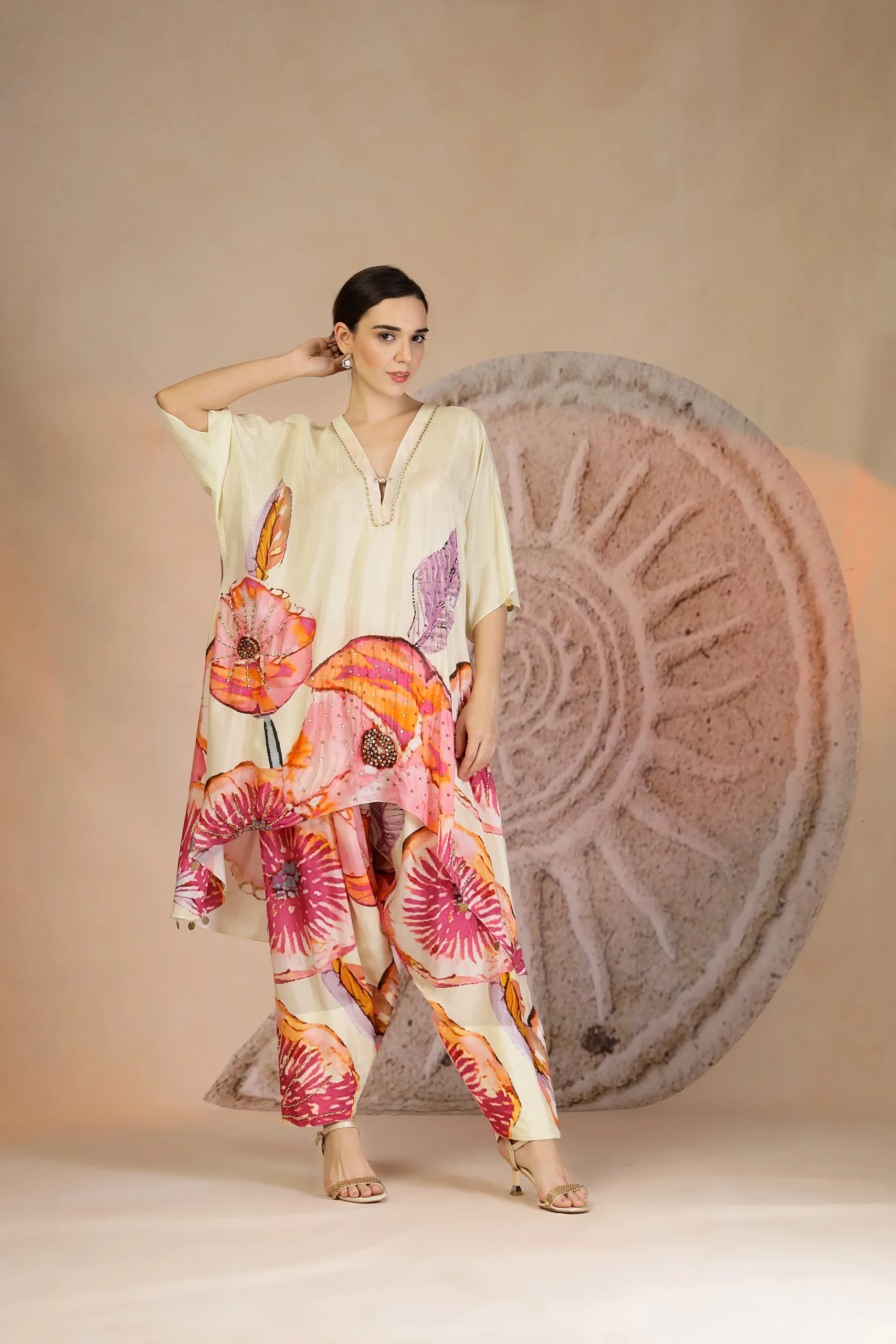 Ivory Coral Print Muslin Silk Kurta Set with Farzi Salwar & Beadwork