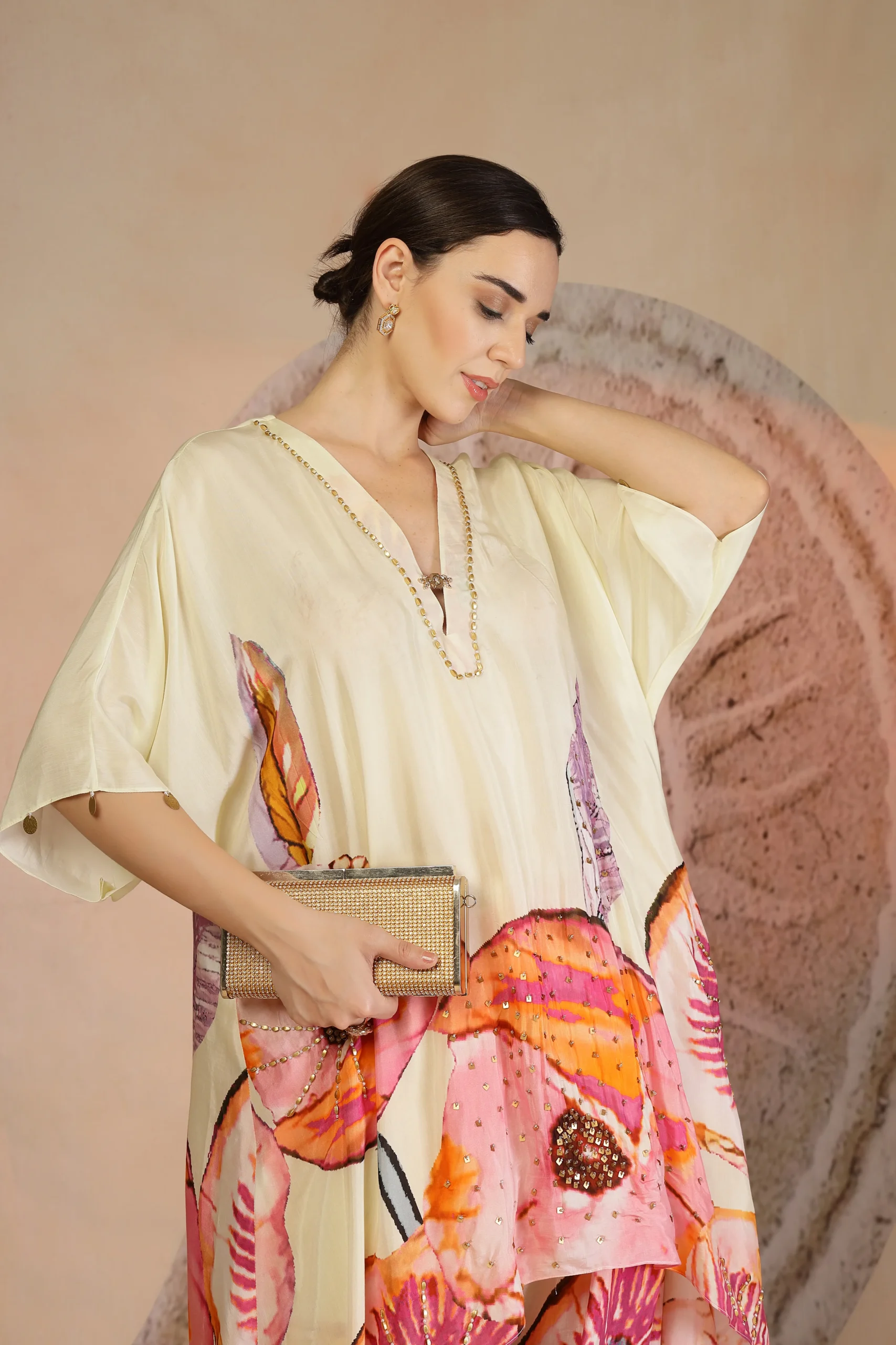 introducing an ivory coral print kurta set crafted in soft muslin silk, blending breezy comfort with modern elegance. Featuring a vibrant coral print paired with a stylish farzi salwar, the ensemble is elevated with delicate beadwork, subtle sequin highlights, and intricate bead detailing along the neckline. Lightweight and effortlessly chic, this refined set is perfect for summer festivities, daytime celebrations, and contemporary ethnic dressing.