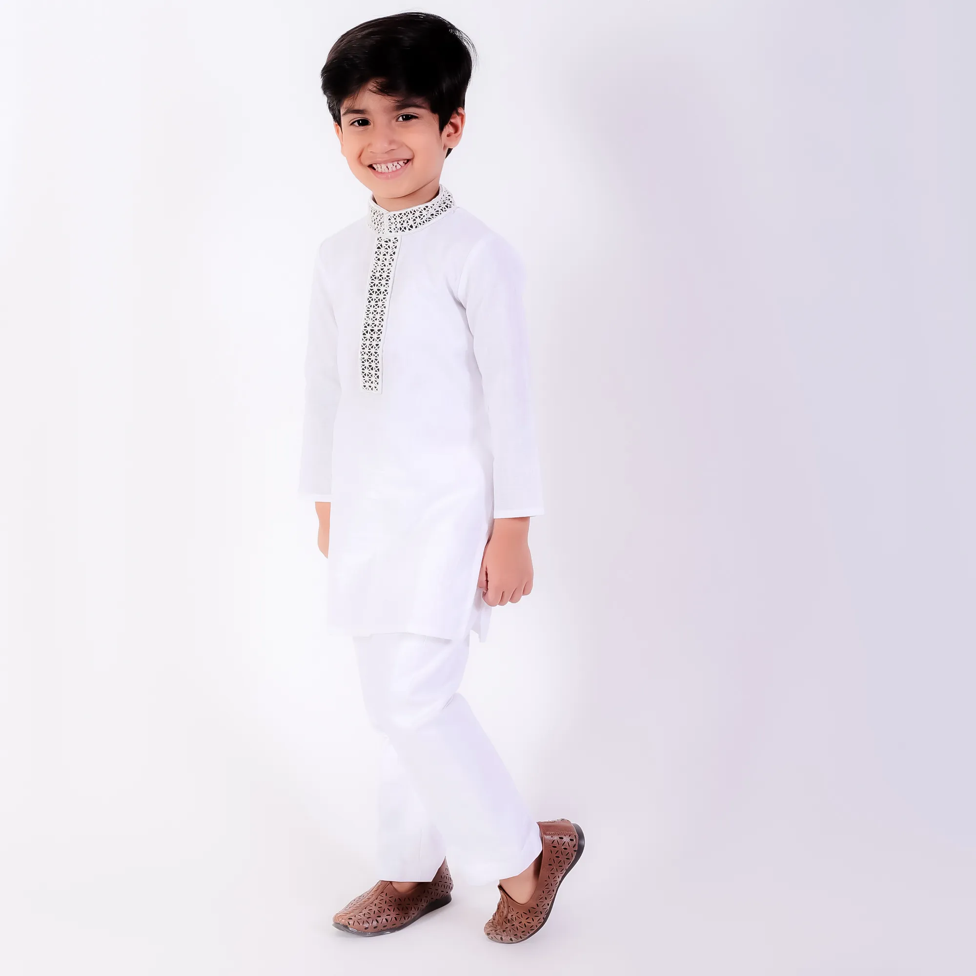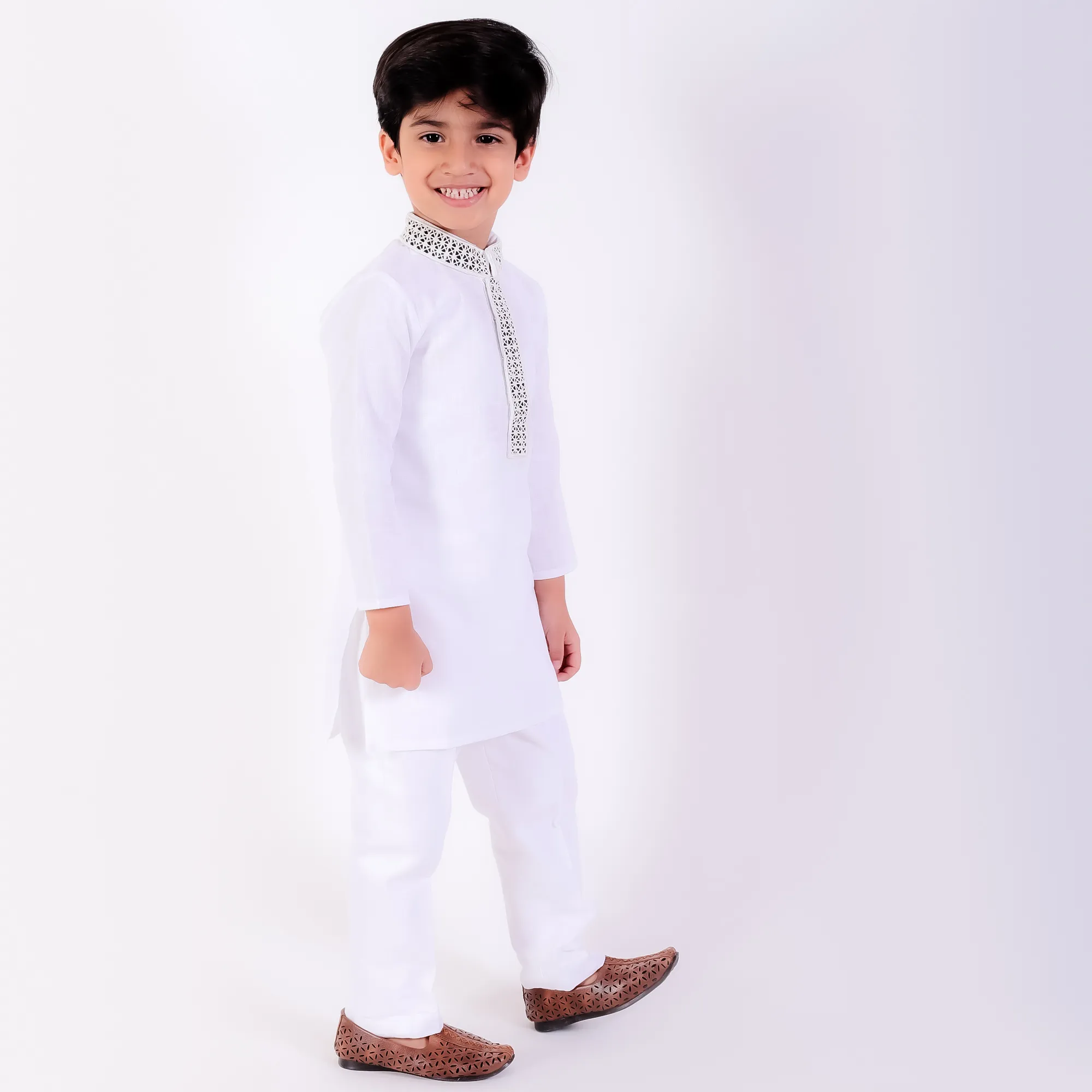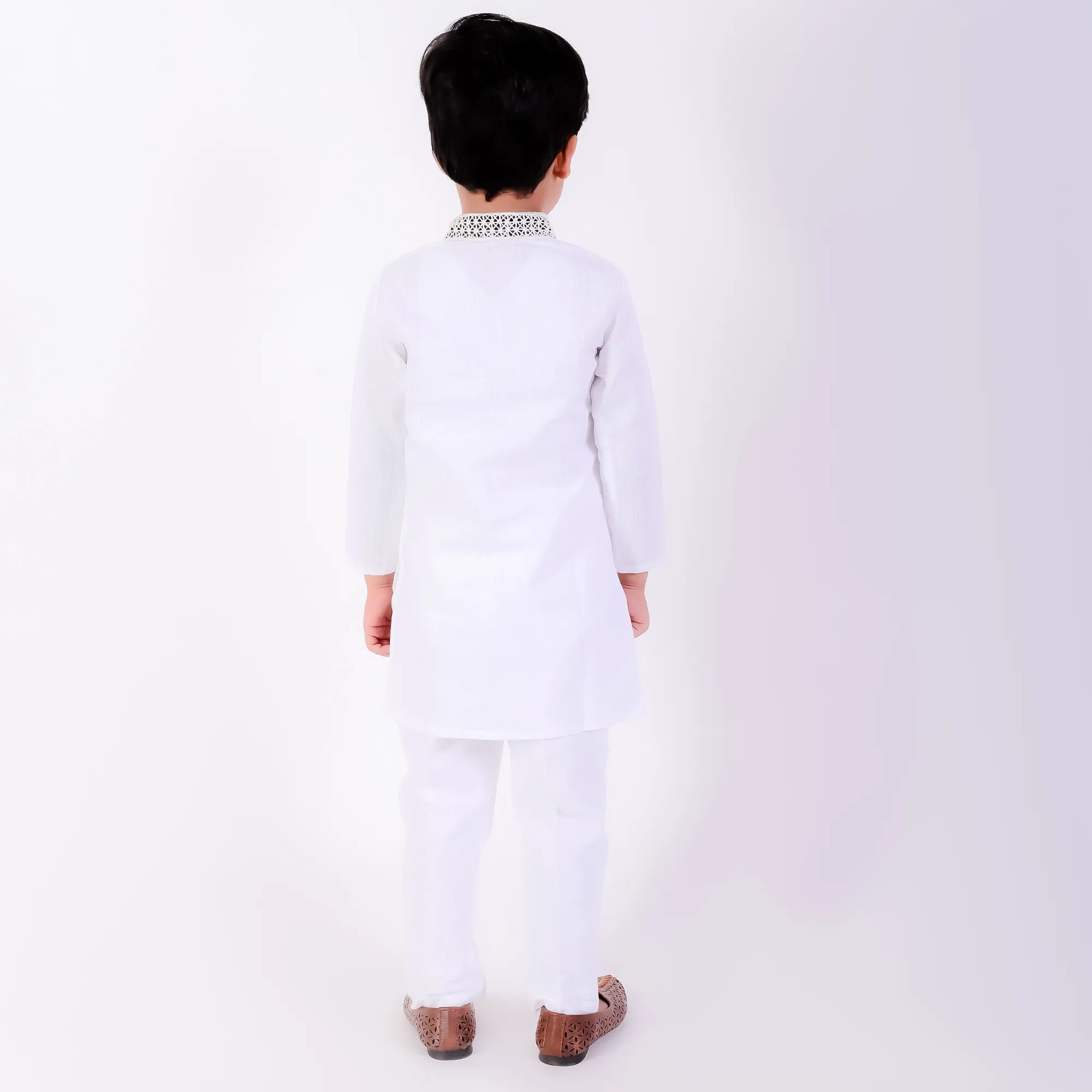 Style this ivory kurta set with traditional mojris or leather sandals for a graceful ethnic appearance. Ideal for festive occasions and family celebrations, it can also be paired with a lightweight Nehru jacket for a more elevated look. Keep accessories minimal to highlight the delicate cutwork embroidery.