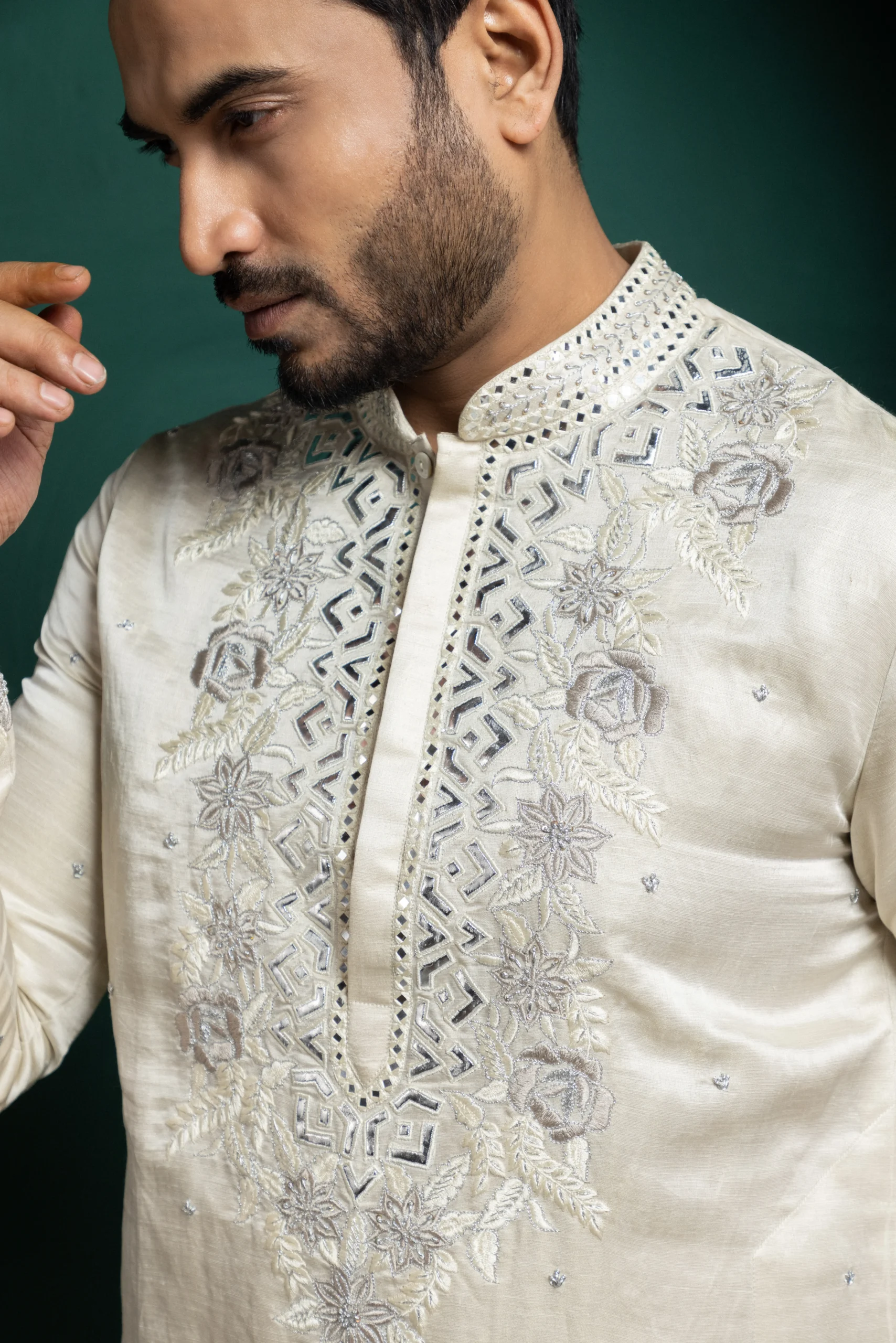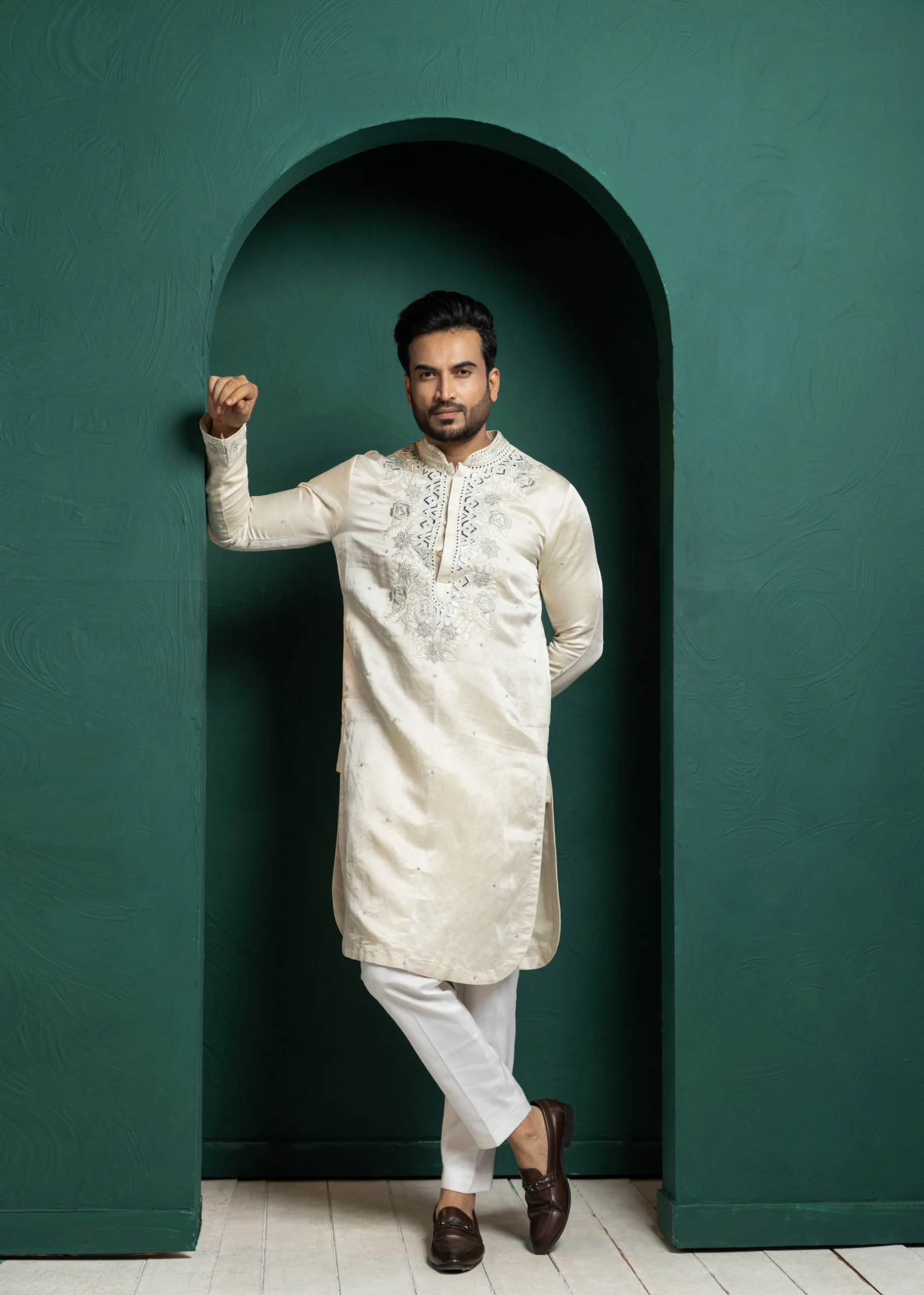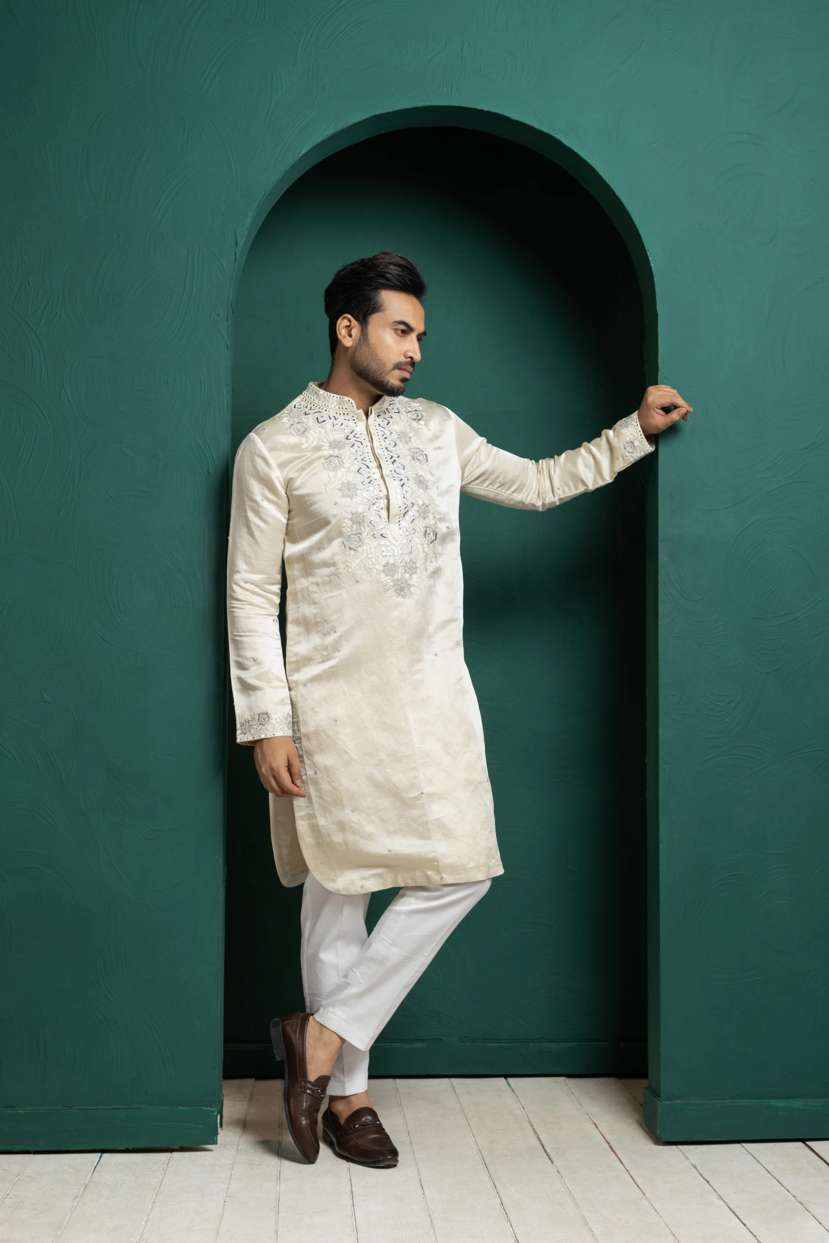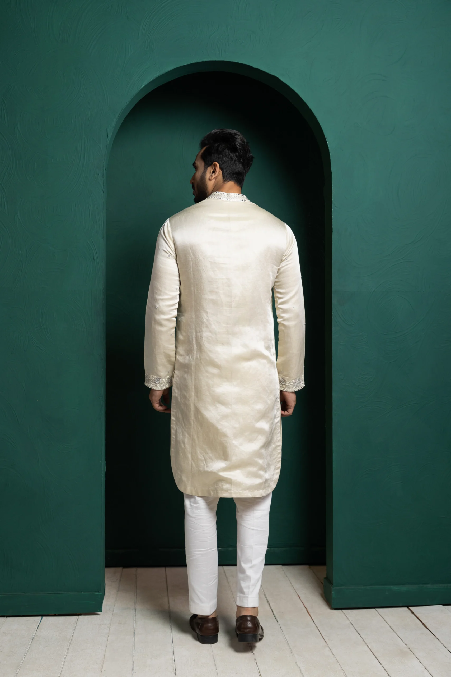 Style this ivory kurta with tailored churidar or straight-fit trousers for a refined traditional look. Pair it with classic mojaris or embroidered juttis and minimal accessories for effortless elegance. Ideal for festive events or formal occasions, keep the styling subtle to highlight the intricate embroidery and timeless appeal.