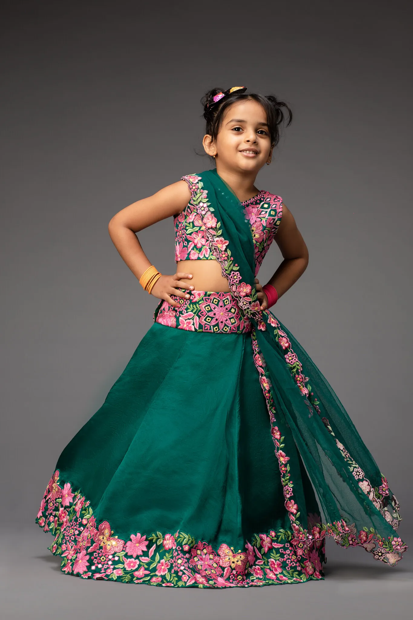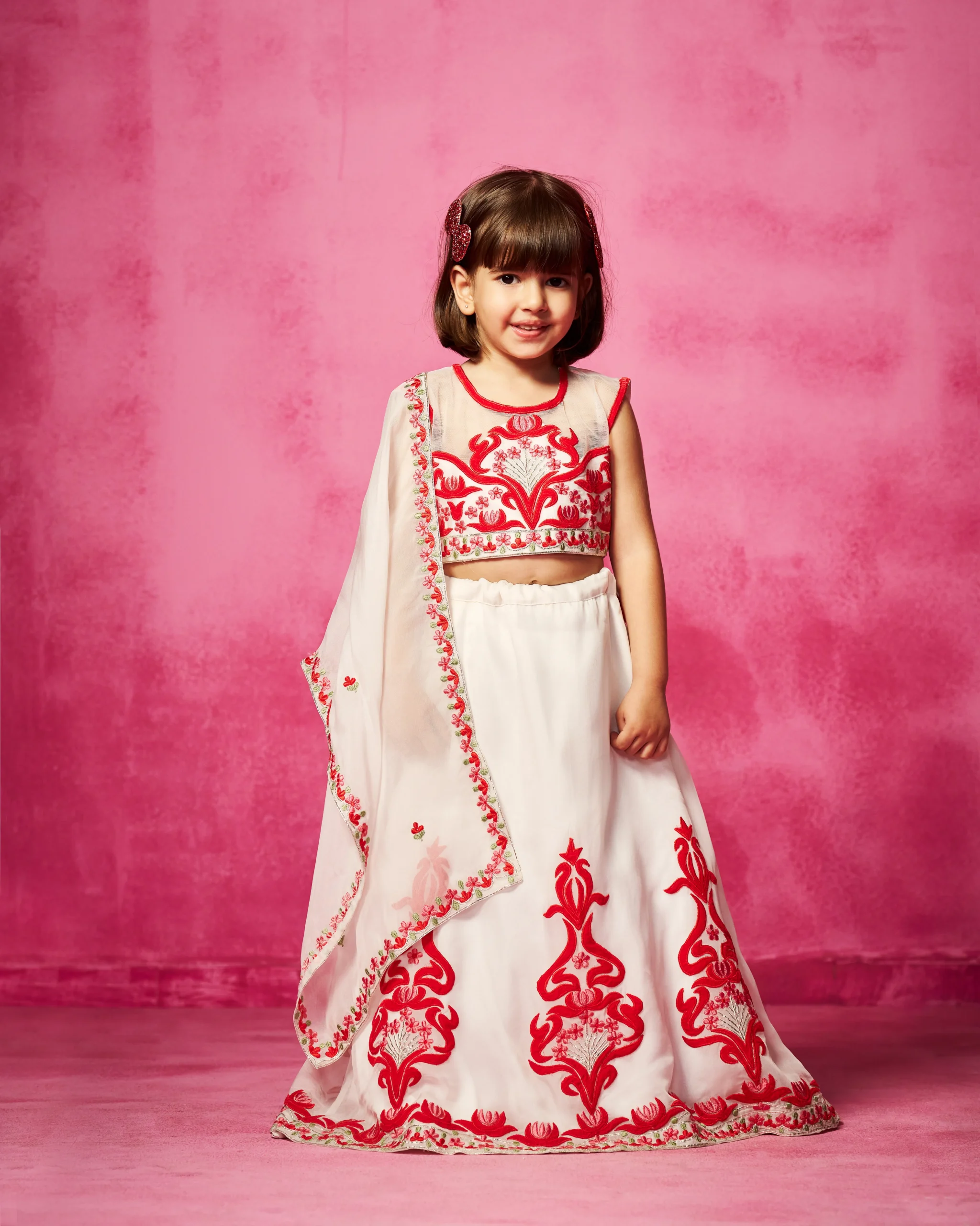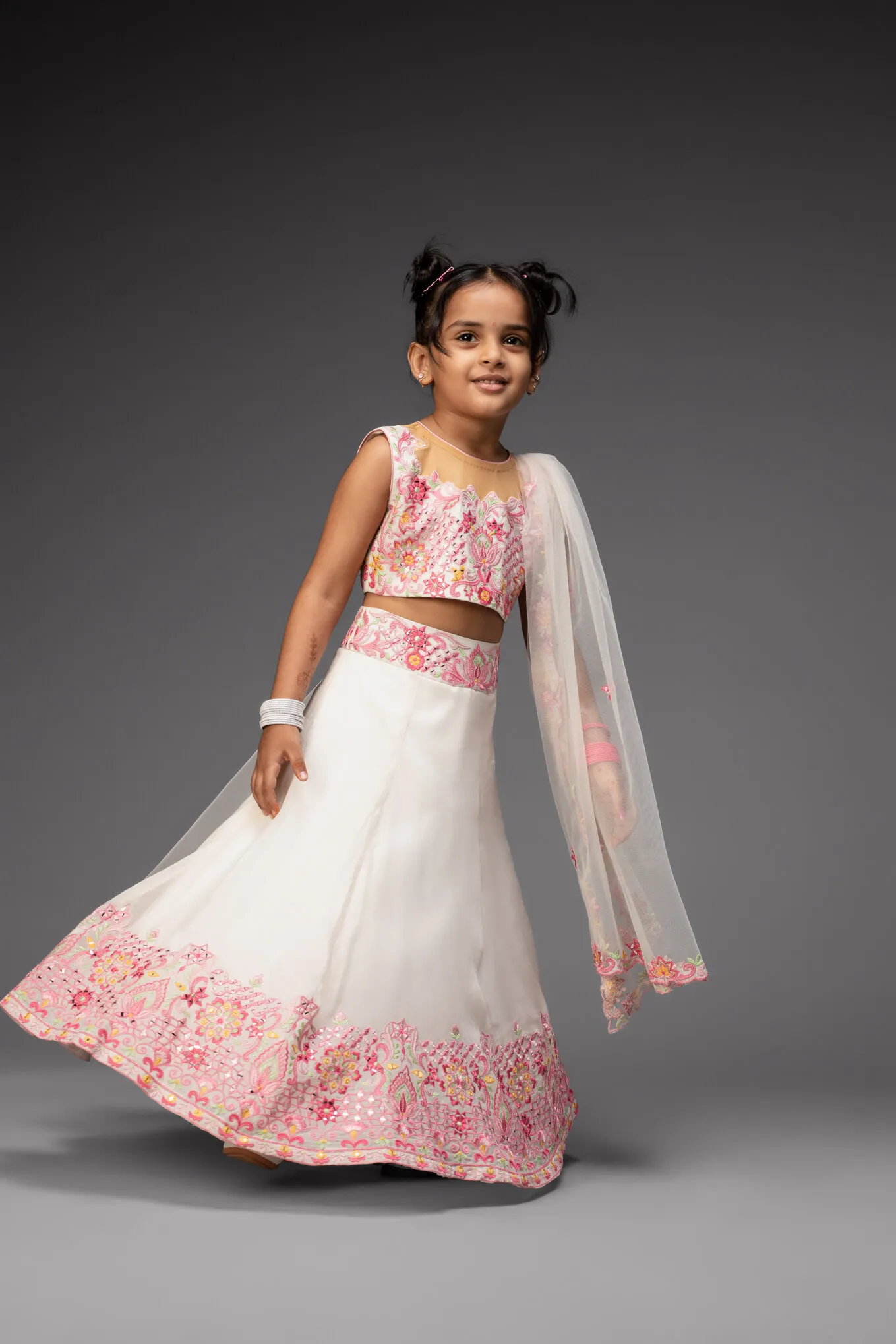 Introducing a graceful Ivory Multicolor Embroidered Organza Lehenga Choli with Net Dupatta for girls. Crafted in lightweight organza, it features vibrant thread and mirror embroidery on the belt and hemline. Perfect for weddings, festive celebrations, and special occasions with a delicate ethnic charm.