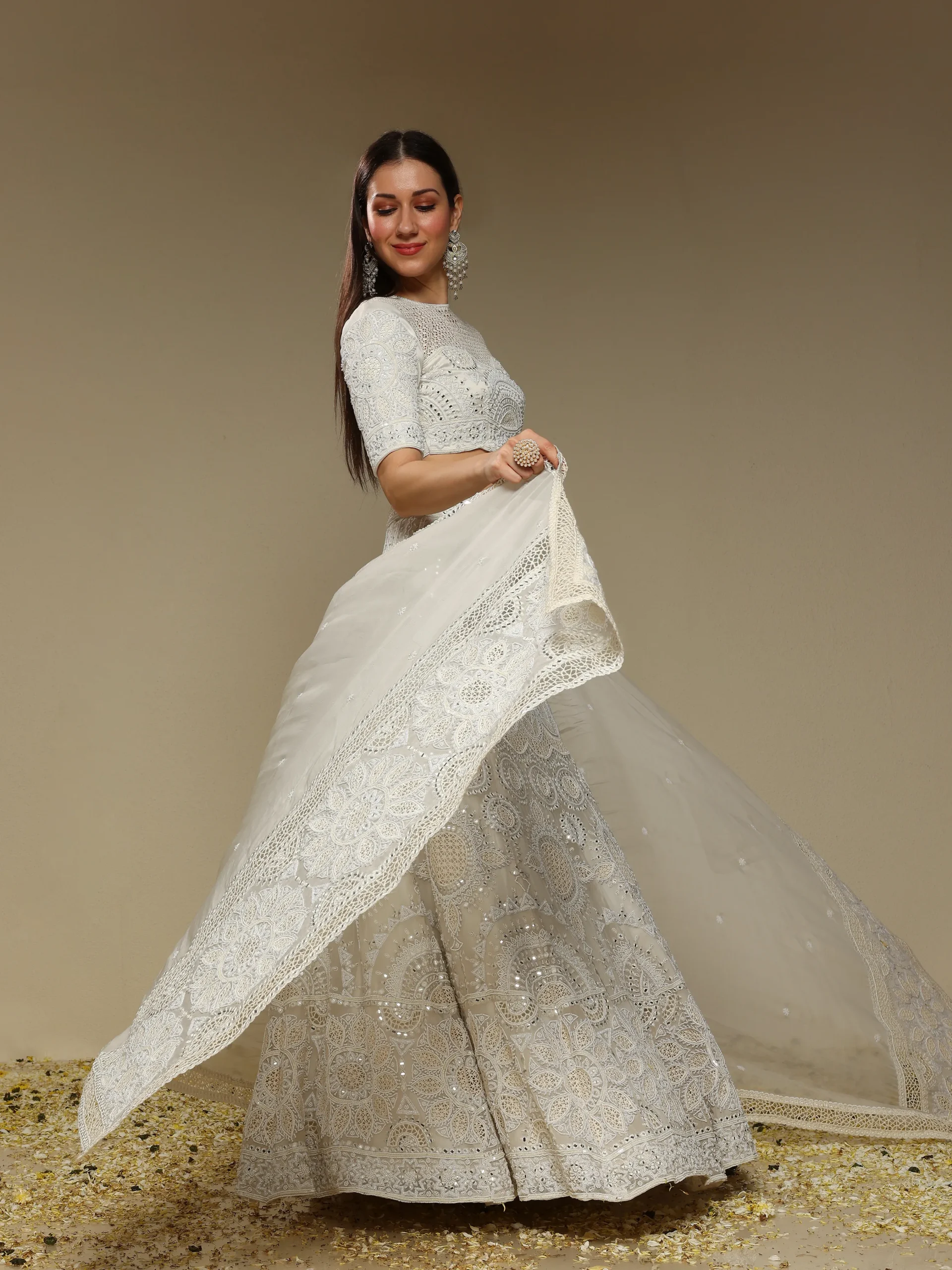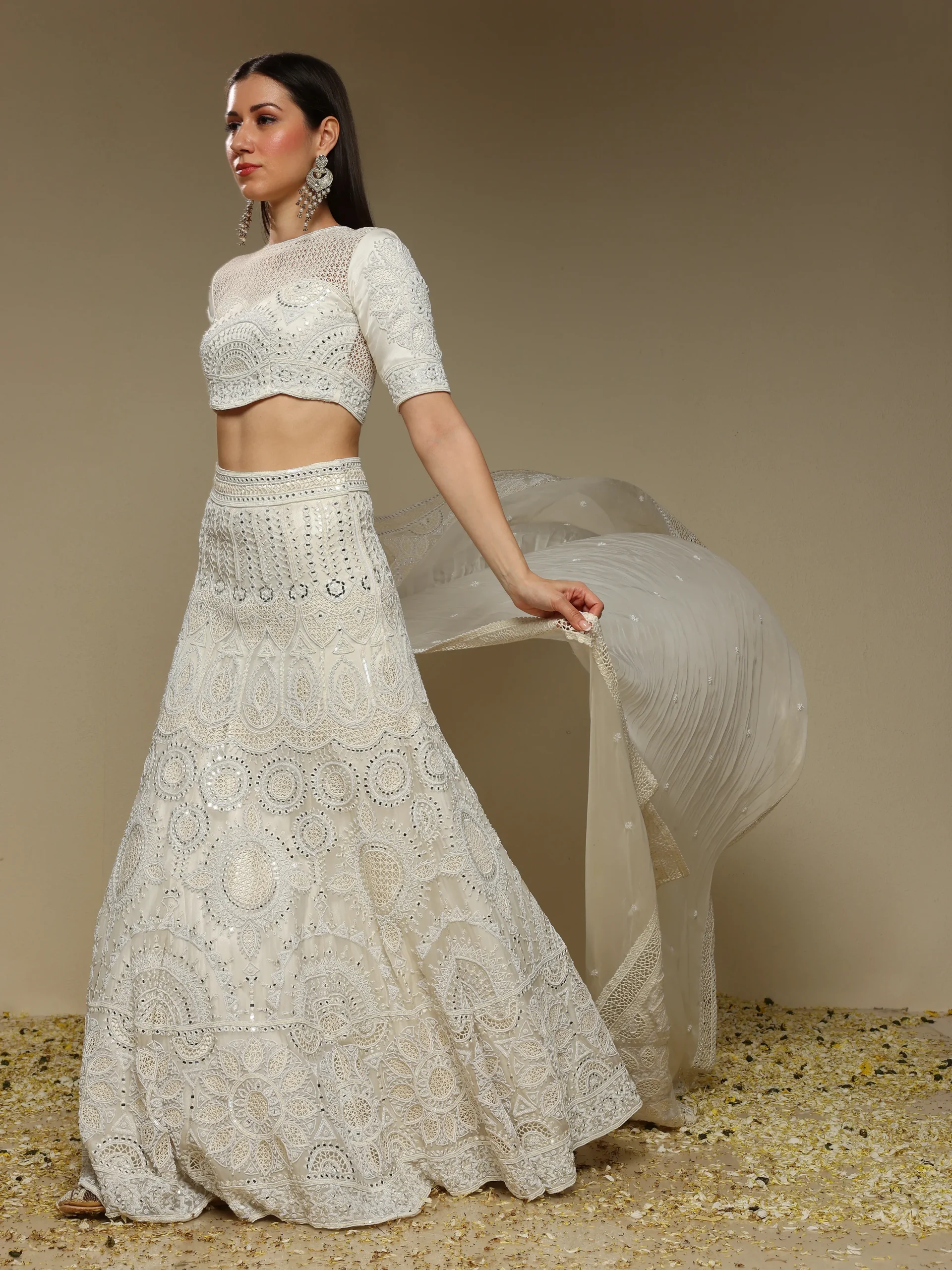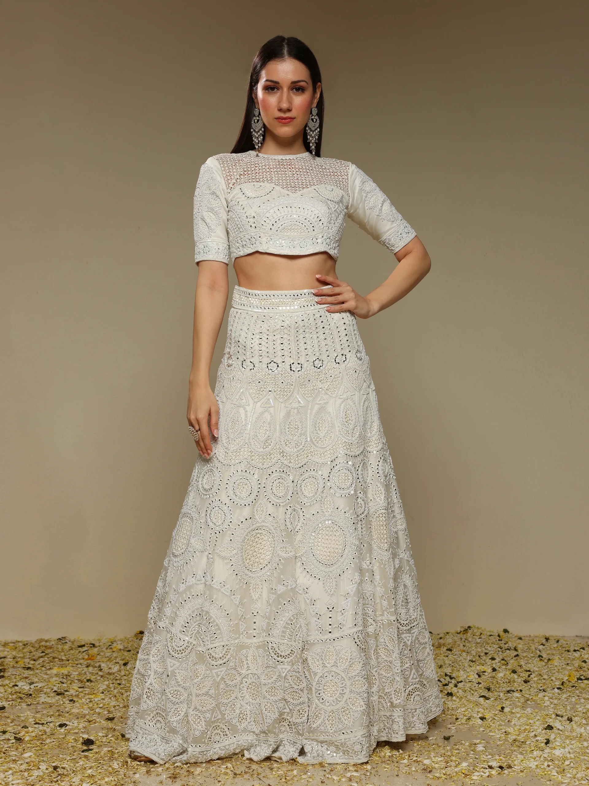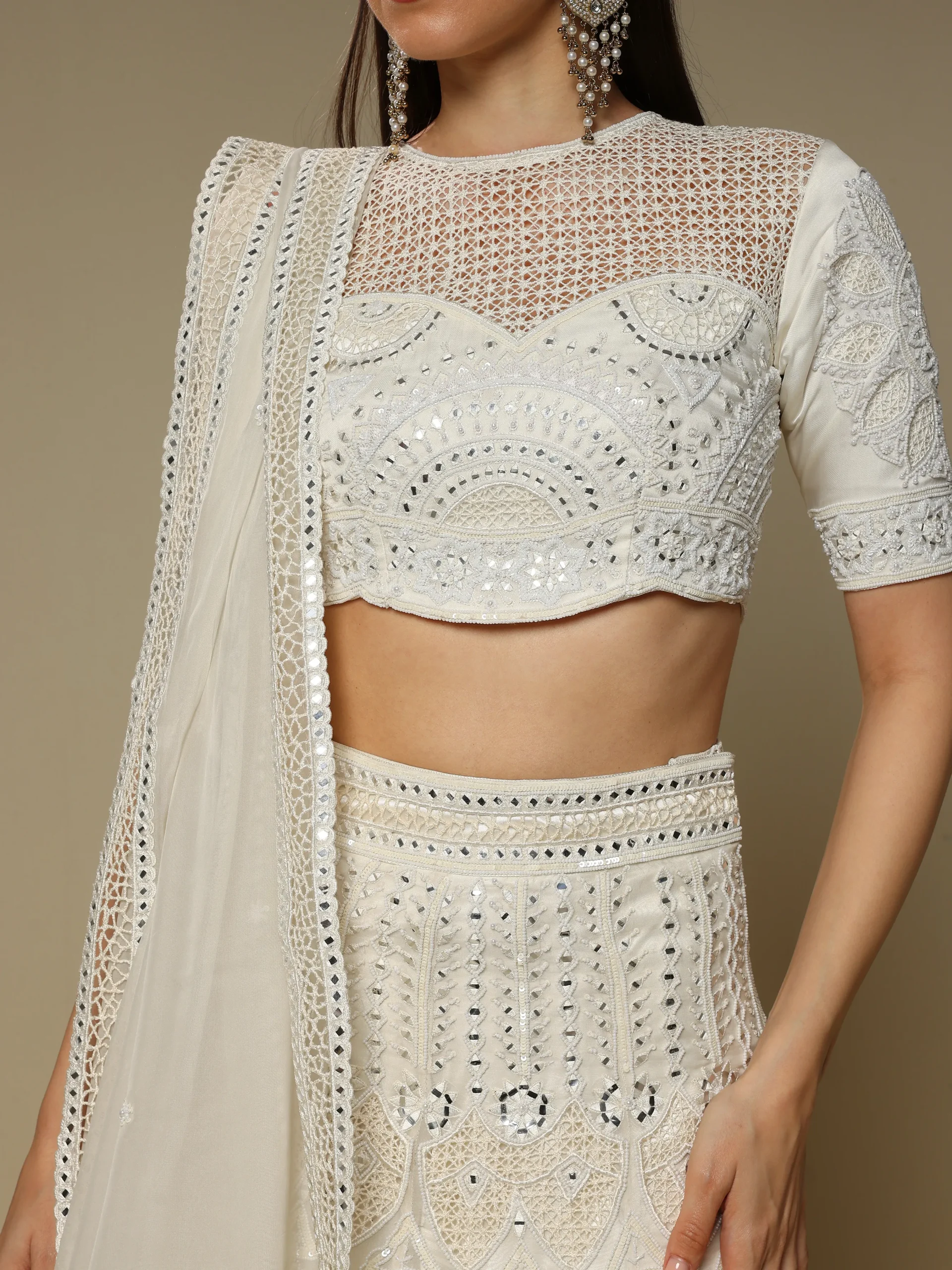 Ivory Embroidered Lehenga Set with Organza Dupatta High Neck Elbow Sleeve