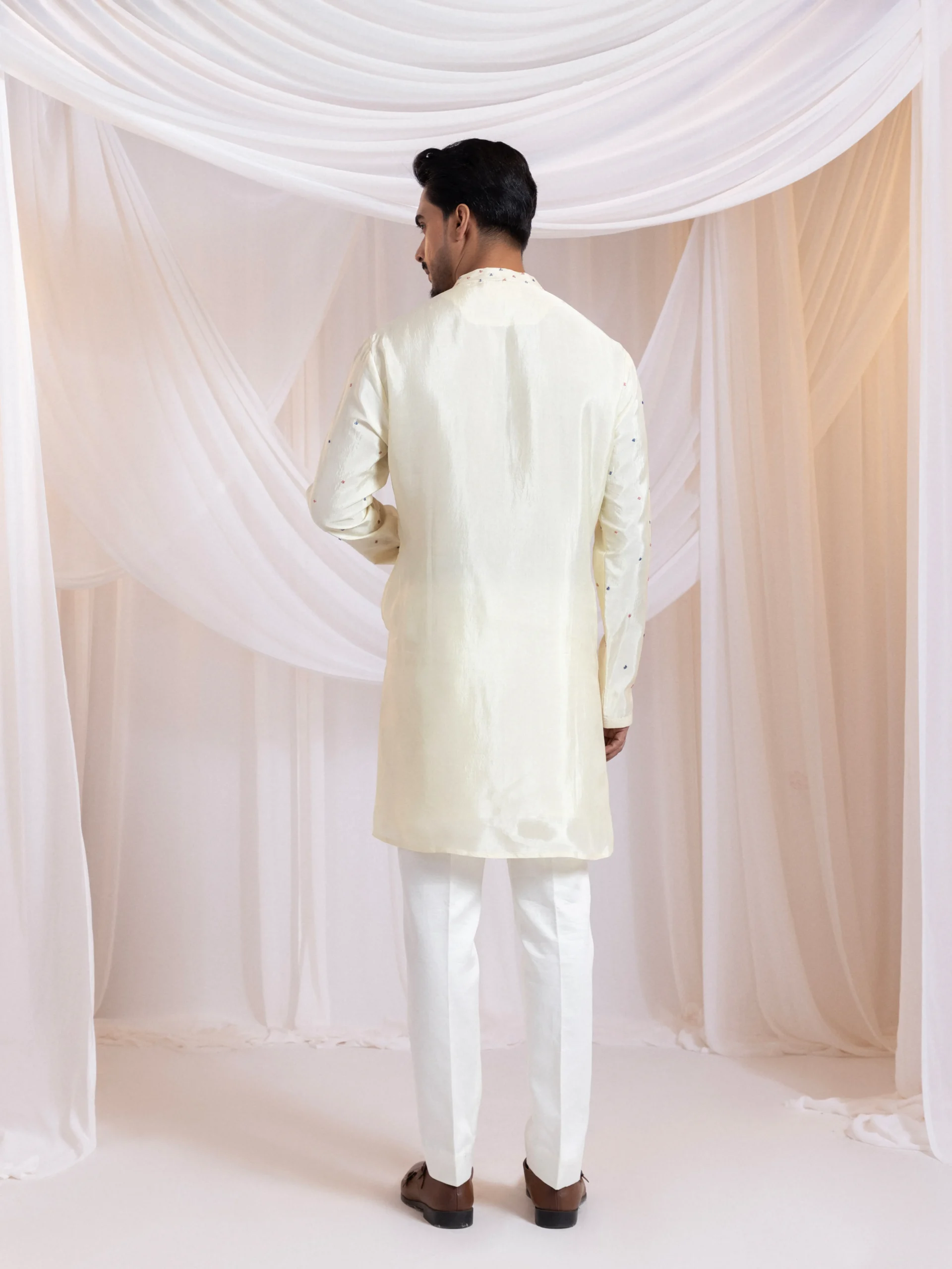 Introducing a minimal ivory kurta set delicately adorned with fine blue and pink French knot embroidery, evenly scattered across the surface for a refined yet playful touch. Subtle in design yet rich in detail, this ensemble offers effortless elegance—perfect for light Indian occasions, cocktail evenings, after-parties, and celebratory gatherings.